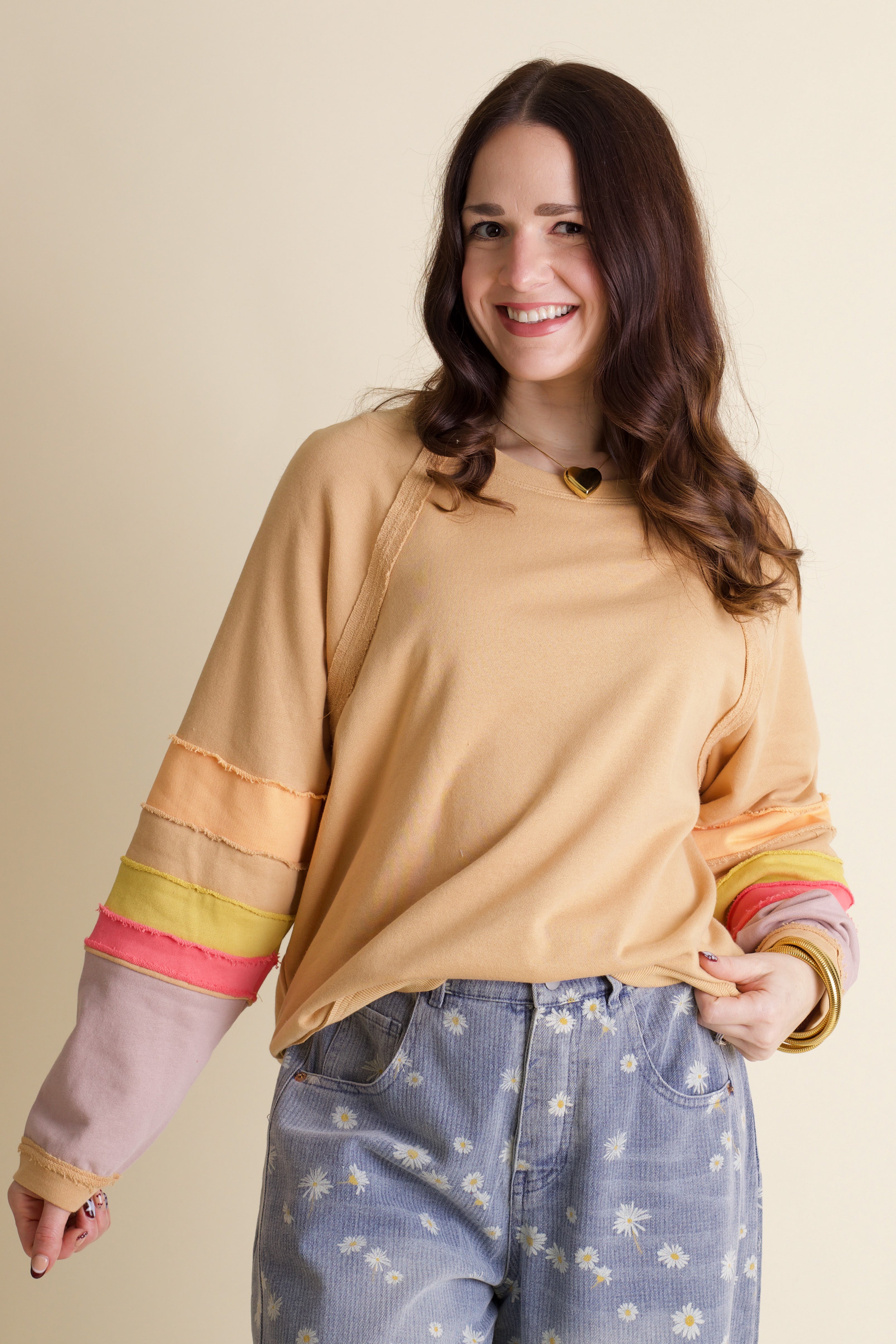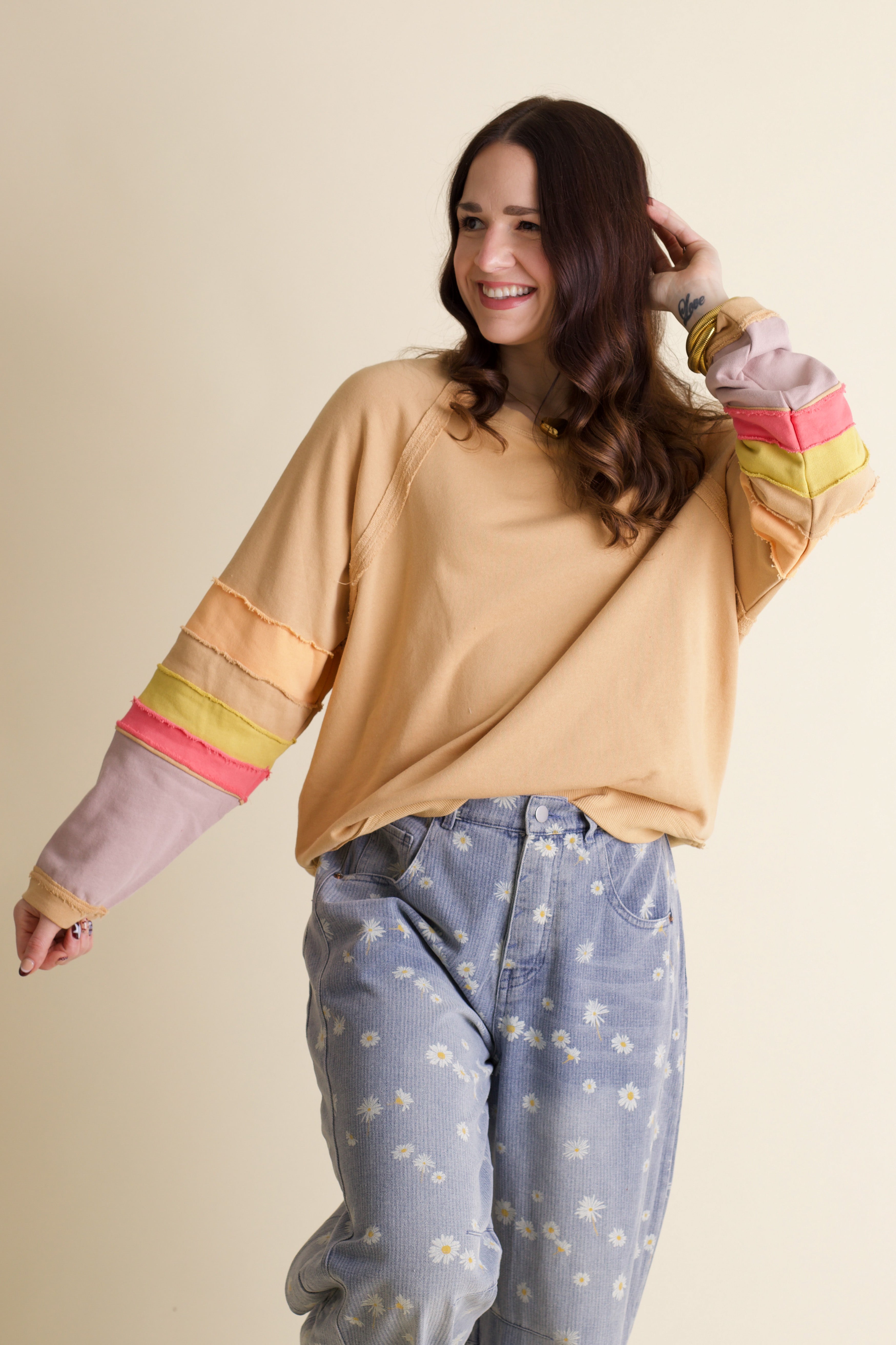 Stay cozy and stylish in this Full Of Energy Loose Fit Pullover. Featuring mineral-washed terry knit fabric, colorblocked sleeves, and edgy raw seam details, it offers a relaxed fit that’s perfect for playful days and laid-back vibes. Limited stock and available in size small through large!