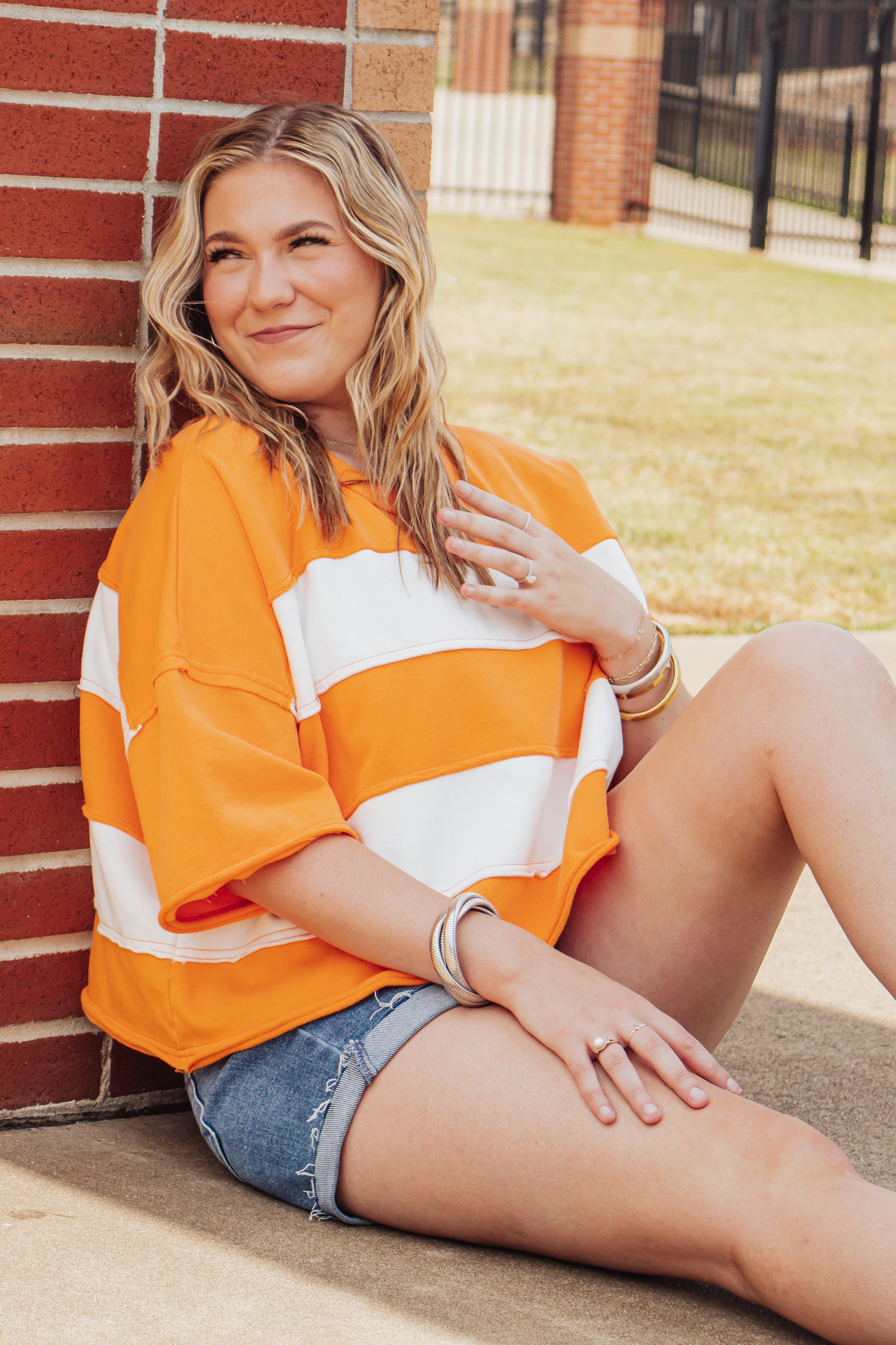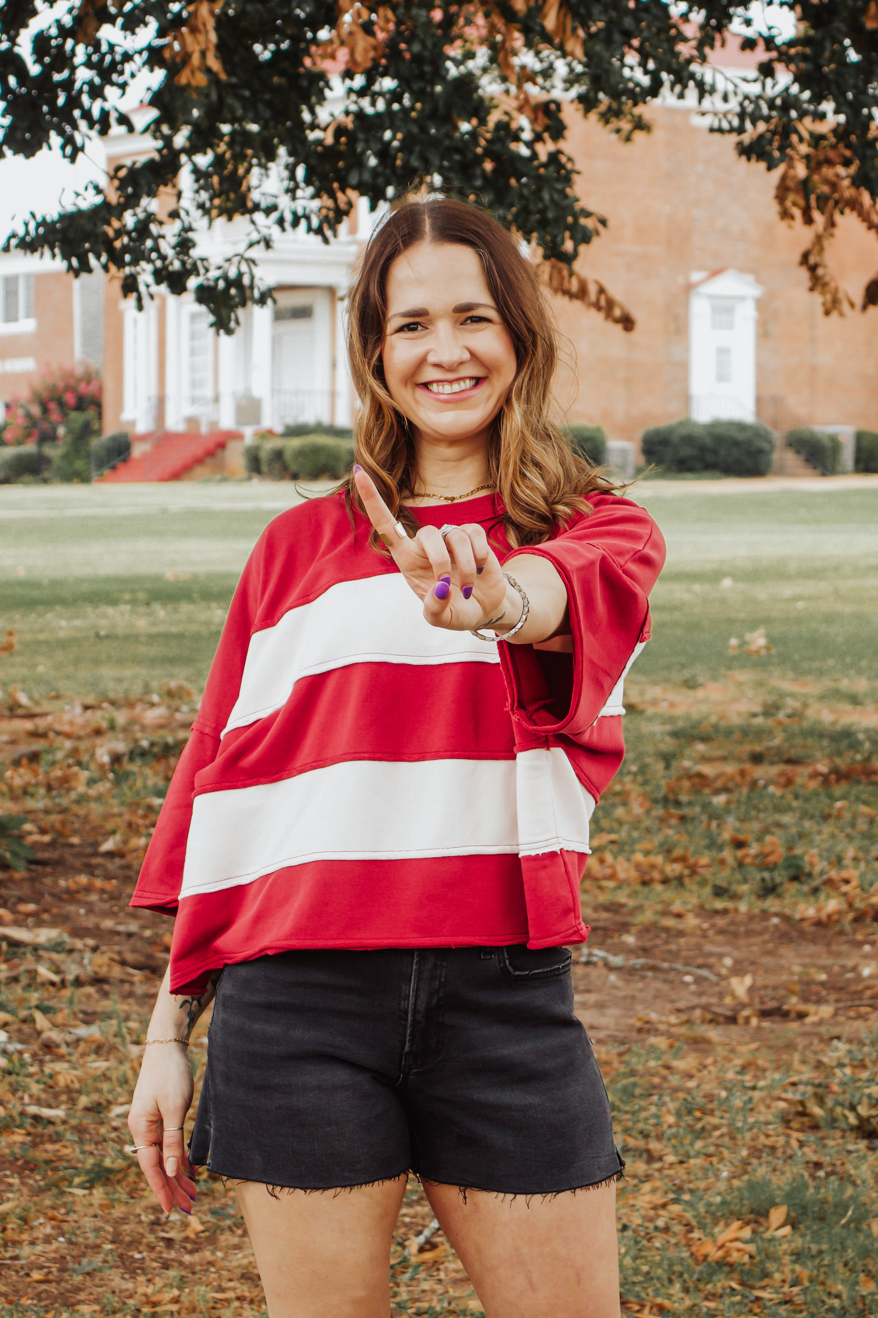 Score big style points with our Casual Saturday Color Block Top! This striped top features raw edge seams, dolman sleeves, and a slightly cropped style for a relaxed fit. The perfect addition to your game day wardrobe, with its fun colors and playful design. Available in 3 color options and sizes small through large!