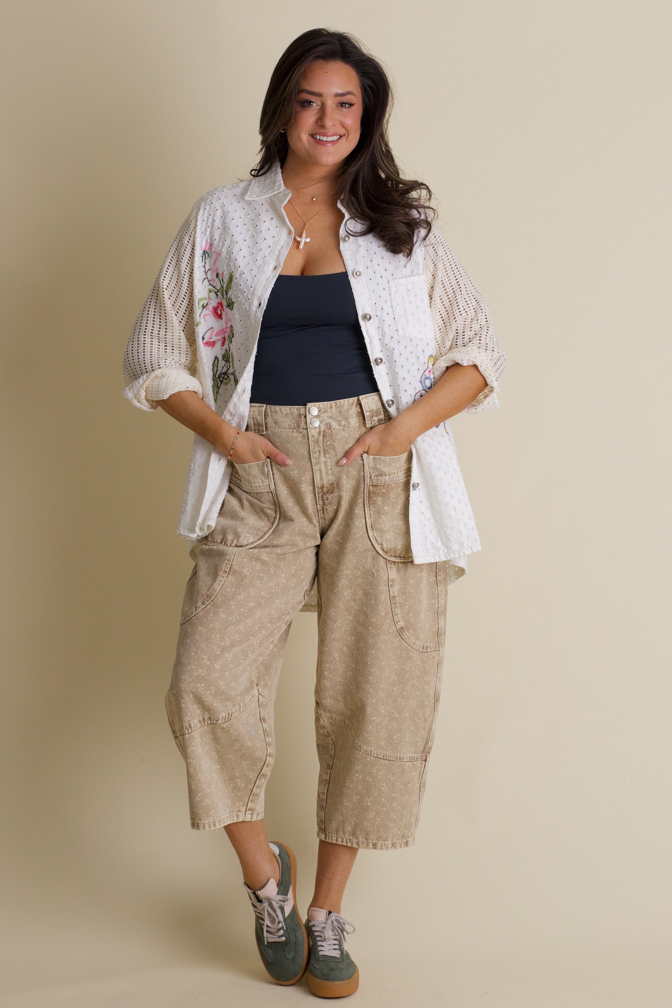 Meet your new go-to pair! These barrel leg pants blend comfort and style in a lightweight, washed denim that's oh-so-easy to love. The warm latte brown shade pairs beautifully with everything in your closet, while the relaxed barrel silhouette keeps things breezy and laid-back. Oversized pockets mean you've got room for all your must-haves, and the charming floral print adds just the right amount of personality. Perfect for casual days when you want to look put-together without trying too hard.