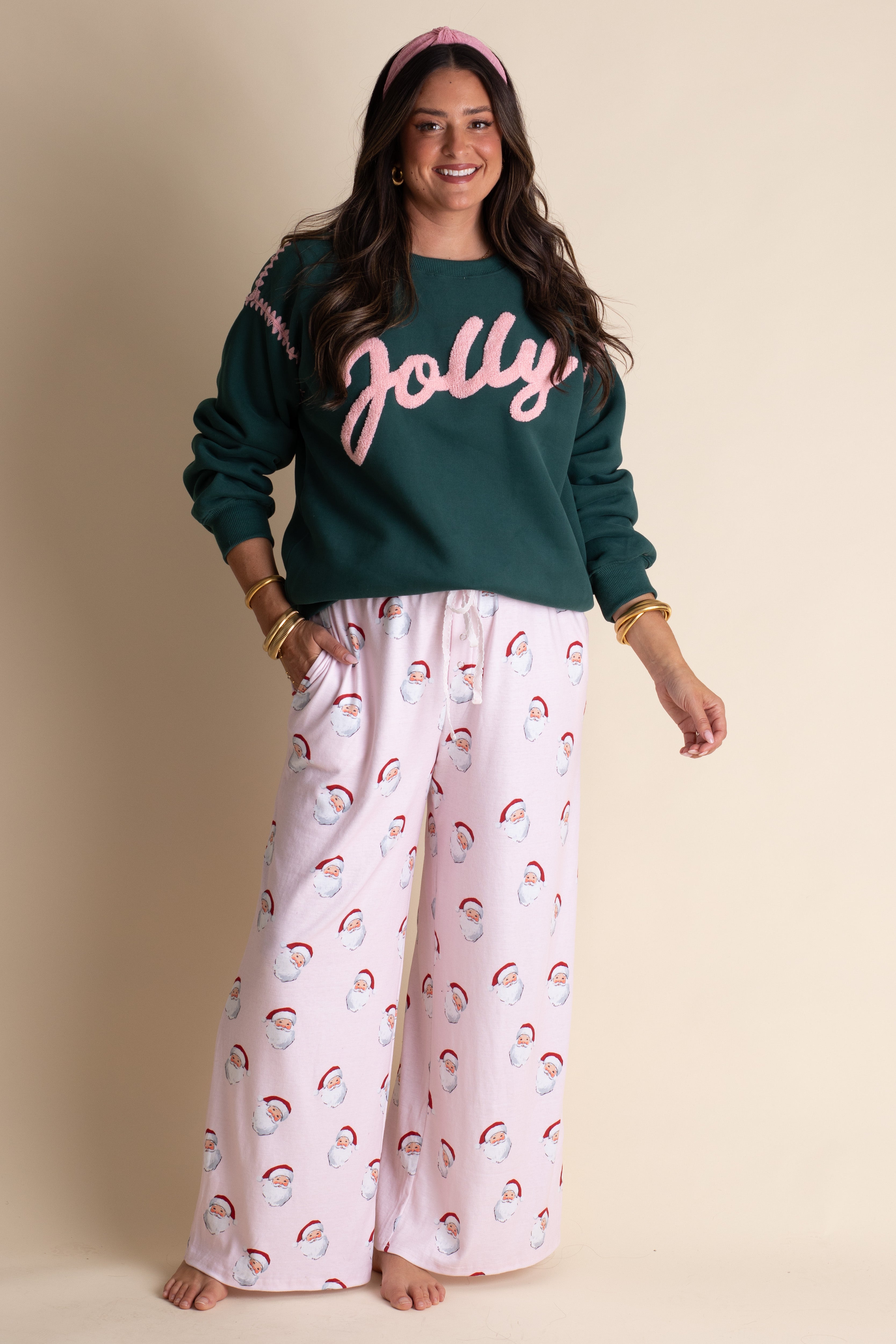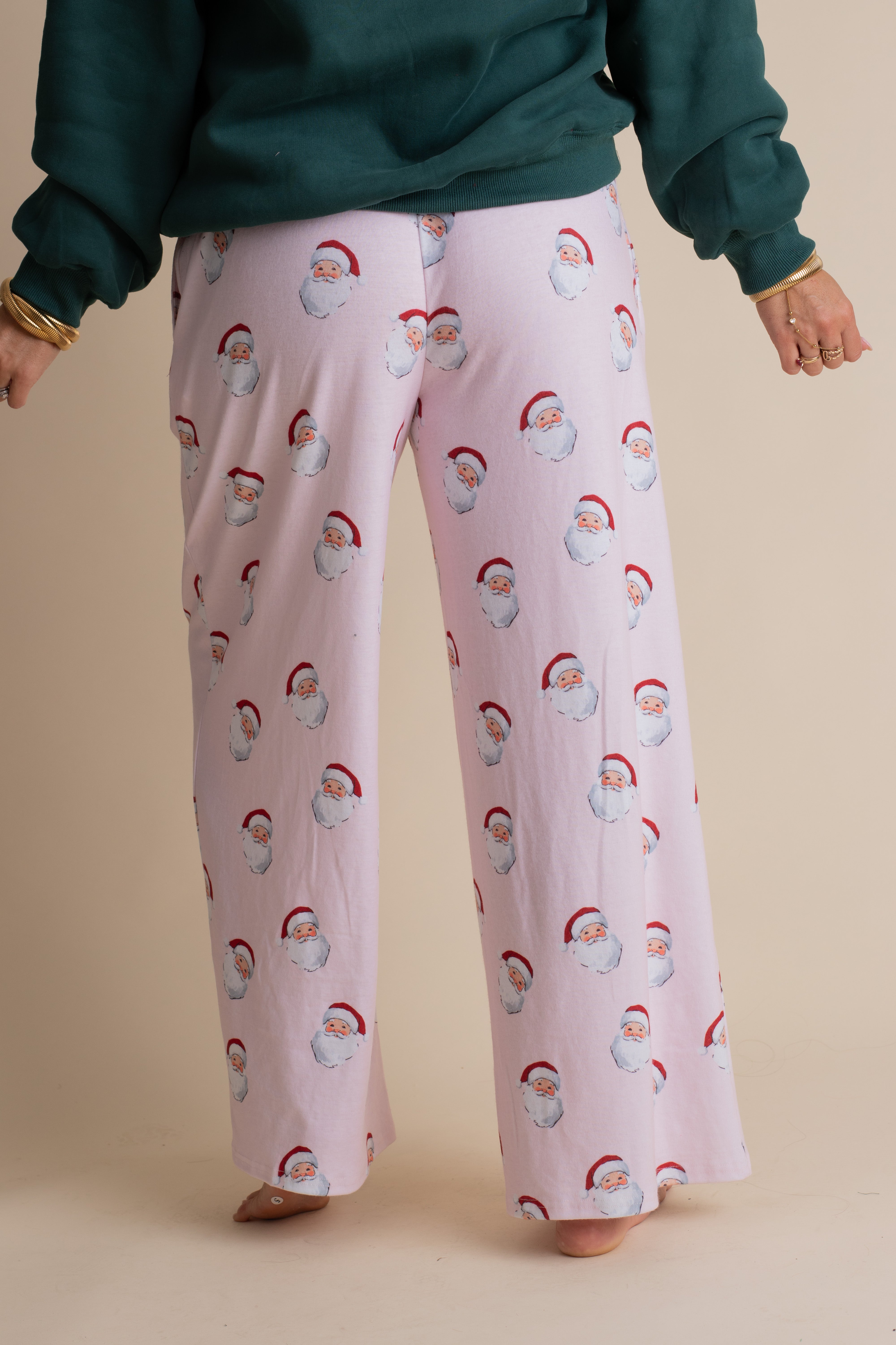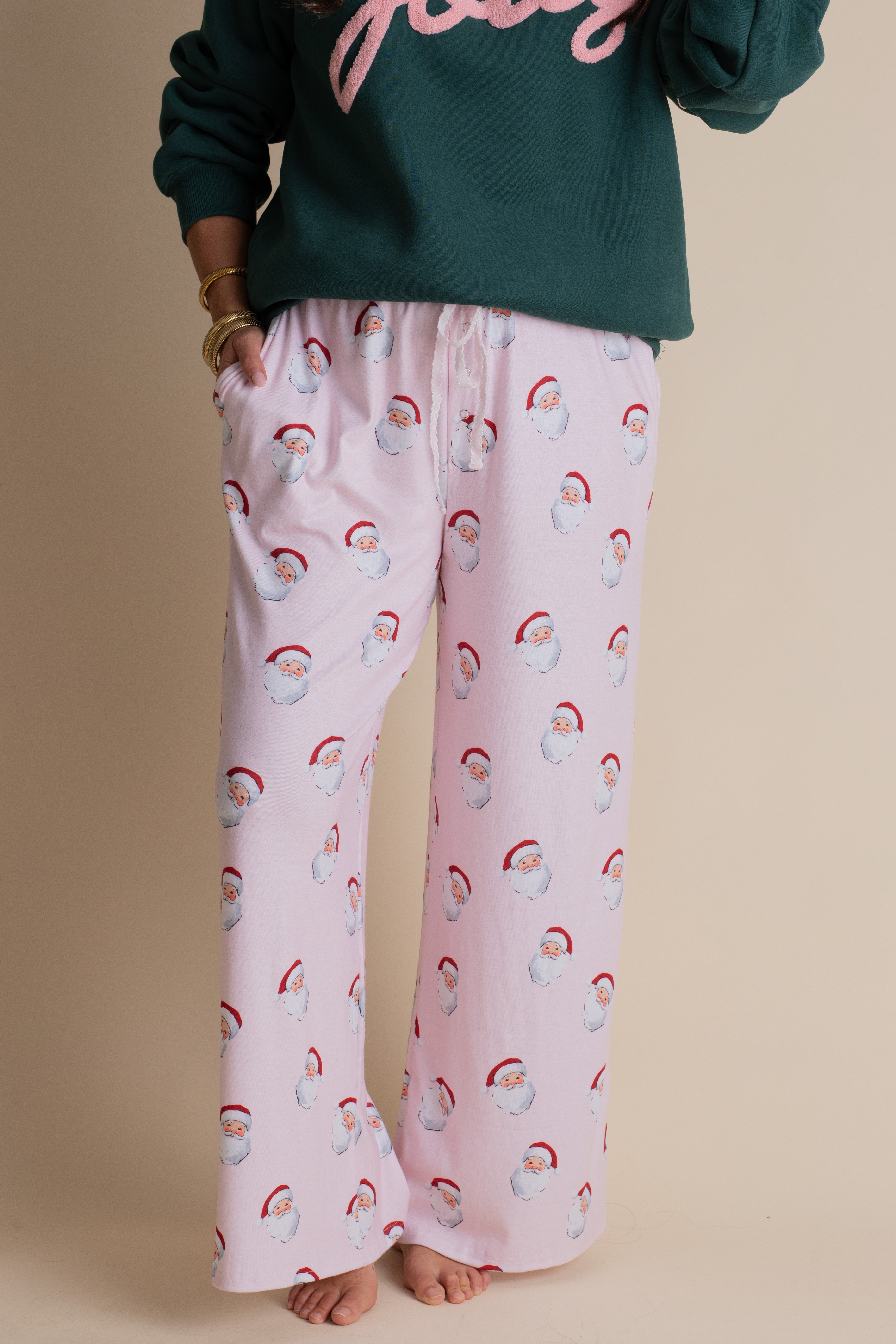 These light pink pajama pants bring holiday cheer with a playful Santa print. Designed with a high elastic waist and a scalloped embroidered tie, they offer comfortable, adjustable support. Plus, handy pockets add a practical touch for stashing little essentials during cozy mornings or festive lounging. Perfect for spreading merry vibes at home! Limited stock and available in sizes small through large!