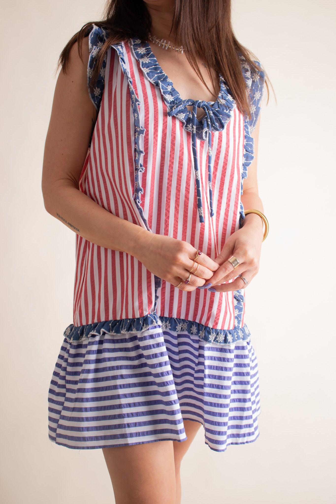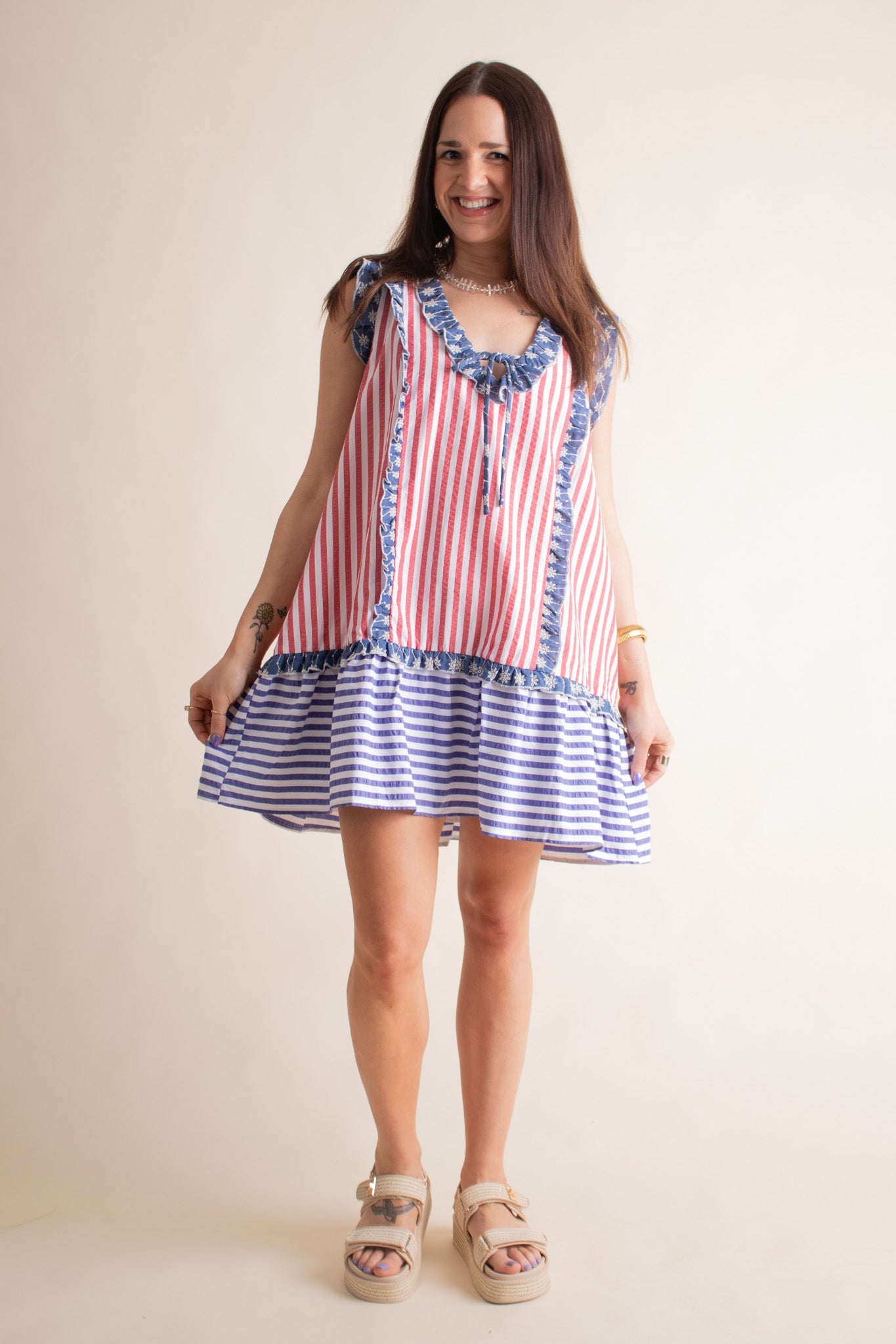Get ready to show off your patriotic spirit in this adorably playful Red White and Blue Sleeveless Dress! Featuring a charming red striped design with a navy star embroidered ruffled trim, a tied neckline, and a fun blue striped ruffled bottom. Perfect for those sunny days full of laughter and fun! Limited stock and available in sizes small through large!