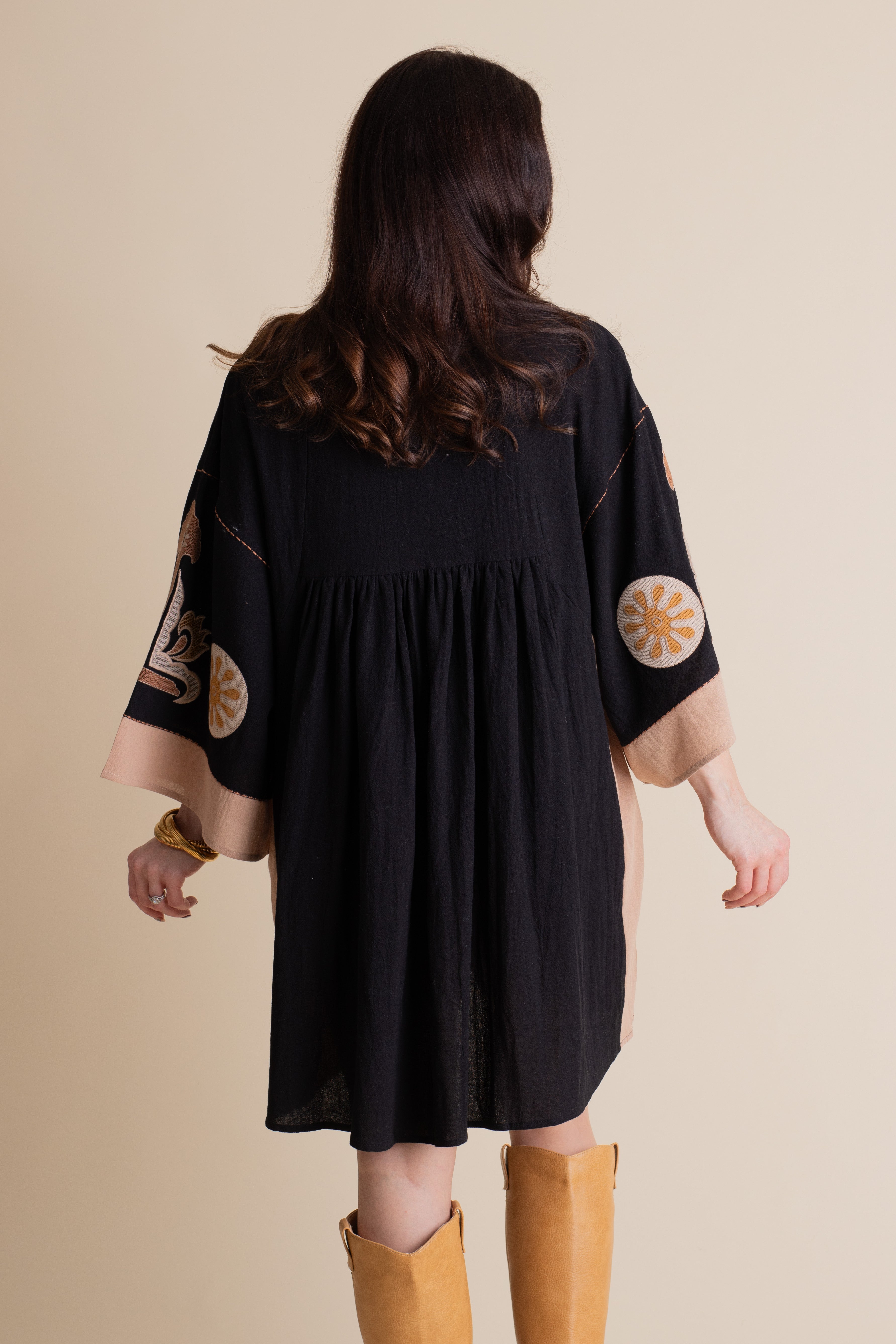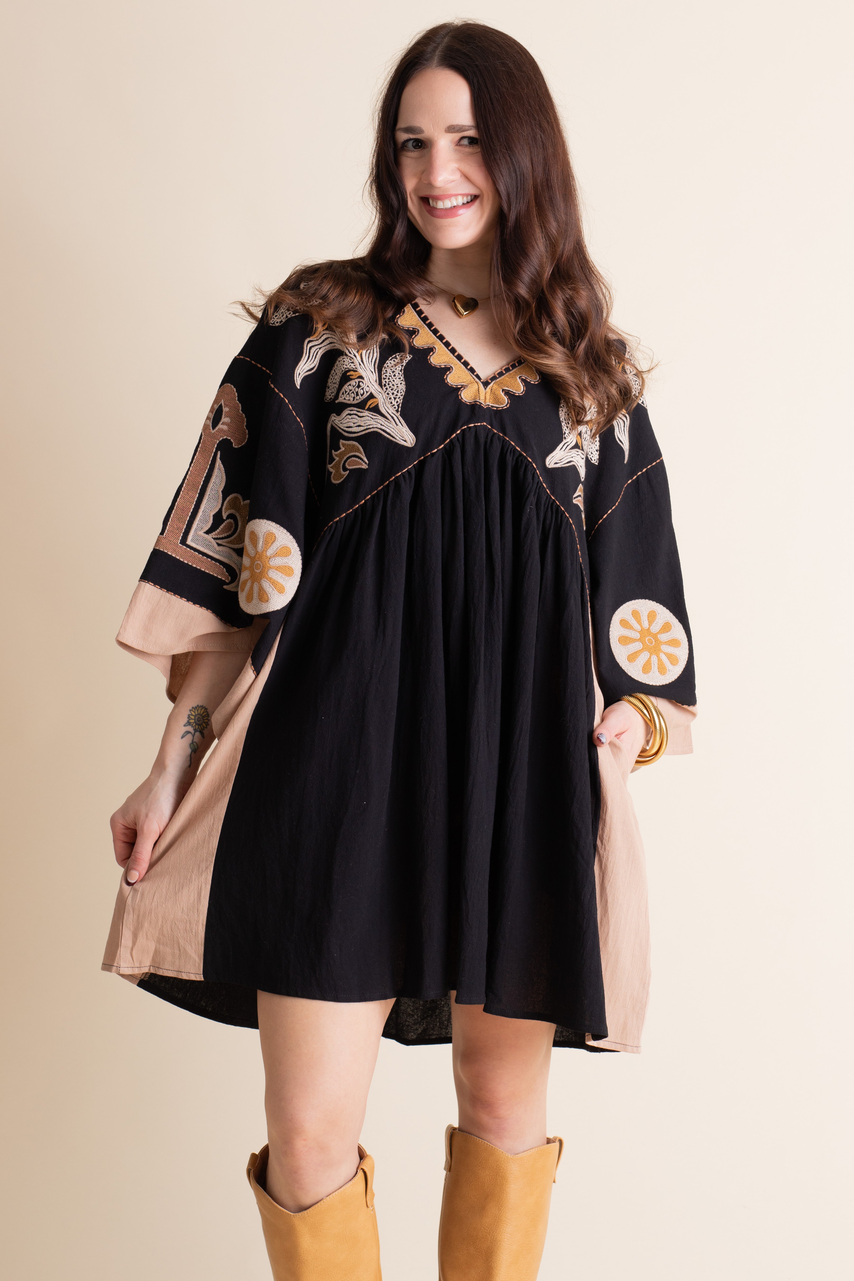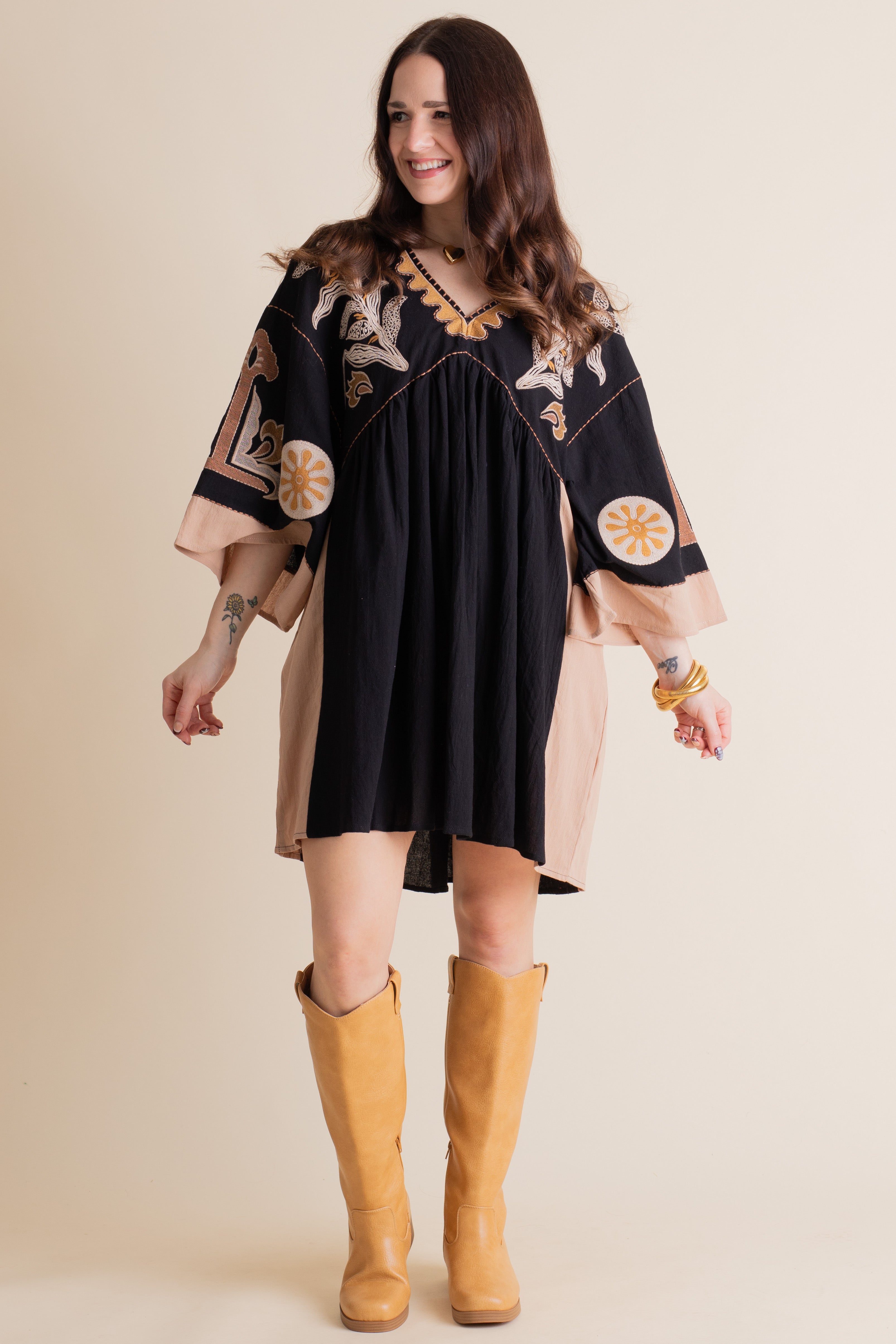 This playful black and tan dress features delicate floral embroidery and stylish color blocking for a fresh, eye-catching look. With a flattering V-neckline, breezy kimono sleeves, and handy pockets, it combines comfort and charm effortlessly. Its flowy fit makes it perfect for twirling through your day with ease and fun. Limited stock and available in sizes small through large!