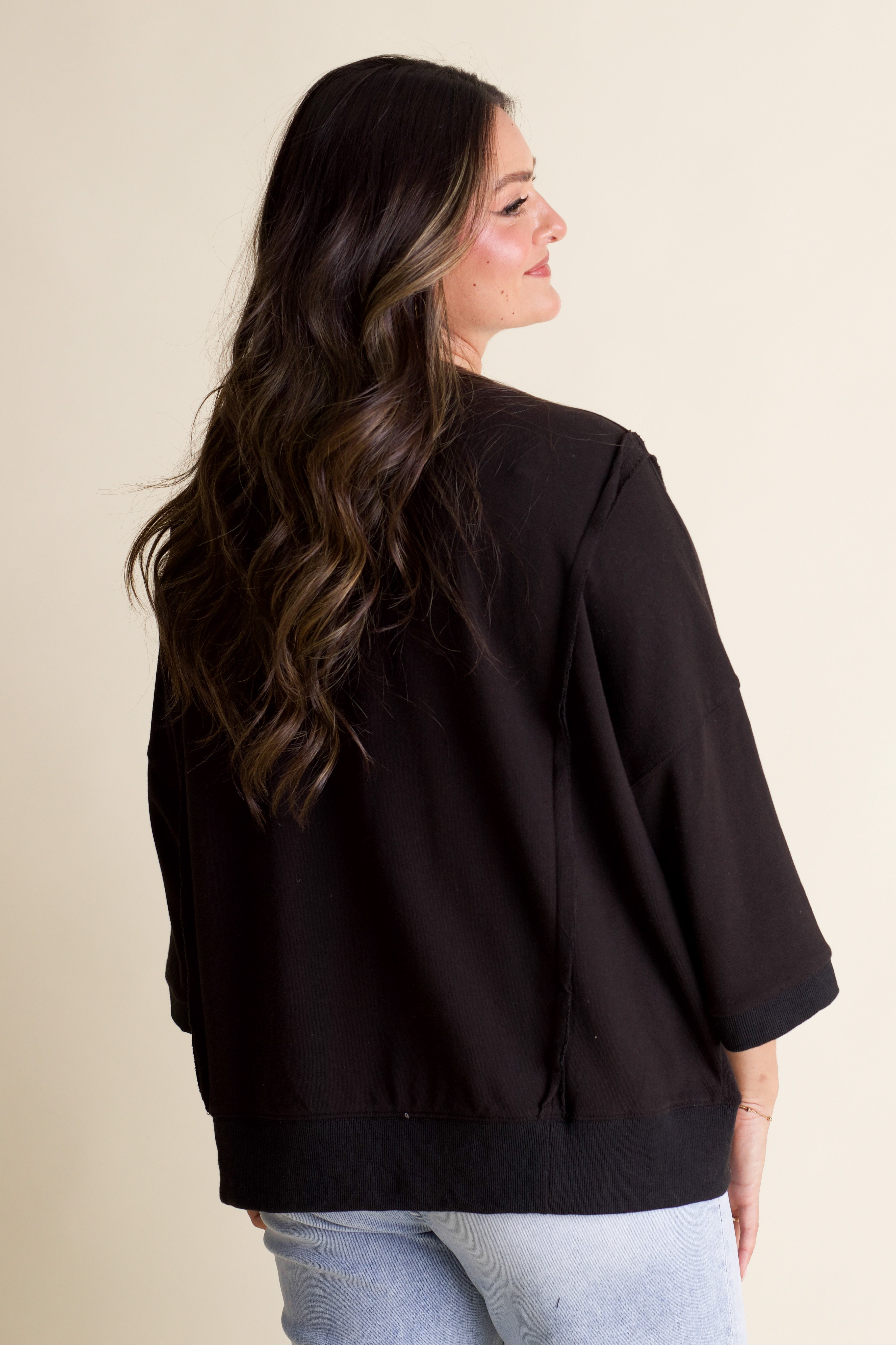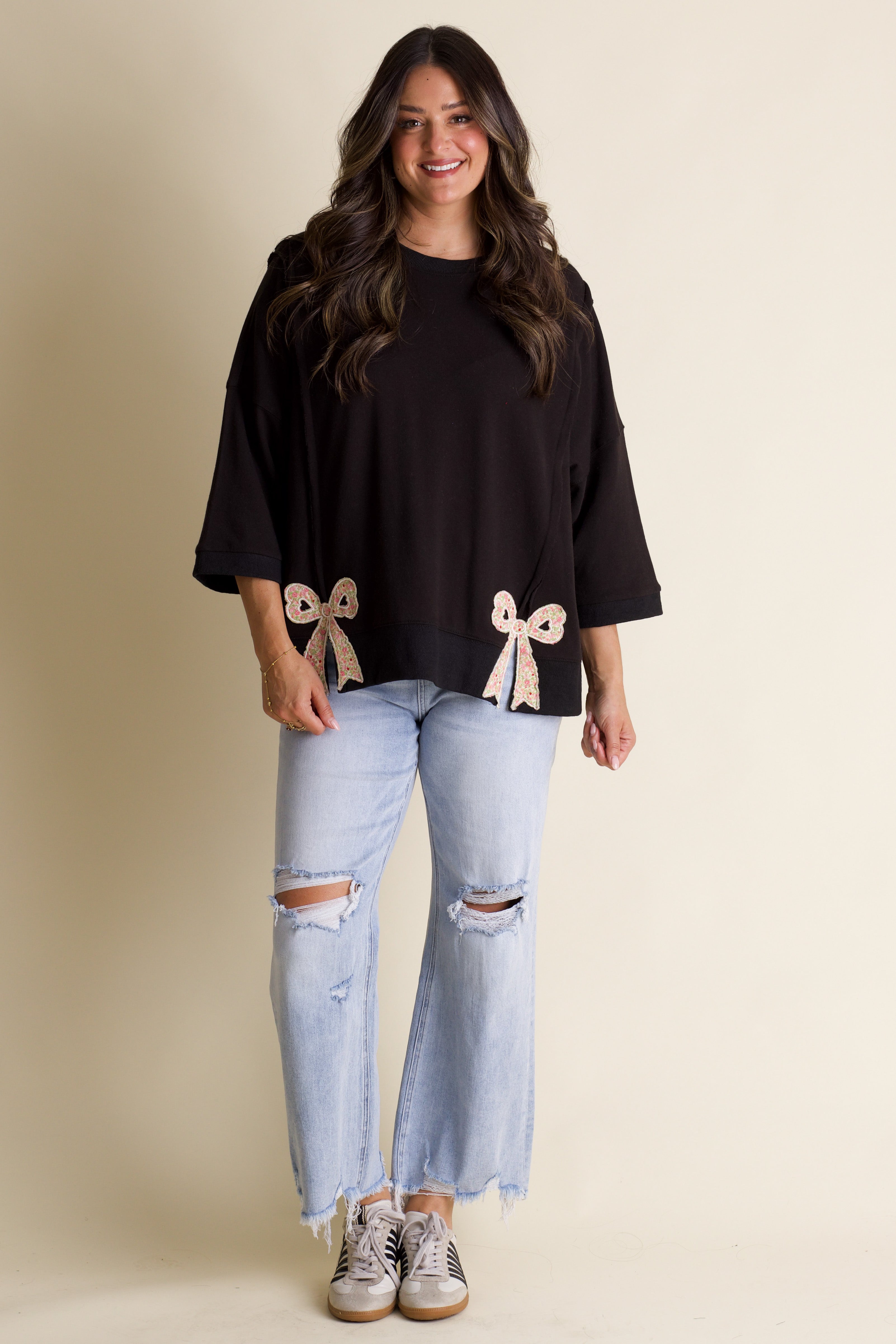 This Annie Bow Patch Bottom Top combines cozy French terry with playful floral embroidered bows for a fun, feminine twist. Its oversized dolman sleeves and side slits make it easy to move and layer, while ribbed trim and raw edge seams add a relaxed, casual vibe. Perfect for adding a touch of whimsy to your everyday wardrobe! Limited stock and available in sizes small through large!