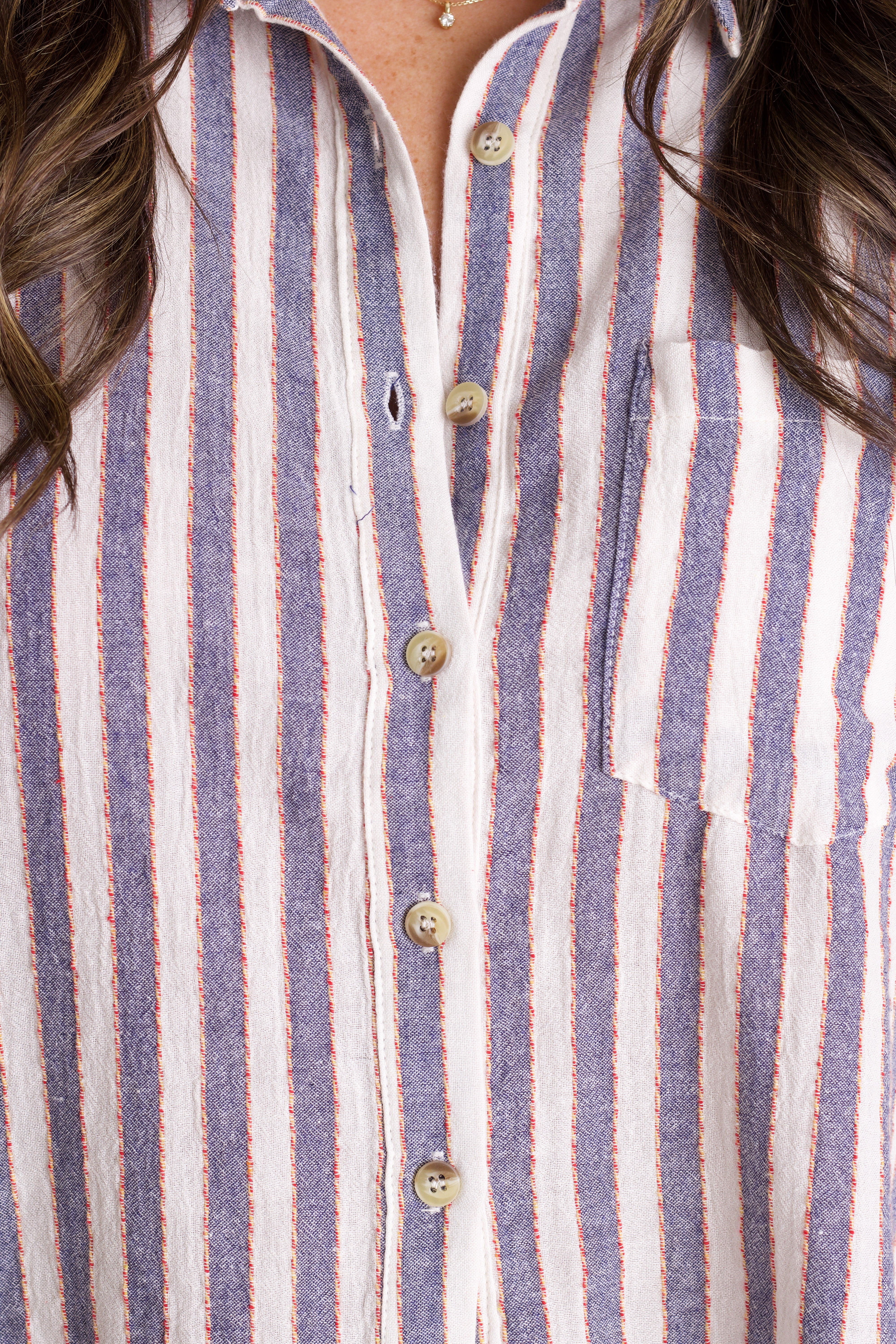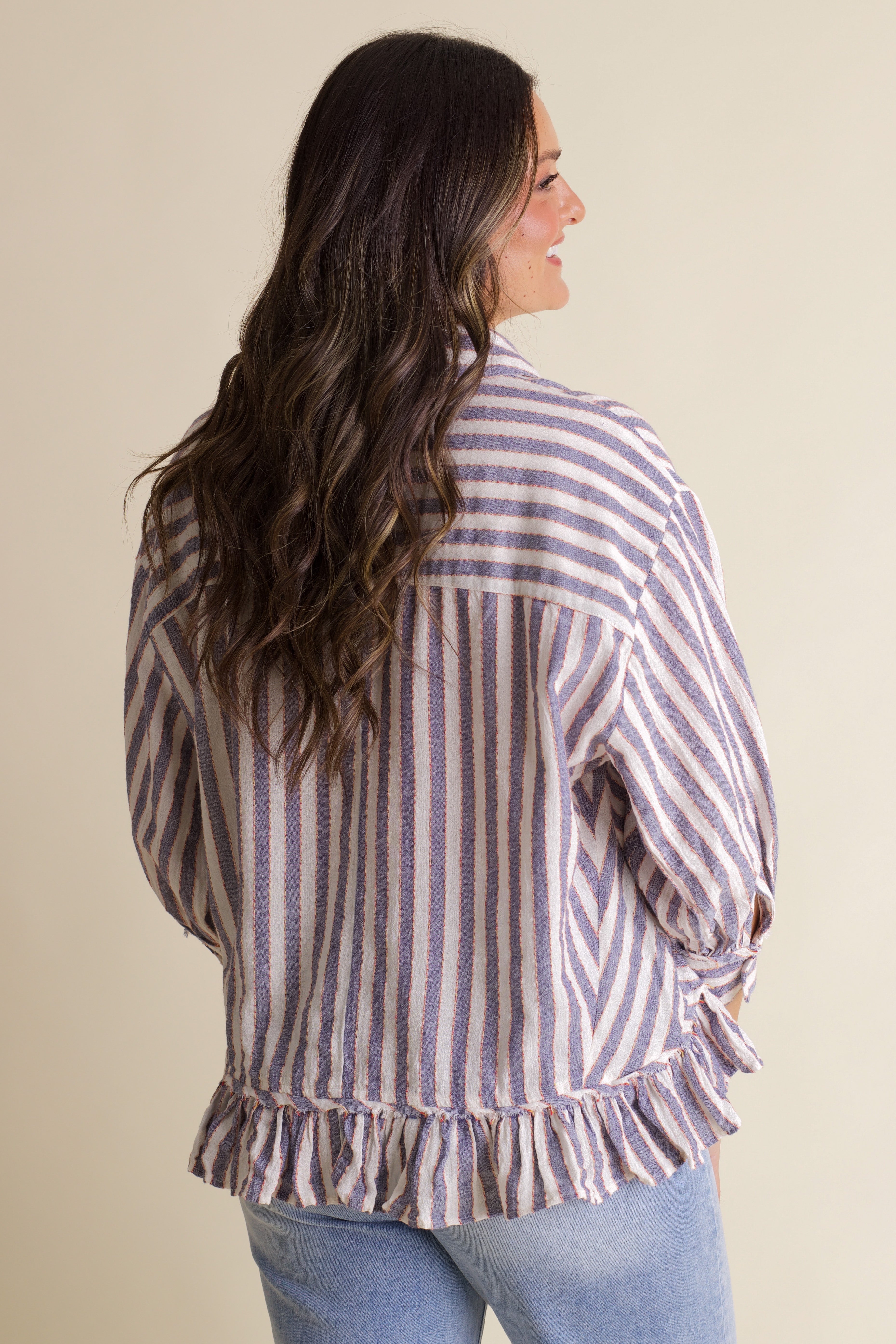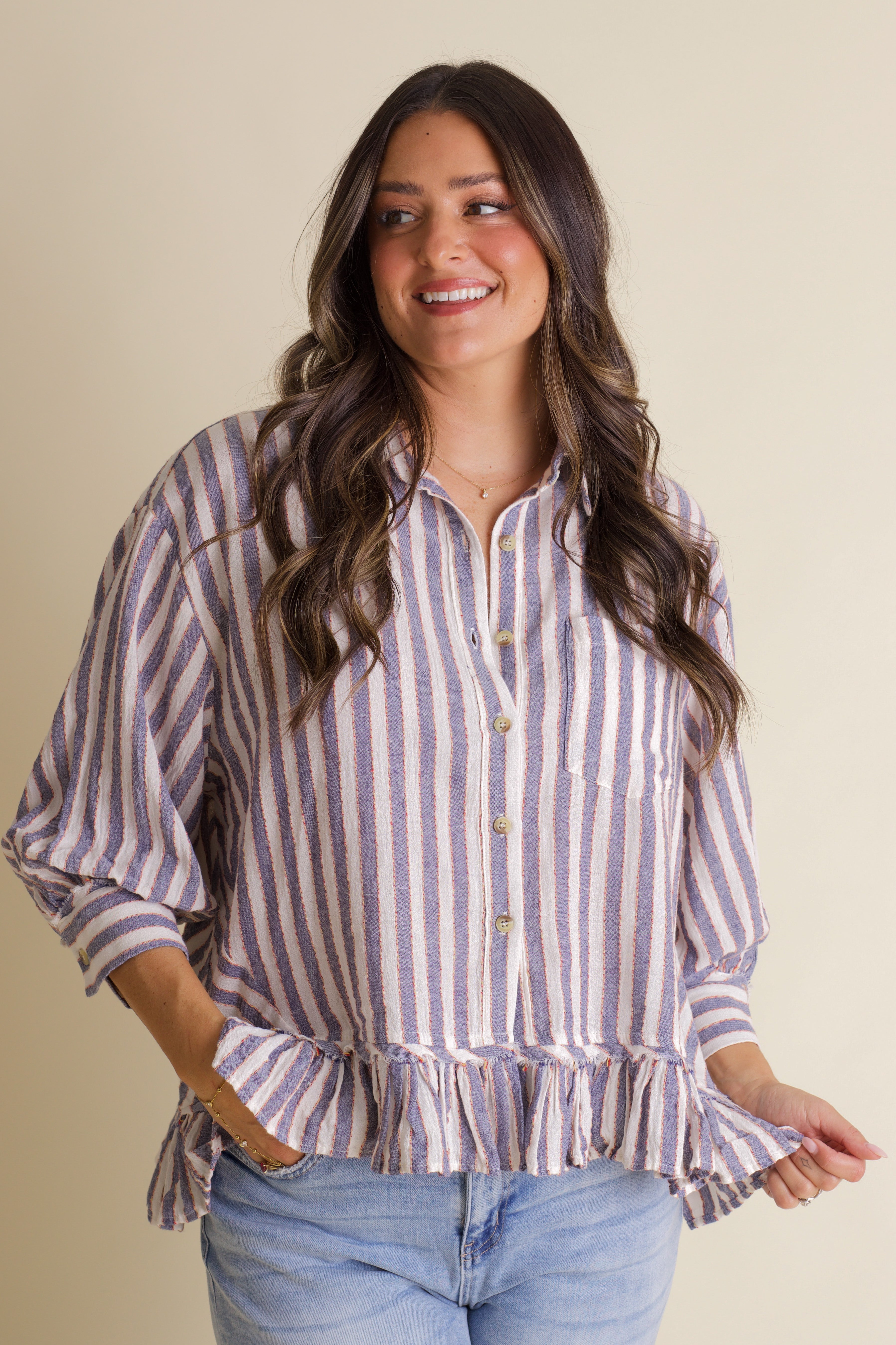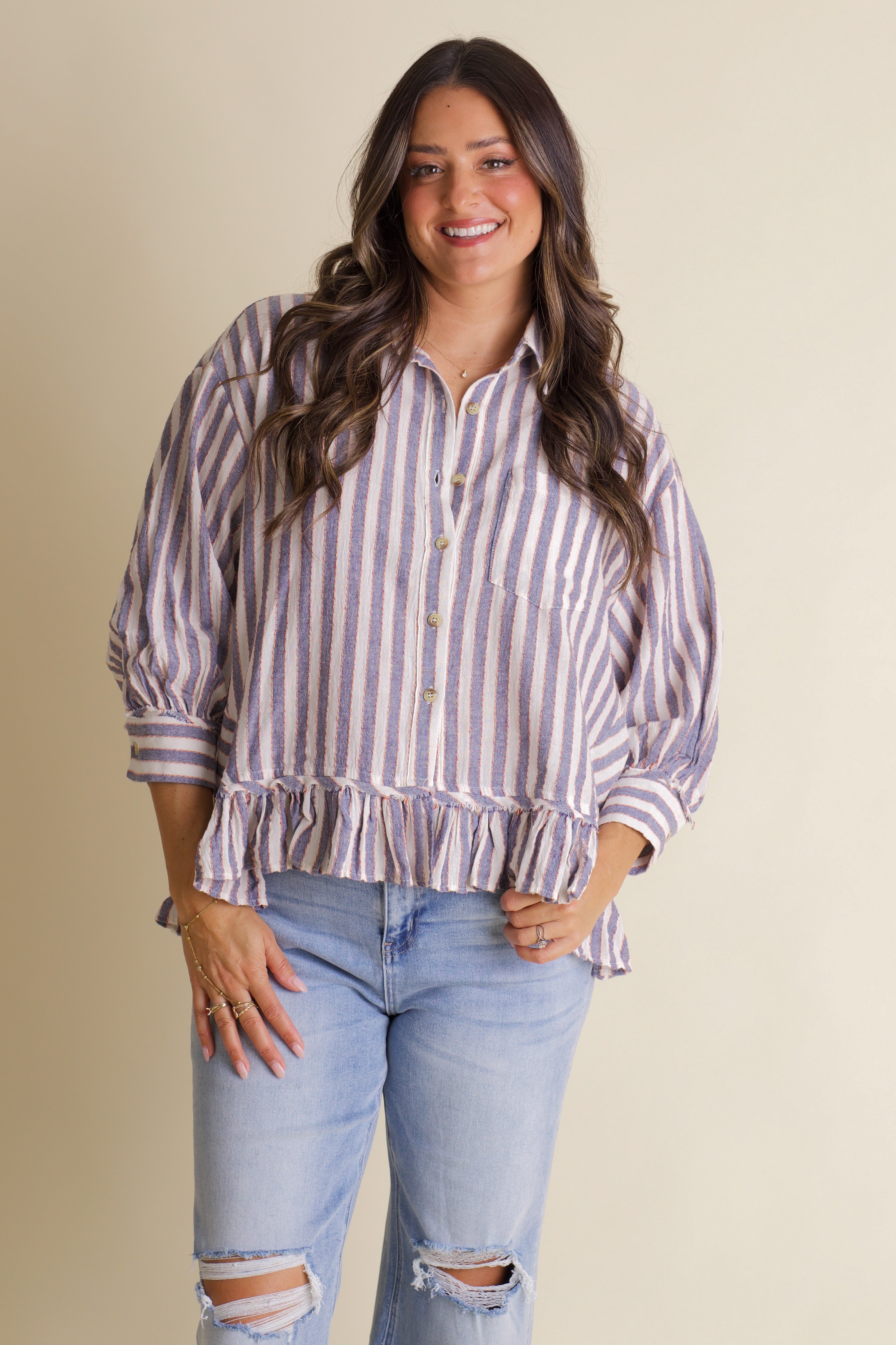 This playful striped cotton button-down is your new go-to for effortless style. With an oversized fit and dolman sleeves, it’s roomy and comfy all day long. The ruffled high-low hem adds a fun twist, while the front pocket keeps things casually cool. Perfect for layering or wearing on its own, this top brings a fresh, breezy vibe to any outfit. Limited stock and available in sizes small through large!