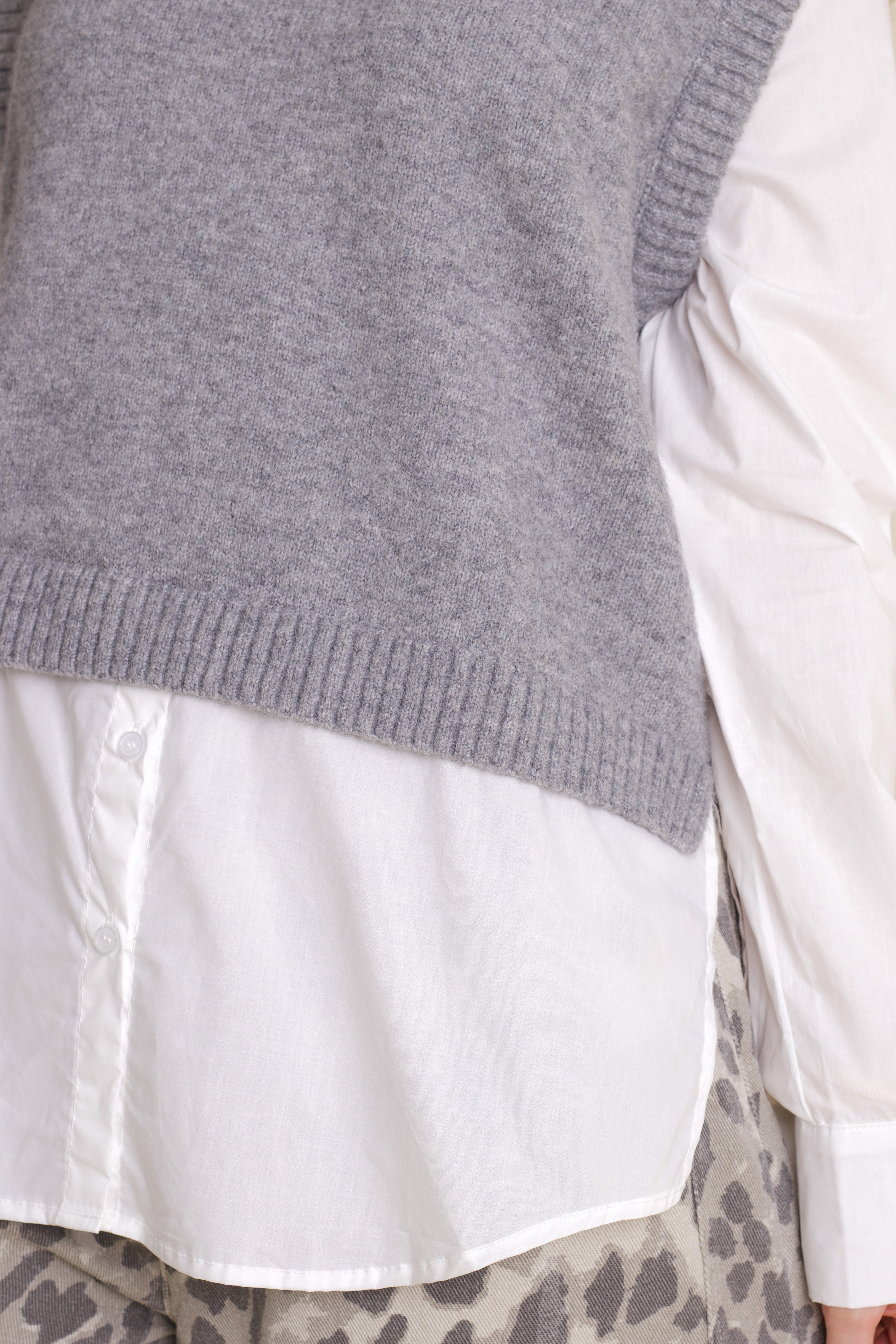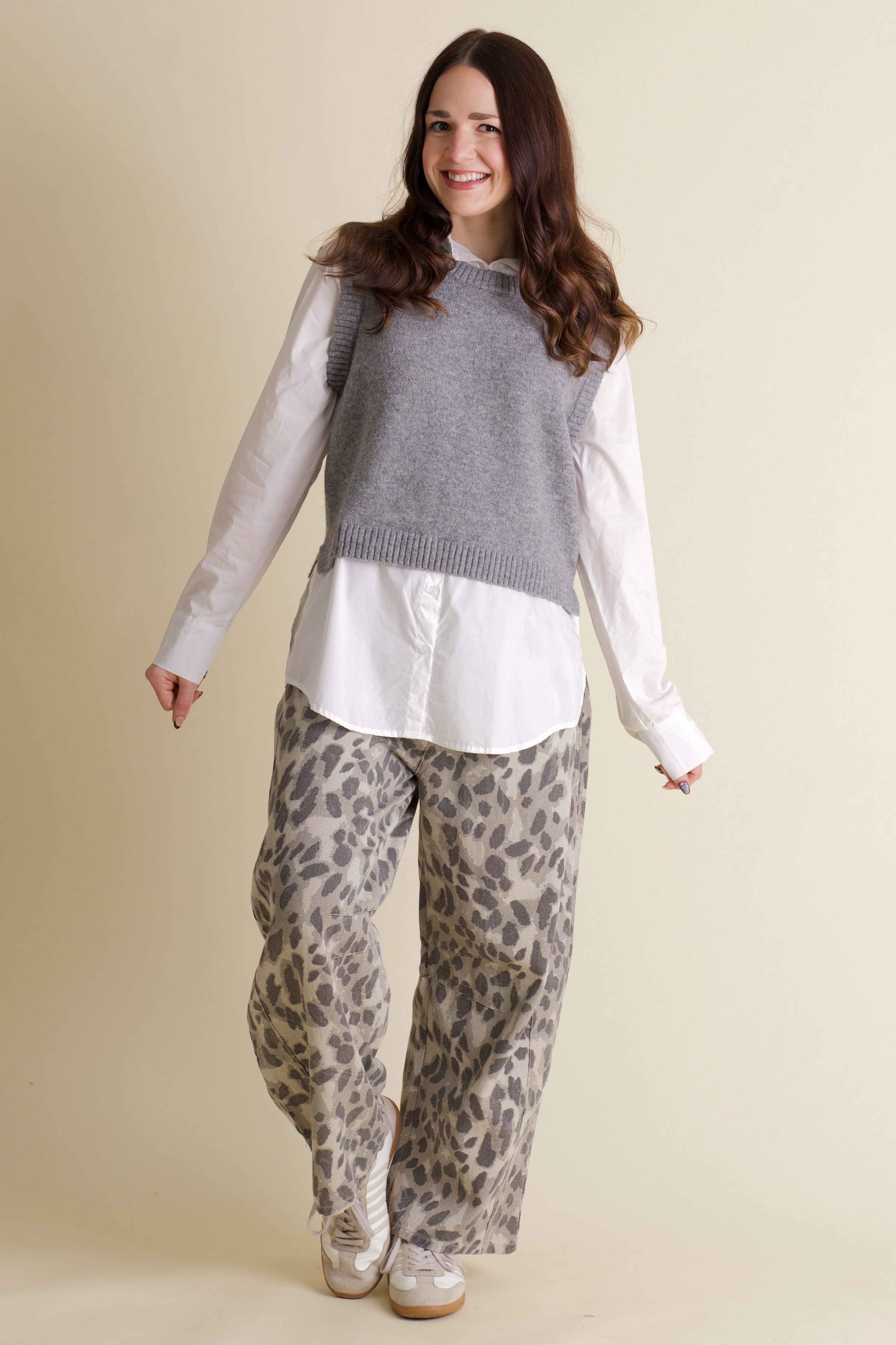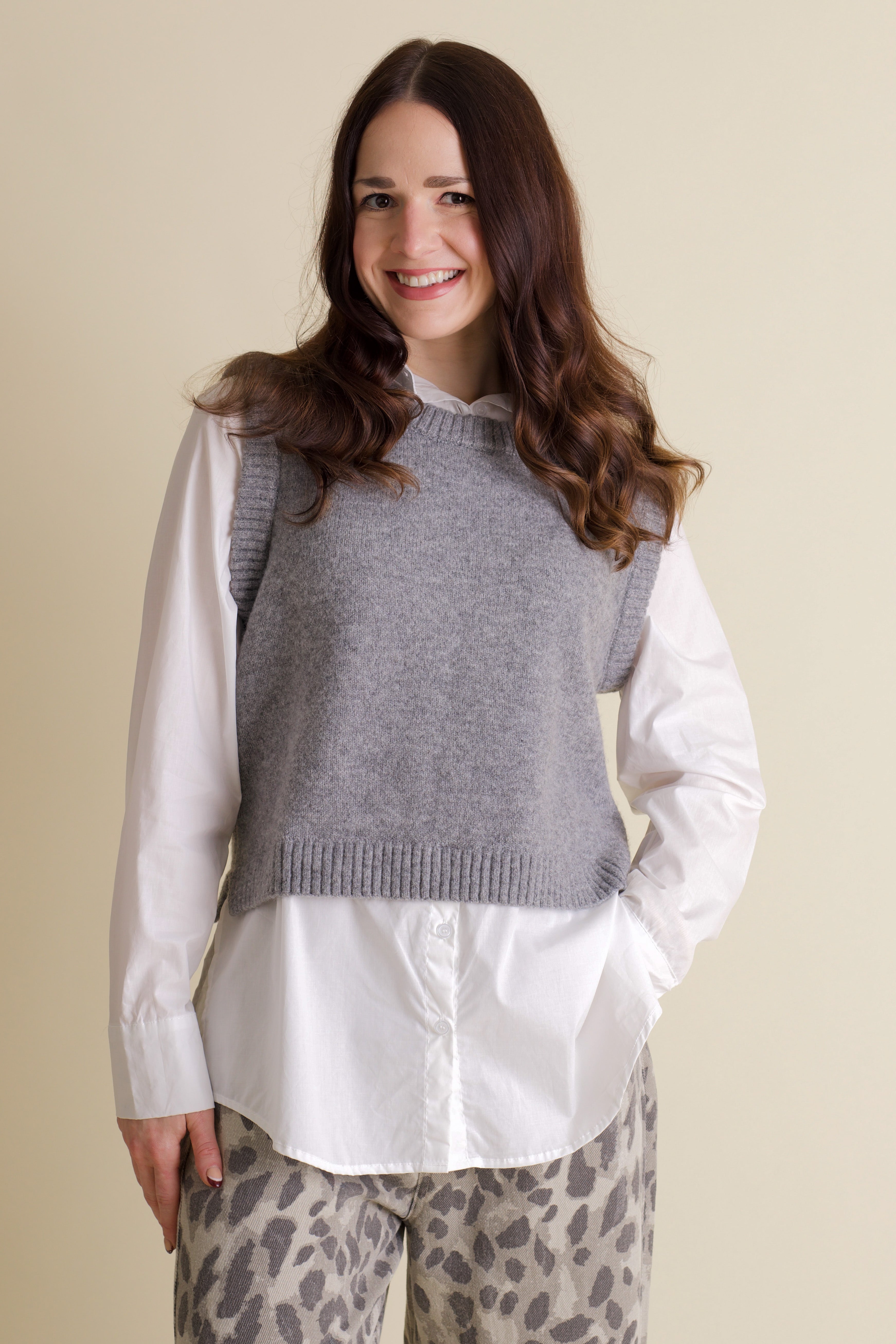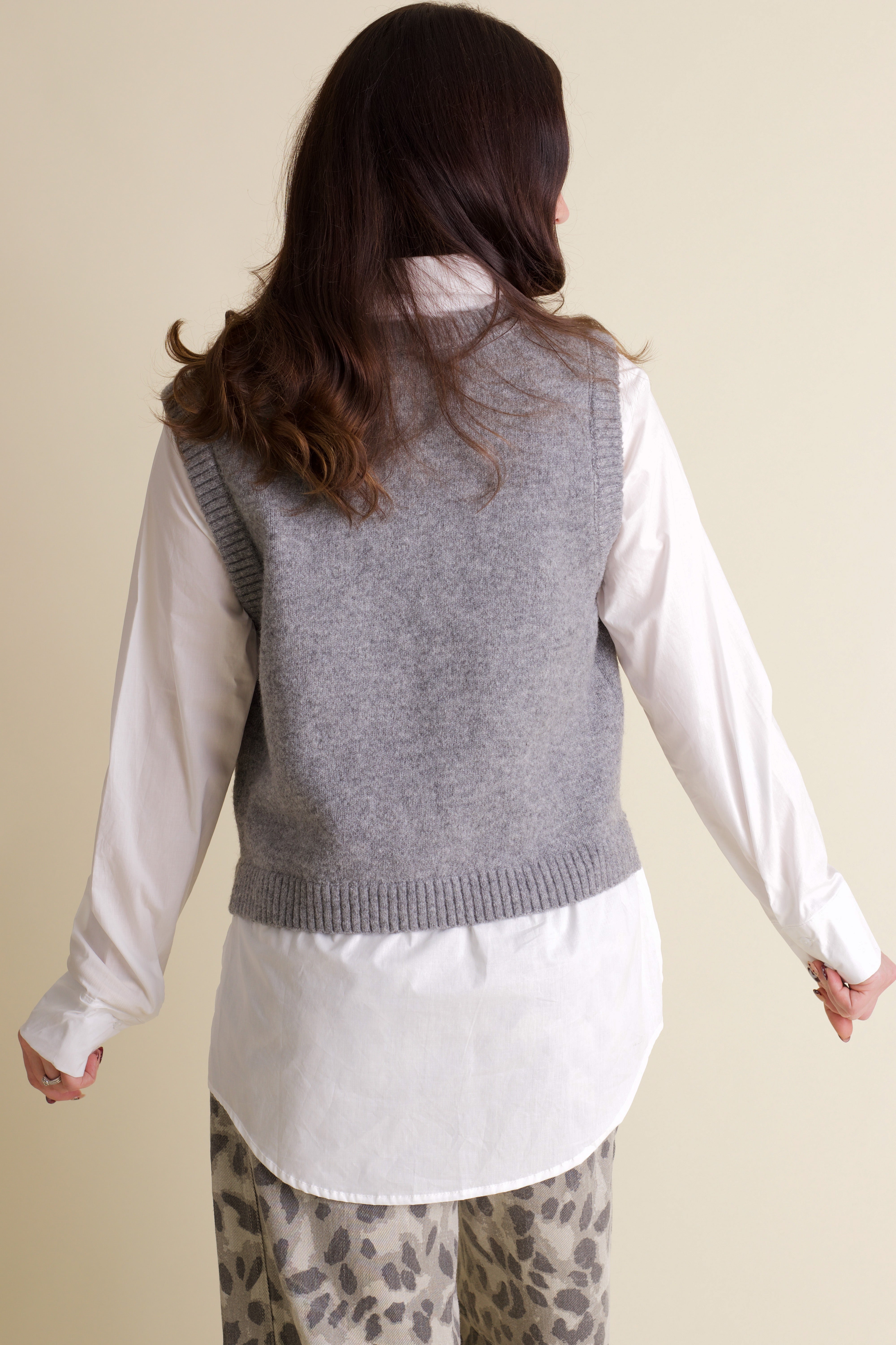 Elevate your everyday style with this playful layered top that combines a crisp white button-down with a cozy gray sweater vest. Perfect for those who love a chic, effortless look with a touch of warmth, it’s ideal for layering and adds a fun twist to your wardrobe basics. Dress it up or down for endless outfit possibilities! Limited stock and available in sizes small through large!