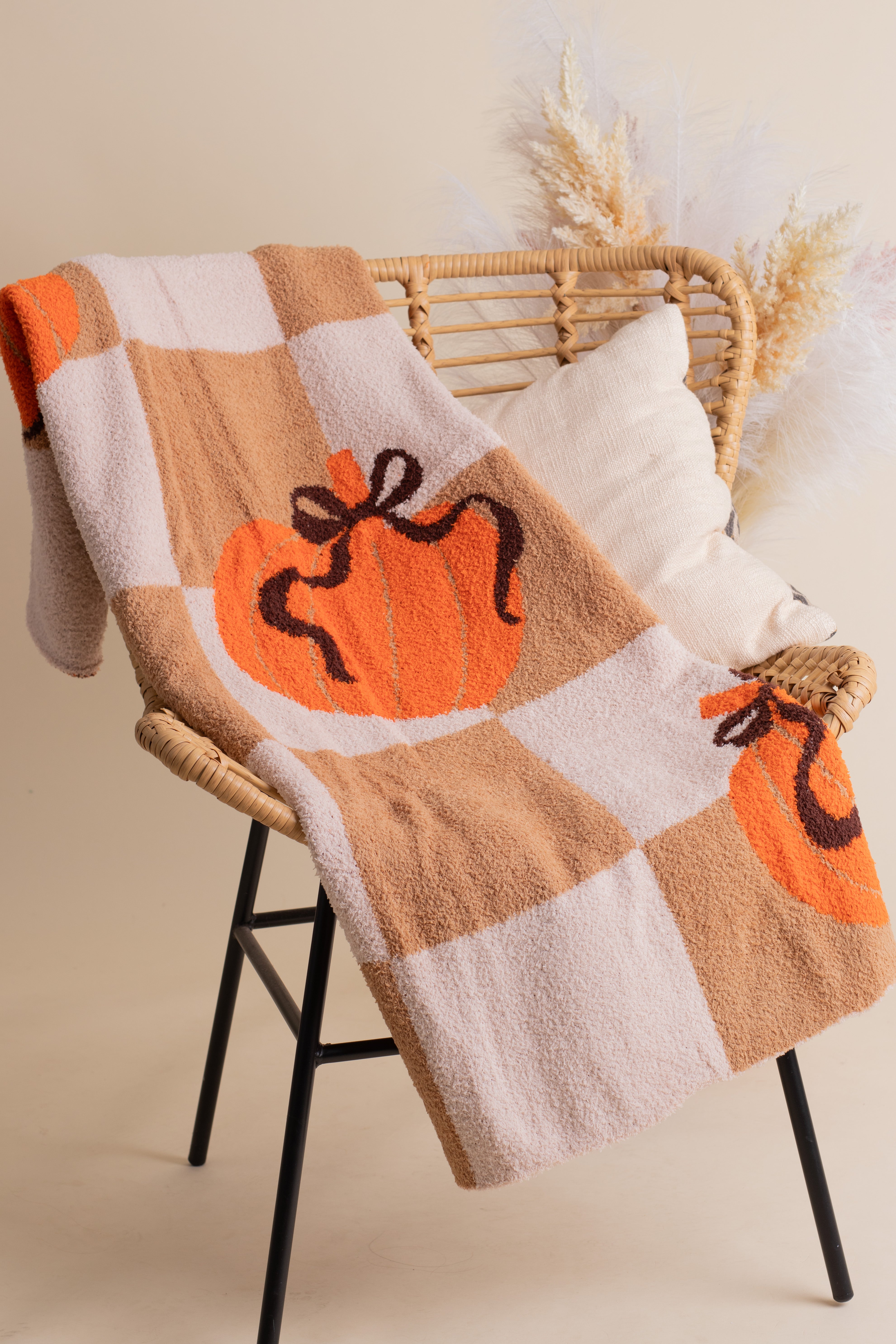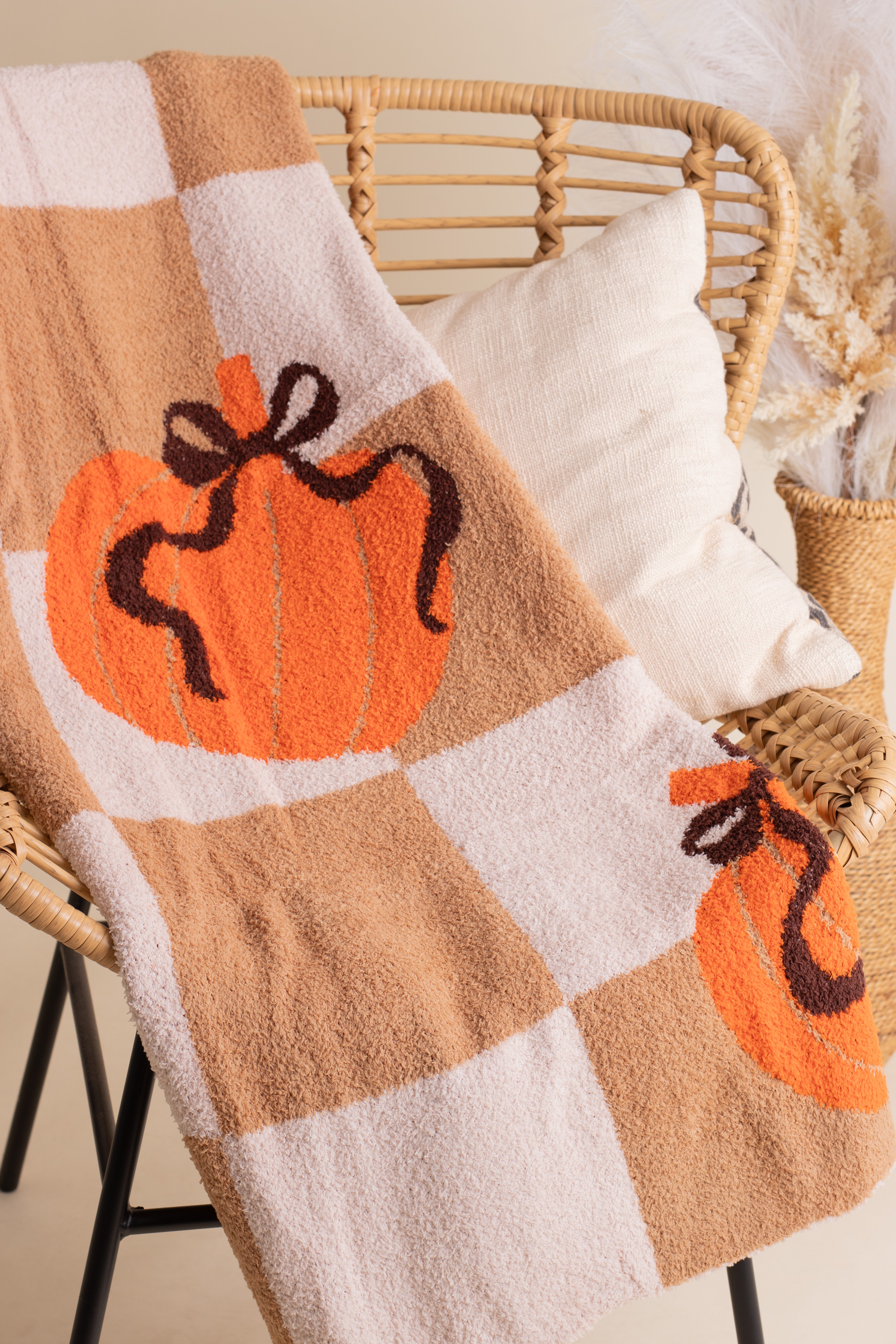 Wrap yourself in the warmth of autumn with the Harvest Hues Blanket. Soft and cozy, this playful throw features a cheerful checkered pattern paired with festive pumpkins, perfect for adding a touch of seasonal charm to any space. Cozy up and celebrate fall in style!