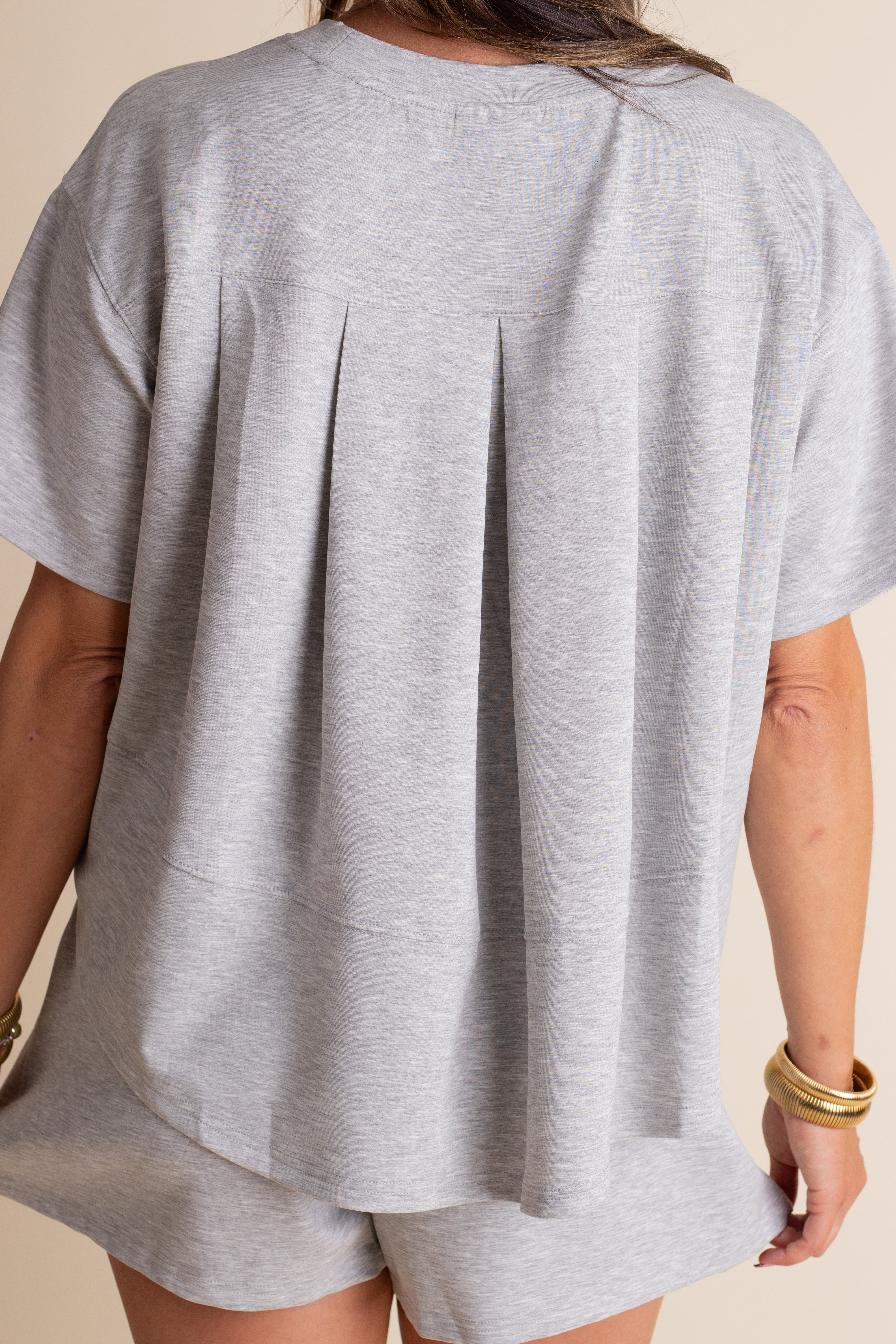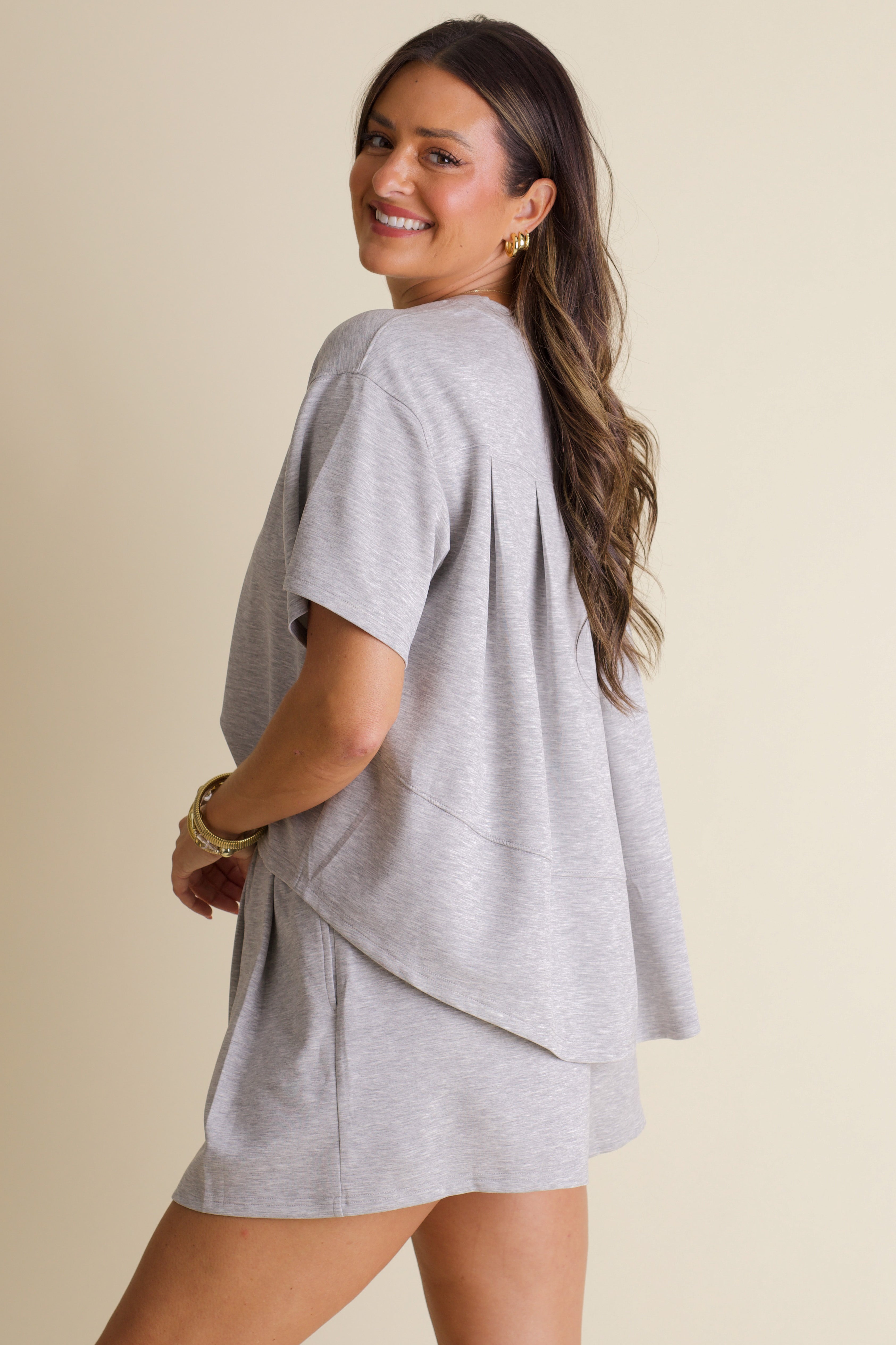 The softest scuba set you’ll slip into — effortlessly chic and made for all-day comfort. The short-sleeve, boxy-fit tee features a modern high-low hem and a beautifully pleated back that adds a touch of drape and movement.