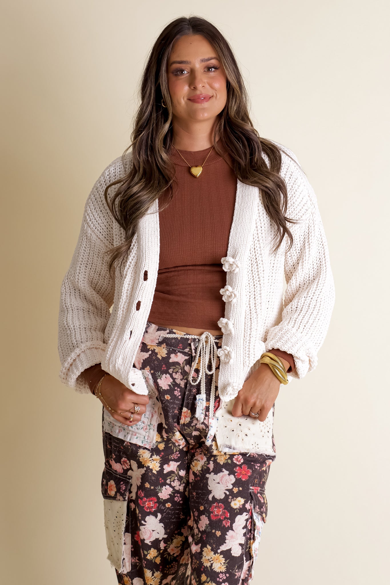 Wrap yourself in warmth and whimsy with the Forever Mine Button Front Cardigan. This cozy ivory chenille beauty features charming chenille flower buttons and breezy dolman sleeves for effortless style. Its relaxed fit makes it perfect for layering on chilly days while keeping you comfy and cute. Limited stock and available in sizes small through large!