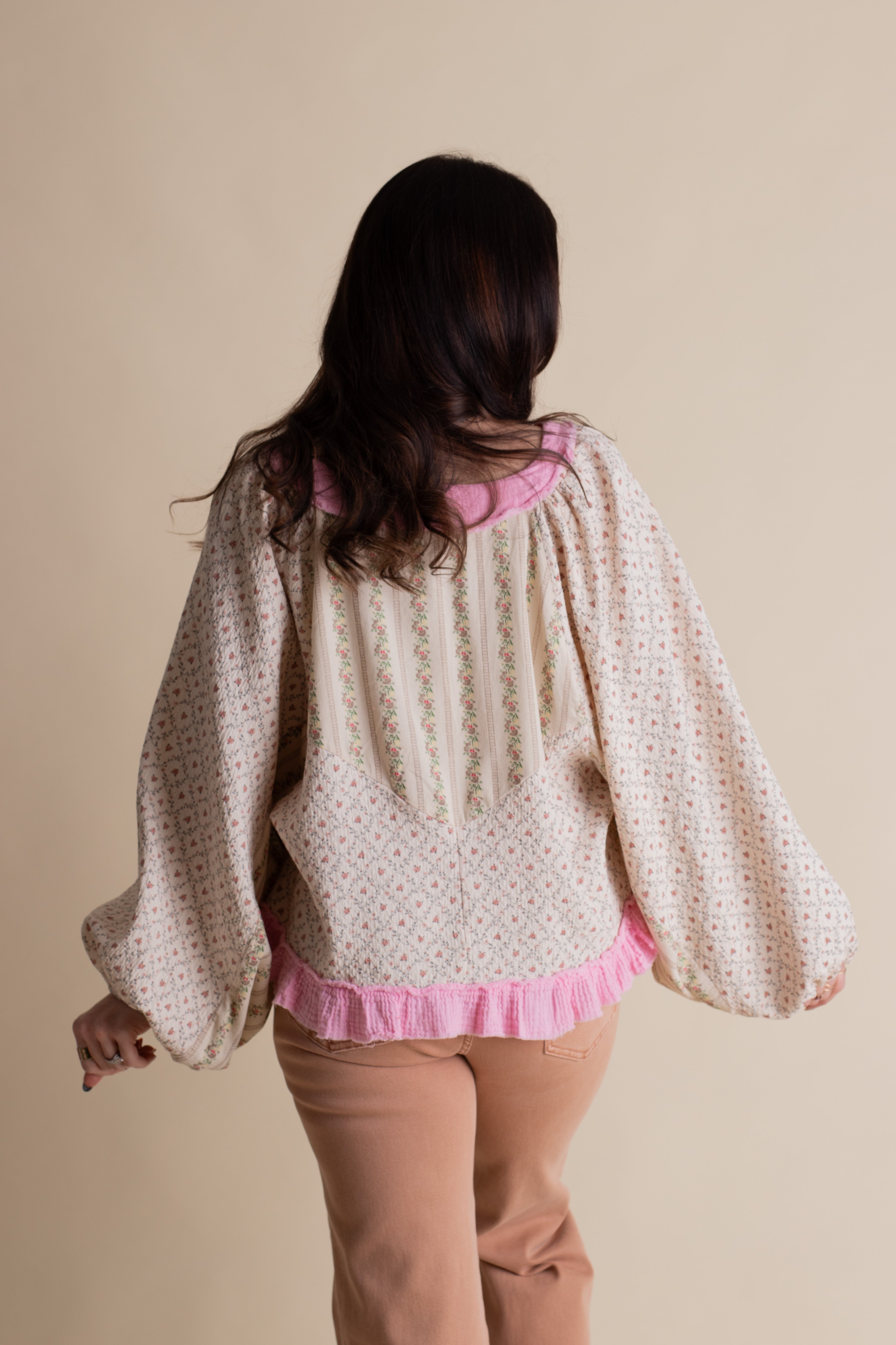 Embrace a whimsical vibe with the Spread Love V Neck Top. Crafted from soft cotton gauze in dreamy pink and cream florals, it features a flirty laced-up tie front, playful balloon sleeves cinched at the wrist, and a charming ruffled hem. Its boxy fit makes it effortlessly breezy and fun—perfect for brightening any day with a touch of sweet, carefree style. Limited stock and available in 2 color options and sizes small through large!