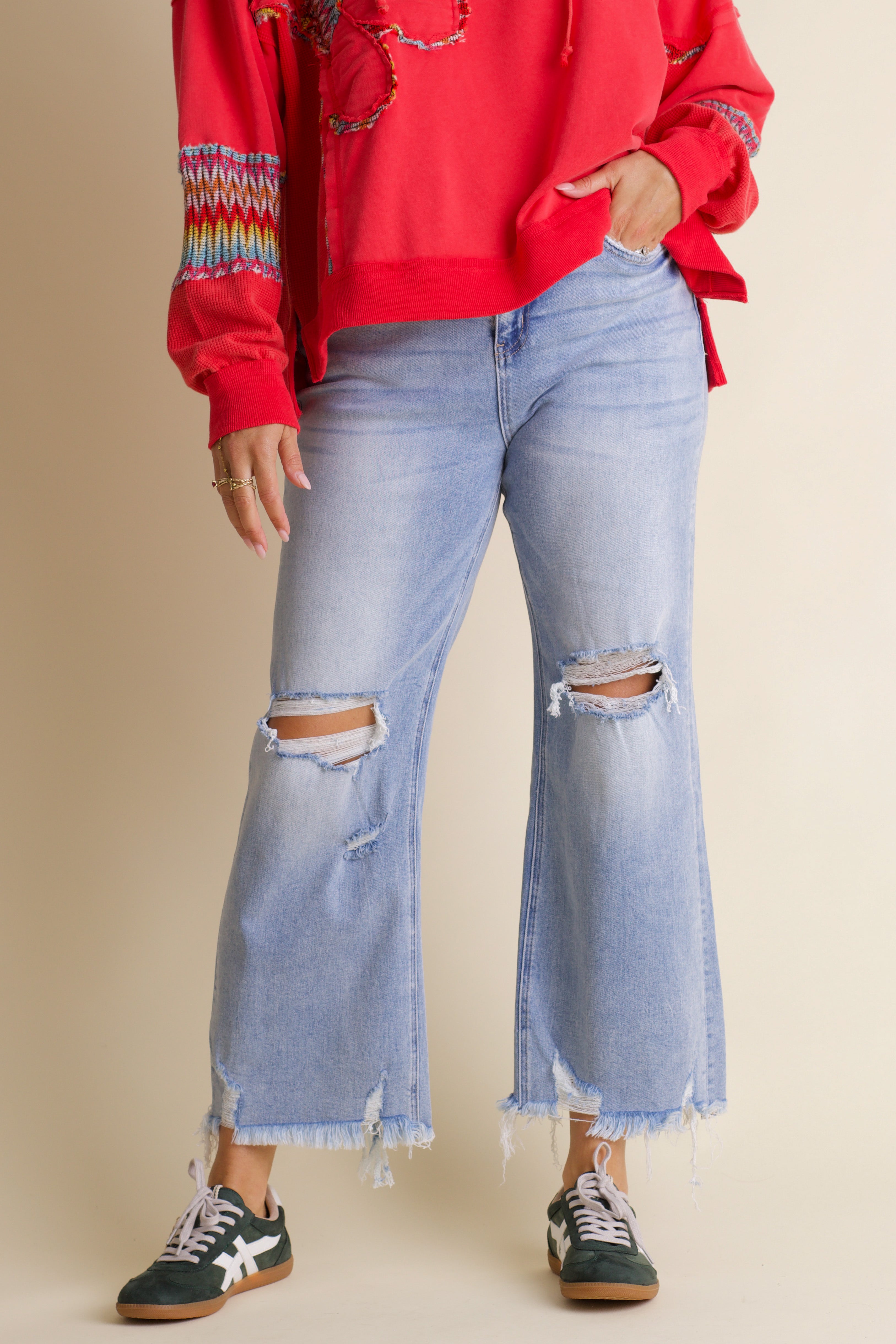 These River Light High Rise Distressed Jeans bring fun to your wardrobe with their stretchy, comfy fit and flirty high waist. The medium wash gives a cool, laid-back vibe, while distressed knees add a playful edge. The frayed asymmetrical hem completes the look, making every step feel effortlessly stylish and uniquely you. Perfect for turning heads wherever you go! Limited stock and available in sizes 1-22!