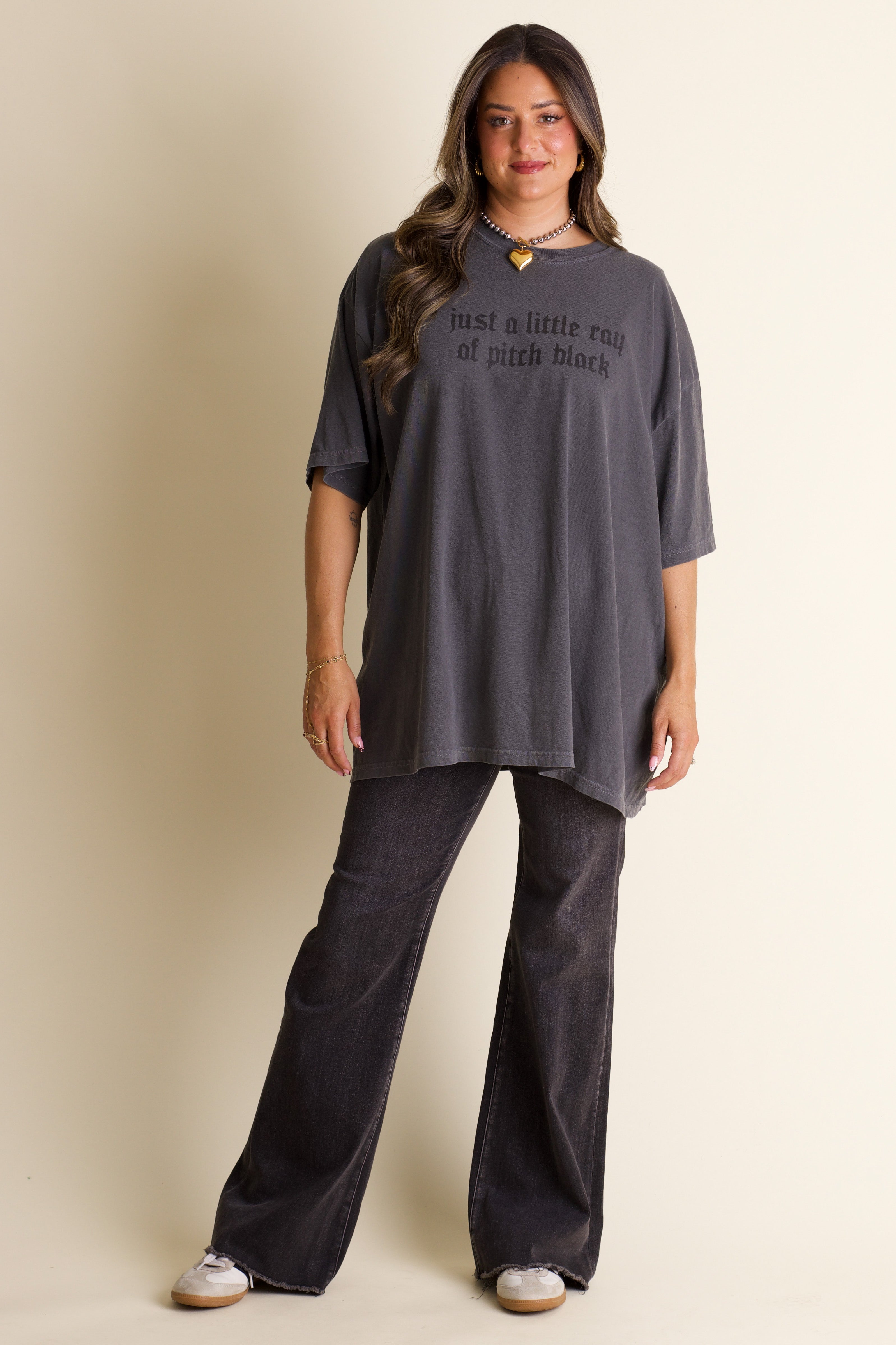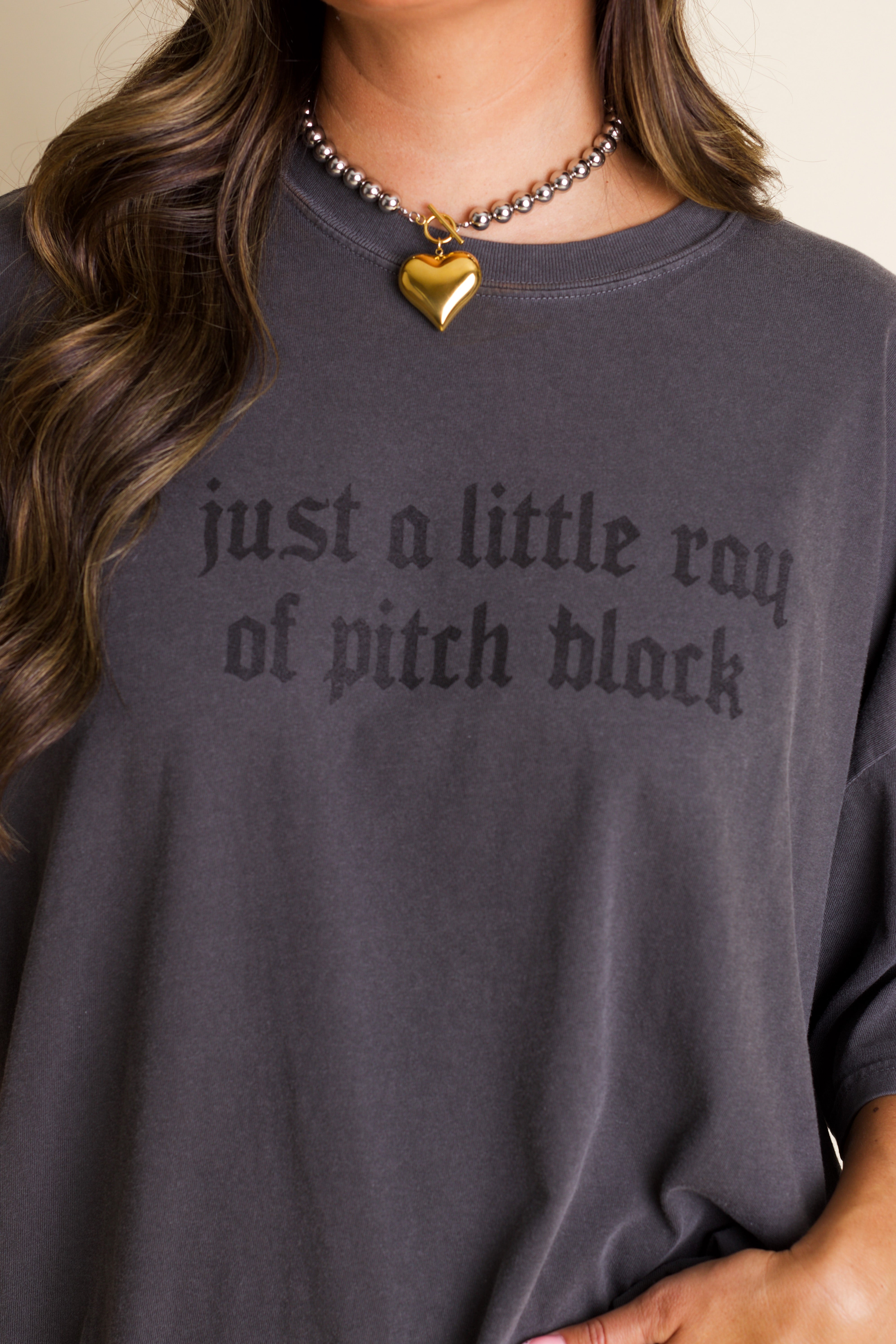 Add a touch of spooky charm to your wardrobe with the Little Ray Of Pitch Black Tee! This cozy charcoal Comfort Colors shirt features a playful black "Just A Little Ray Of Pitch Black" graphic, screen printed in-house for quality and style. Perfect for celebrating the spooky season with a cute, comfortable vibe.