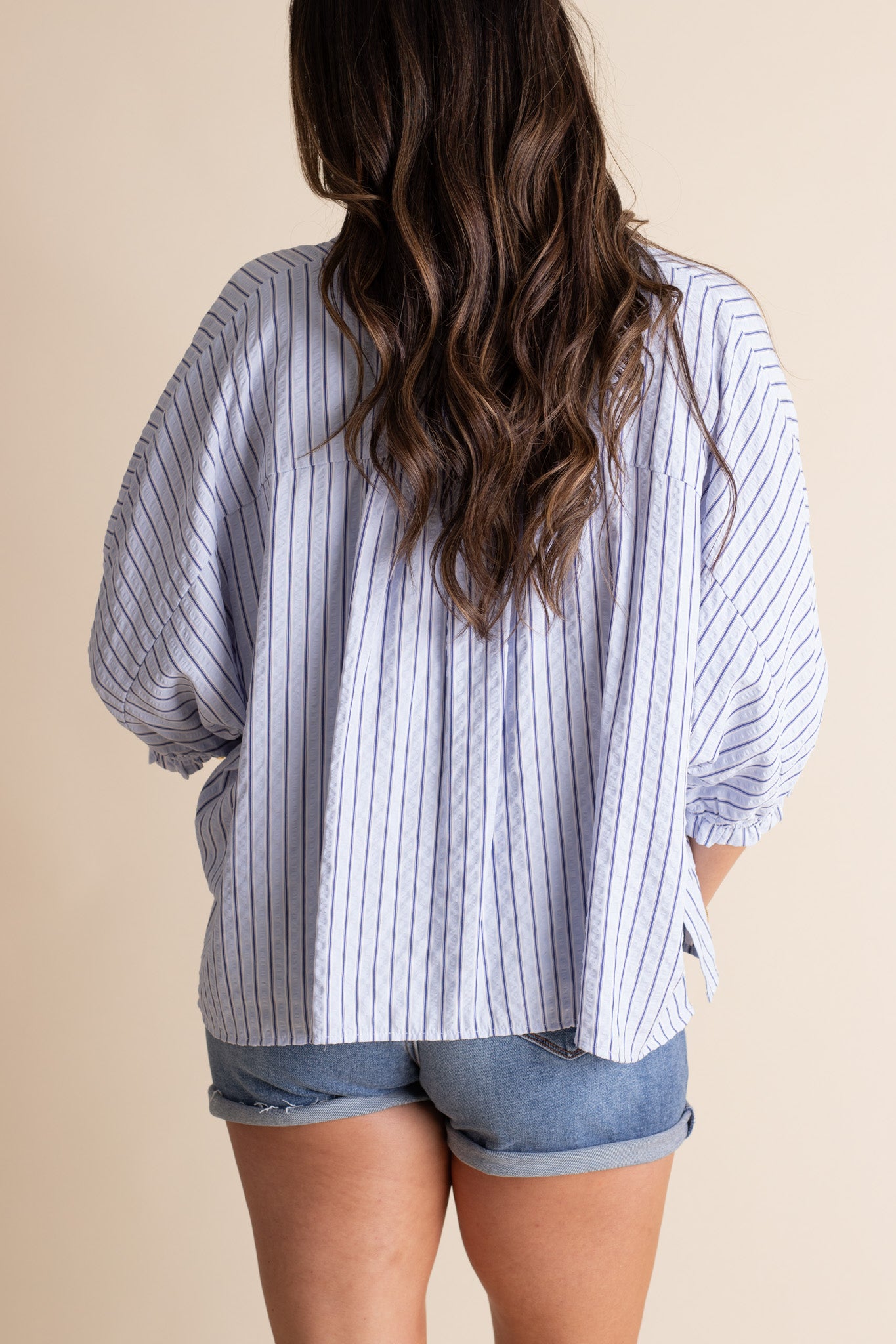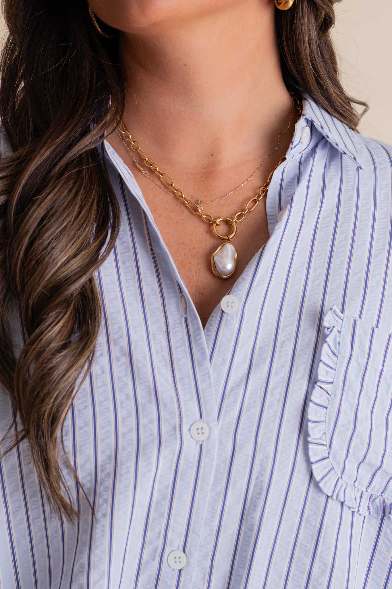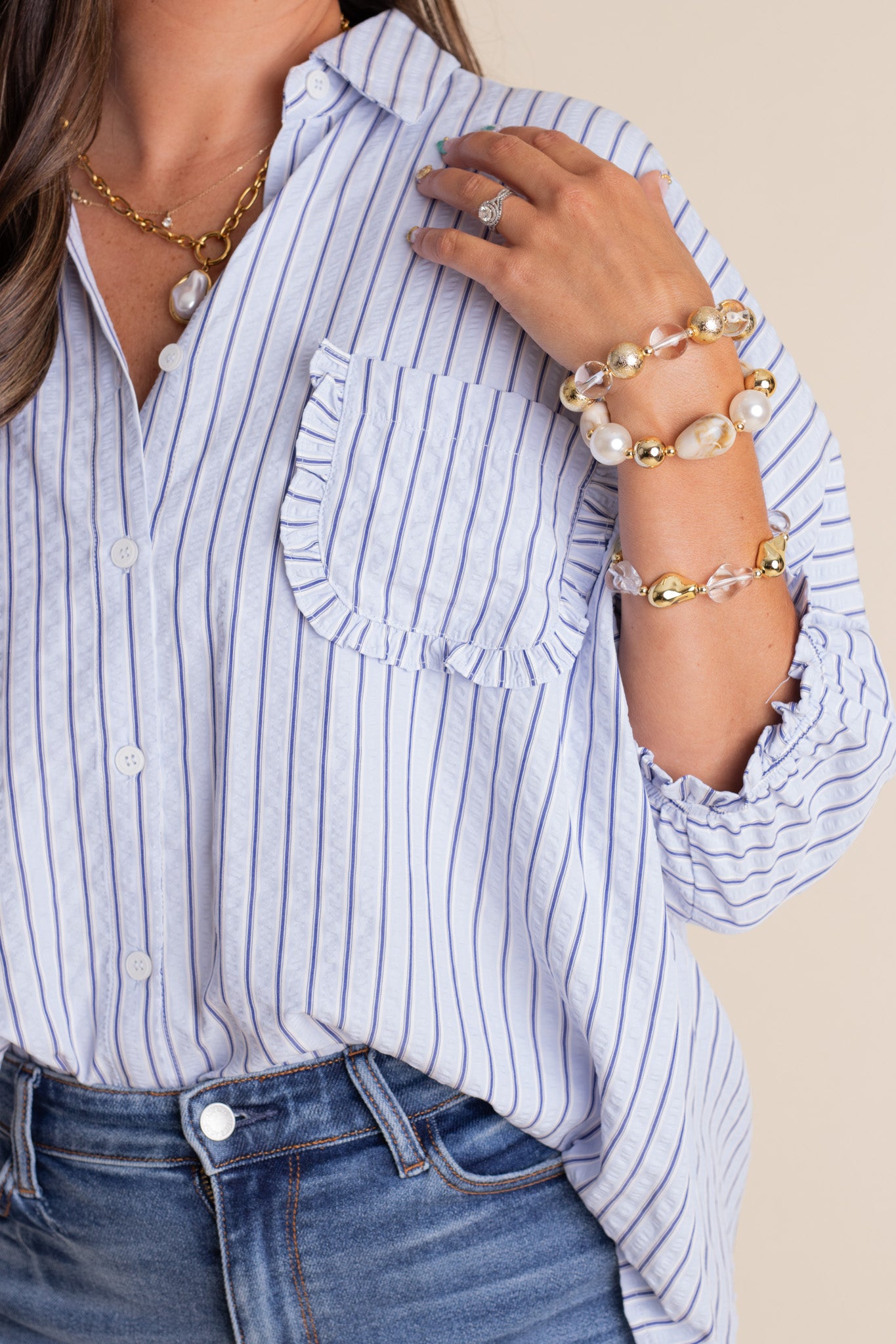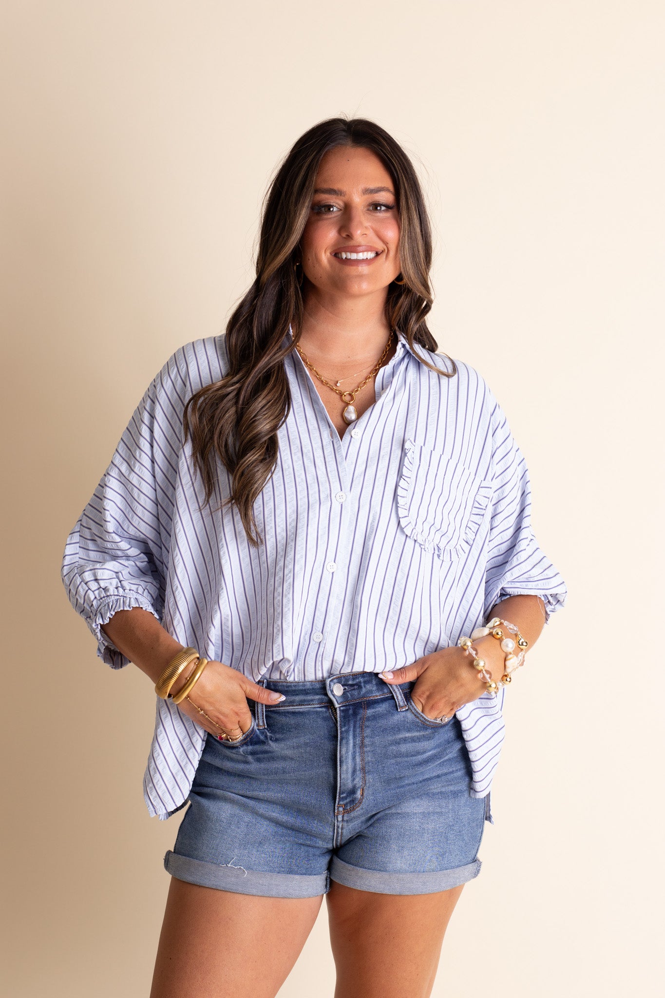 Embrace breezy days in the Sail The Coast Button Down Top, featuring lightweight textured stripes and a playful oversized fit. Delight in charming ruffled details on the pocket and sleeves that add a flirty touch to this collared button-down. Perfect for effortless style with a fun, carefree vibe. Limited stock and available in sizes small through large!