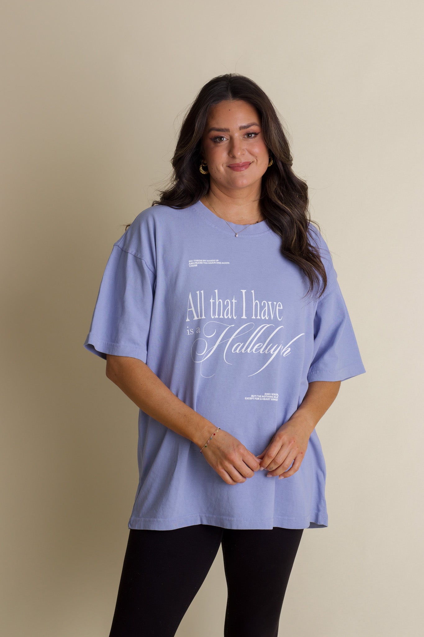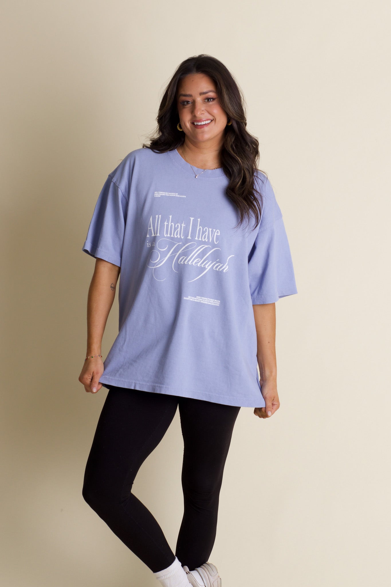 Raise your hands and celebrate with the Hallelujah Mock Neck Tee! This premium black tee features a cozy mock neck and a crisp white screen-printed lyric graphic—handcrafted in-house with love. Perfect for singing along or simply showing off your favorite song in style, it’s a playful way to wear your heart on your sleeve.