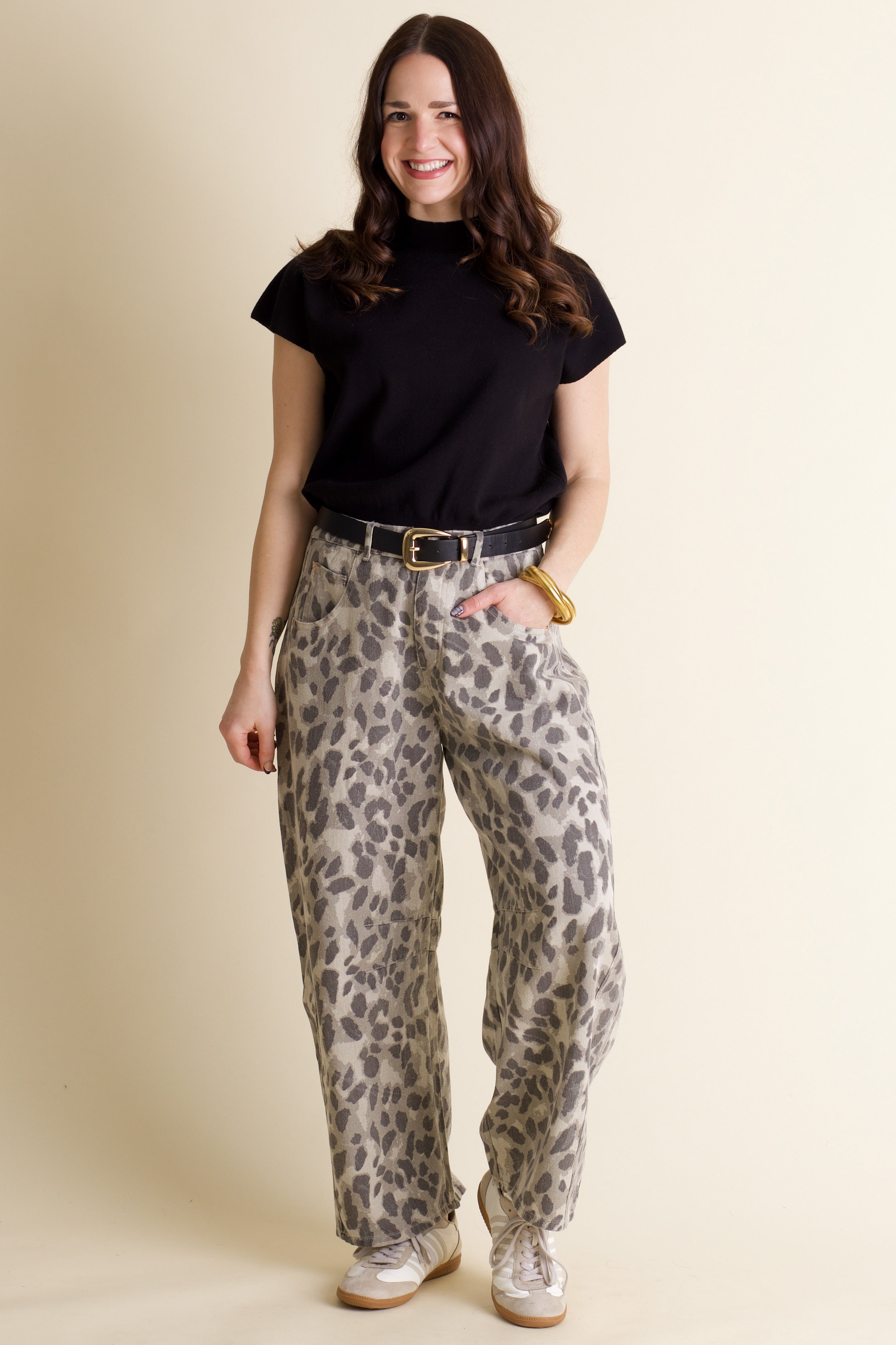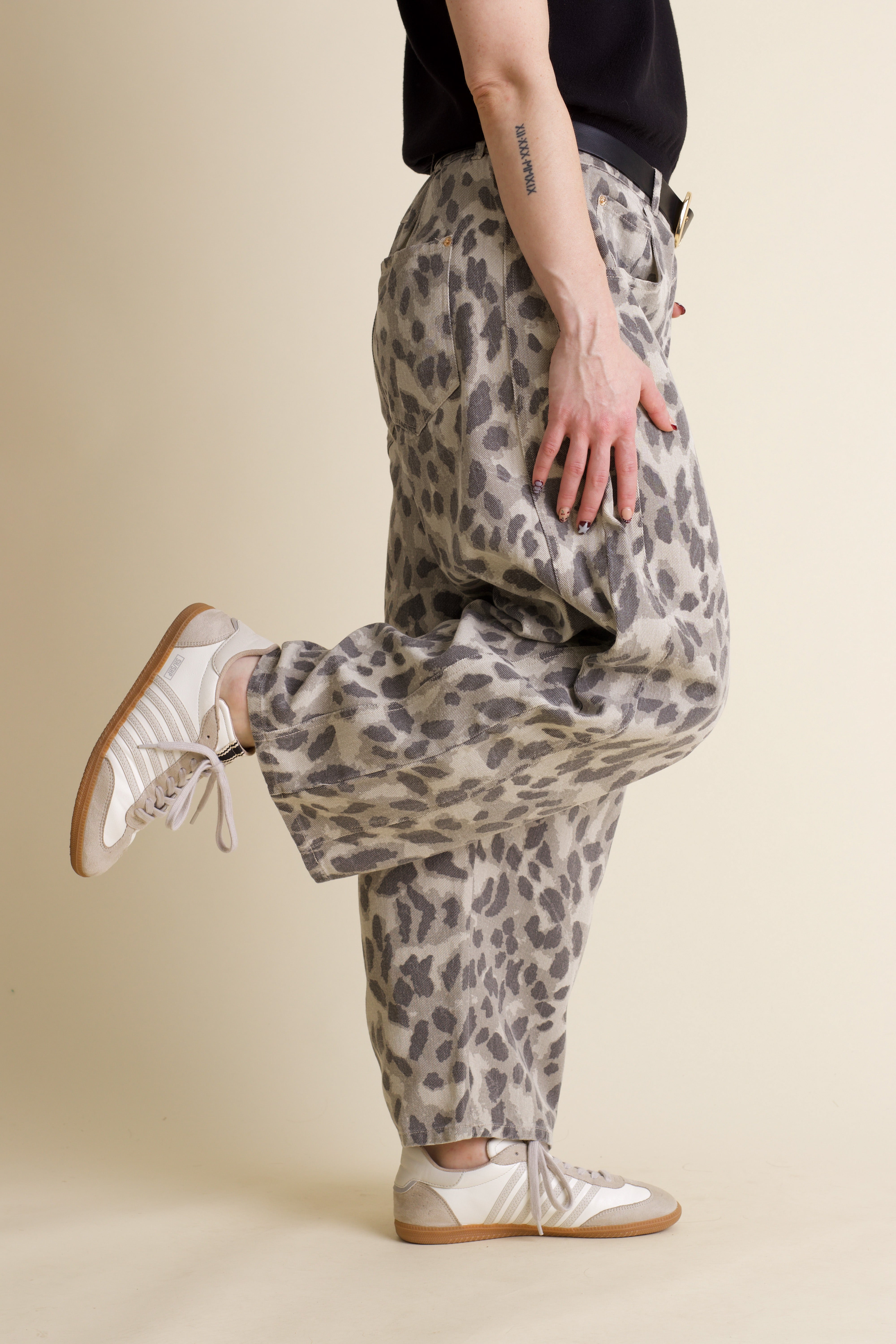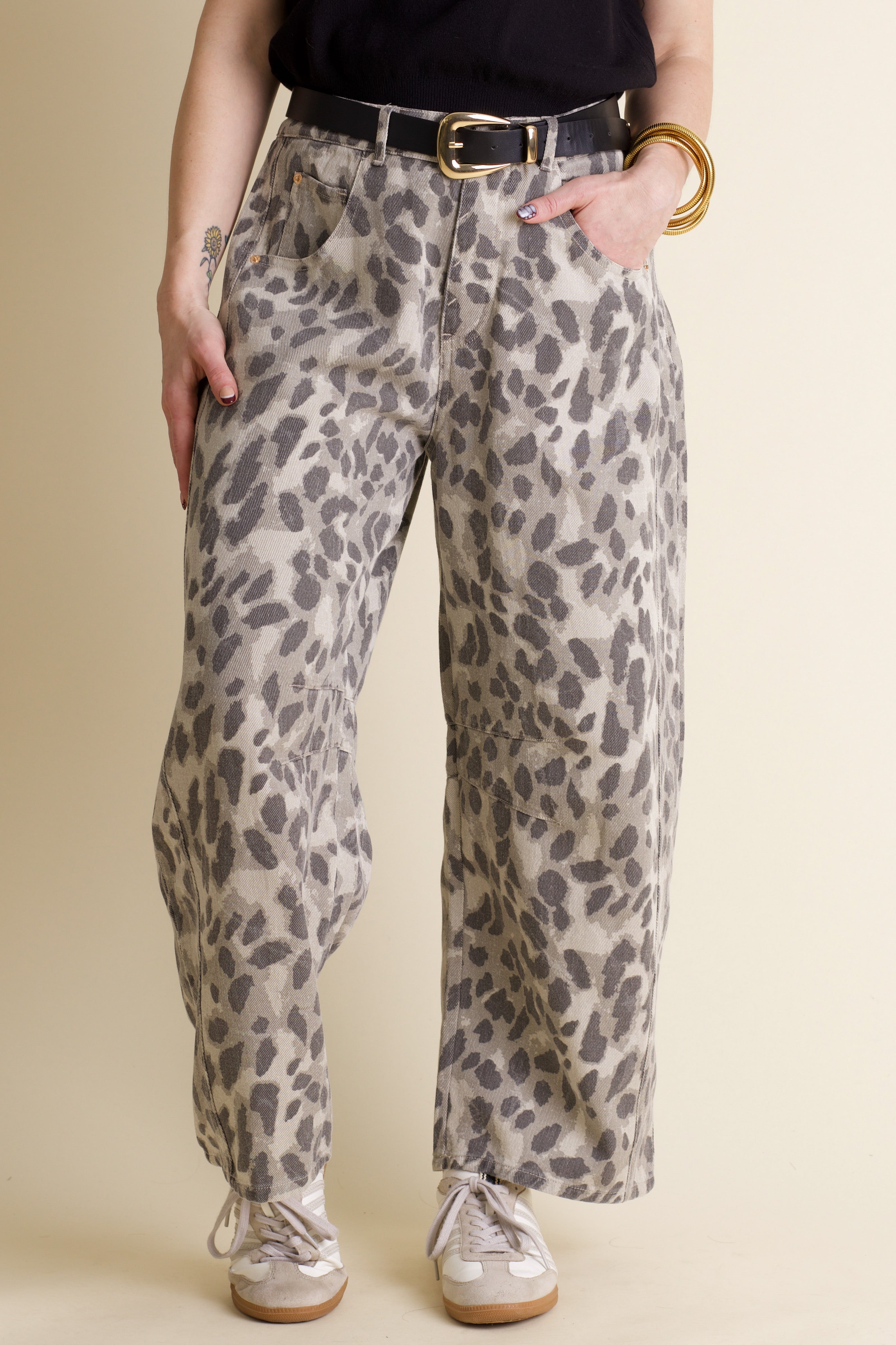Step into bold comfort with the Love The Feeling Wide Leg Jeans. Featuring a playful gray leopard print and a flattering high waist with an elastic back, these barrel-shaped jeans offer an easy fit that moves with you. Perfect for making a statement while staying comfy all day long! Limited stock and available in sizes small through large!