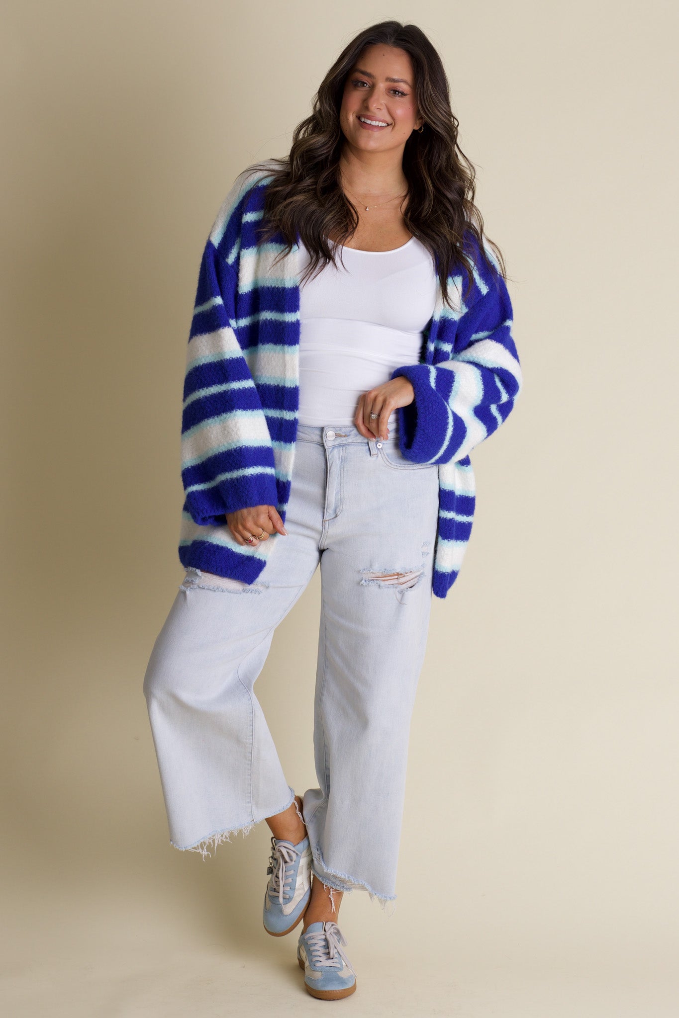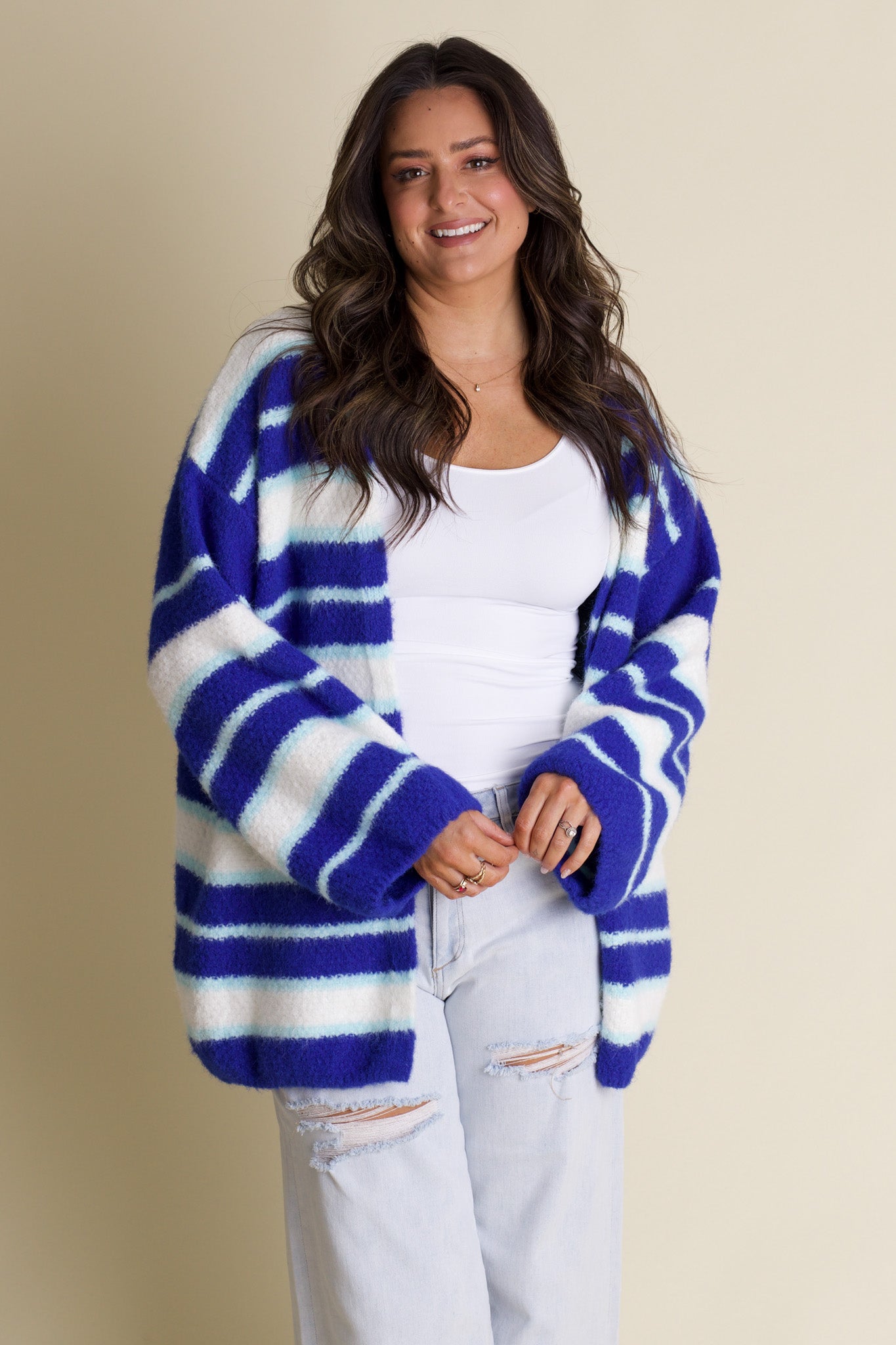Wrap yourself in cozy charm with the Mountain Views Striped Cardigan. Featuring playful balloon sleeves and an oversized fit, this royal blue, light blue, and white striped cardigan adds a fun twist to your layering game. Its open front design makes it easy to throw on for a breezy day or a relaxed evening, keeping you comfy and stylish wherever your adventures take you. Limited stock and available in sizes small through large!