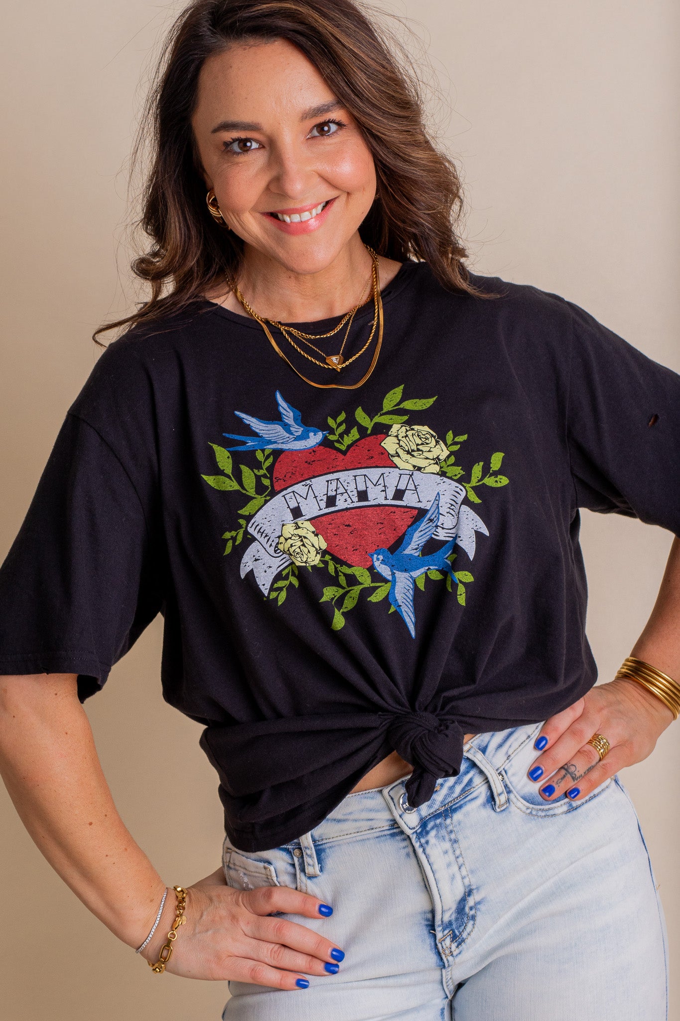 This tee is screen printed in house on a soft black distressed tee with a tattoo design Mama graphic! Limited stock and available in sizes small through 2XL!