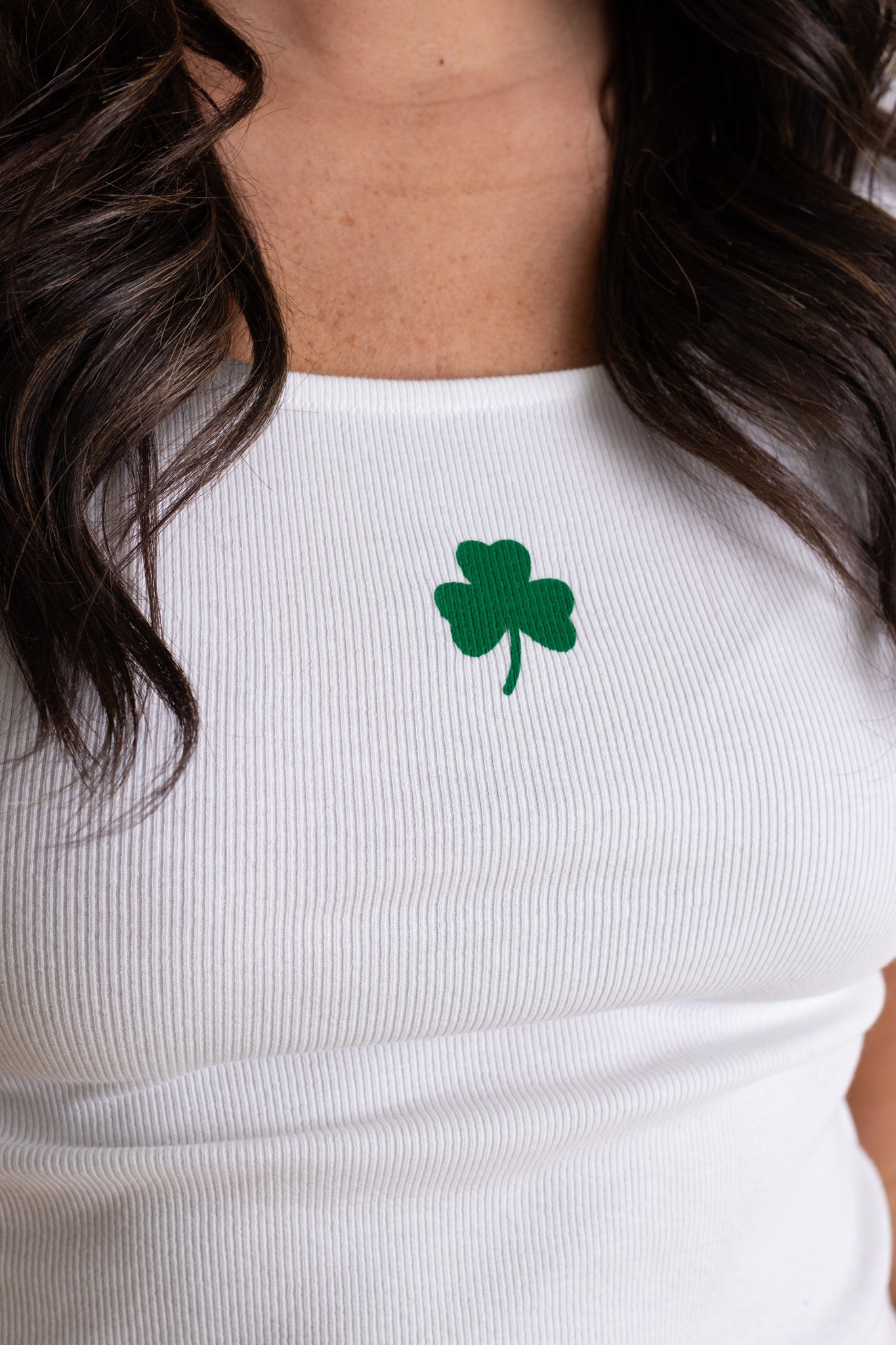 Playful and effortlessly cute, this baby ribbed tee is your new casual essential. Crafted from breathable cotton with a touch of stretch, it features a flattering square neckline, delicate lettuce-edge trim on the sleeves and hem, and a contemporary cropped silhouette that hits just right. The tiny clover graphic adds a whimsical finishing touch that pairs perfectly with everything from jeans to skirts. Comfort meets style in one irresistible package.