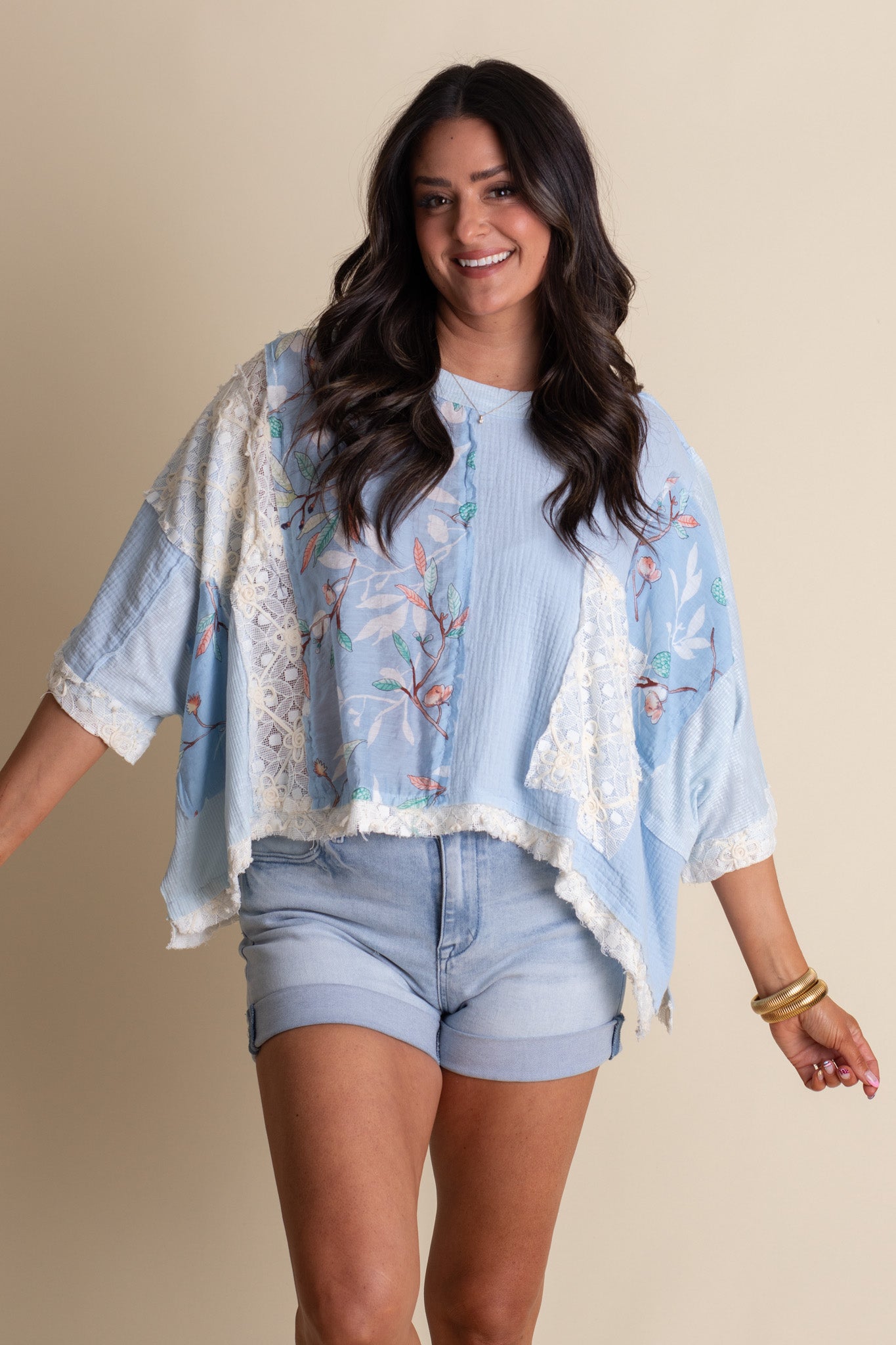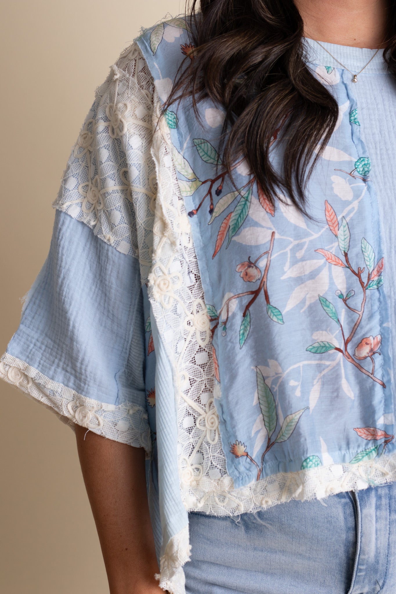 This breezy light-blue top is all about romantic, easygoing style. Designed with a relaxed, flowy silhouette, it features delicate floral panels that add a subtle pop of color and vintage-inspired beauty. Intricate lace trim details frame the front and sleeves, giving it a handcrafted, heirloom feel, while the airy cotton fabric keeps it lightweight and comfortable.