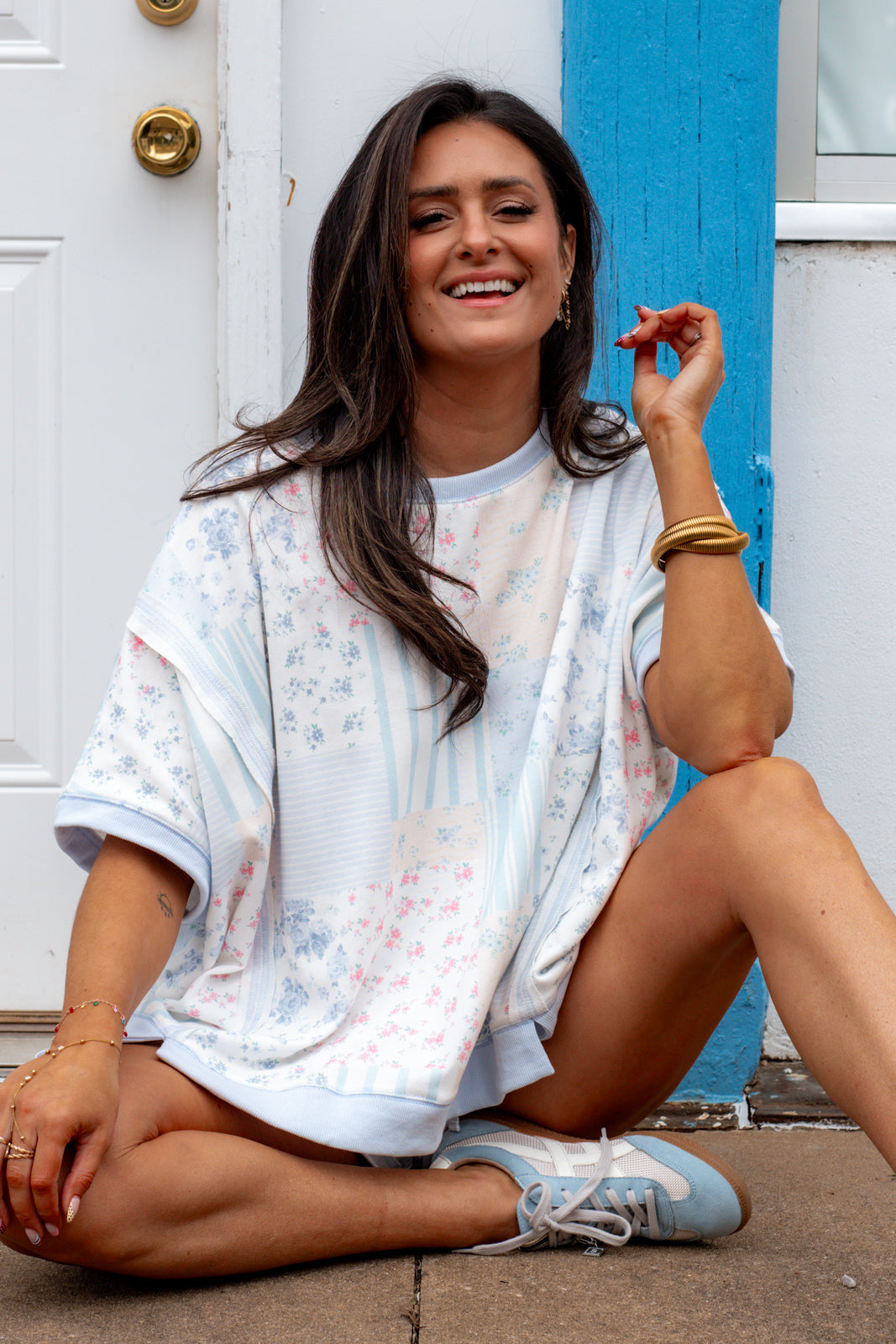 A relaxed French terry top designed for effortless comfort. Featuring a soft patchwork of delicate florals and subtle stripes, this easy-fit tee has a lived-in feel with sweet details that make it perfect for everyday wear—on its own or paired with the matching shorts.