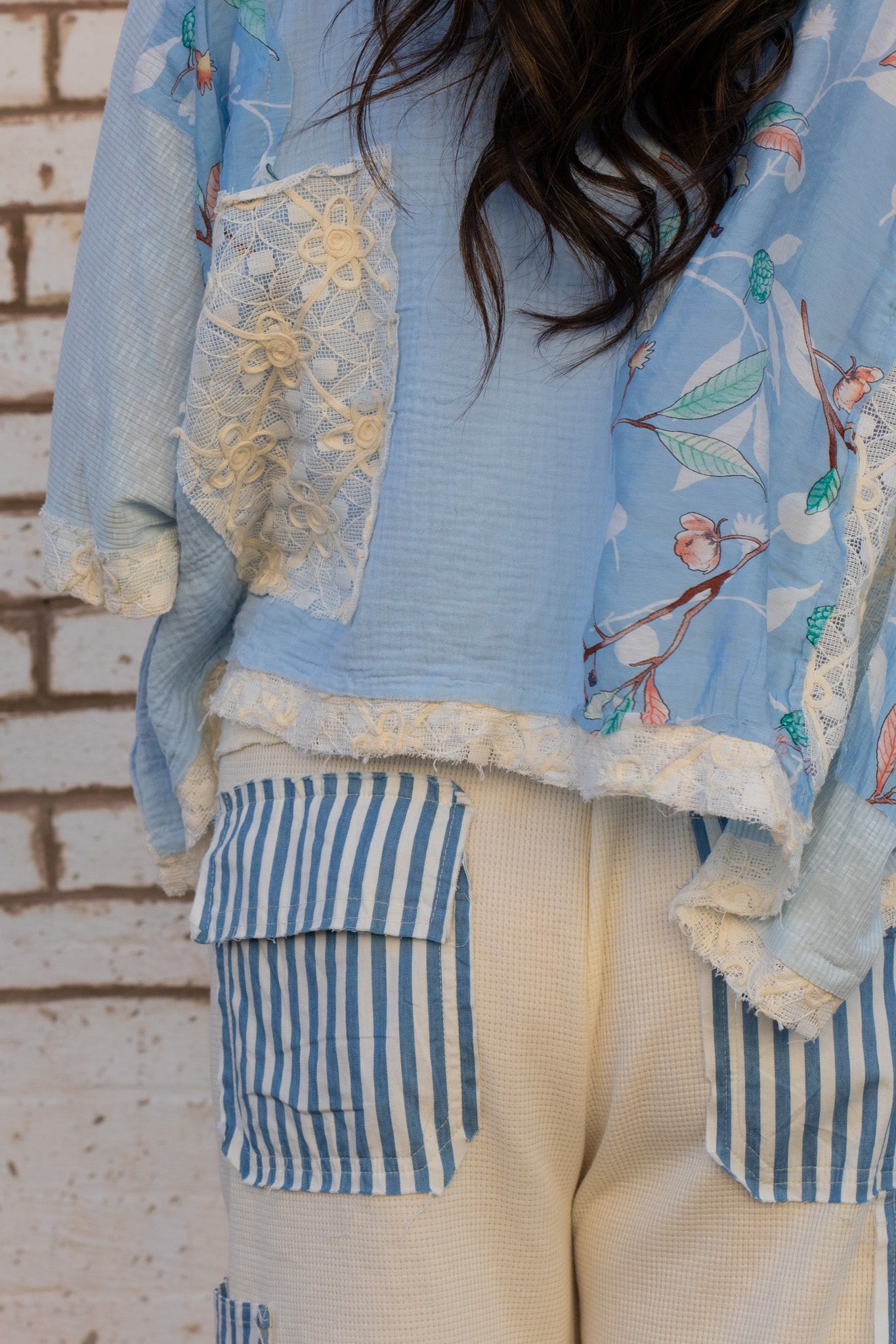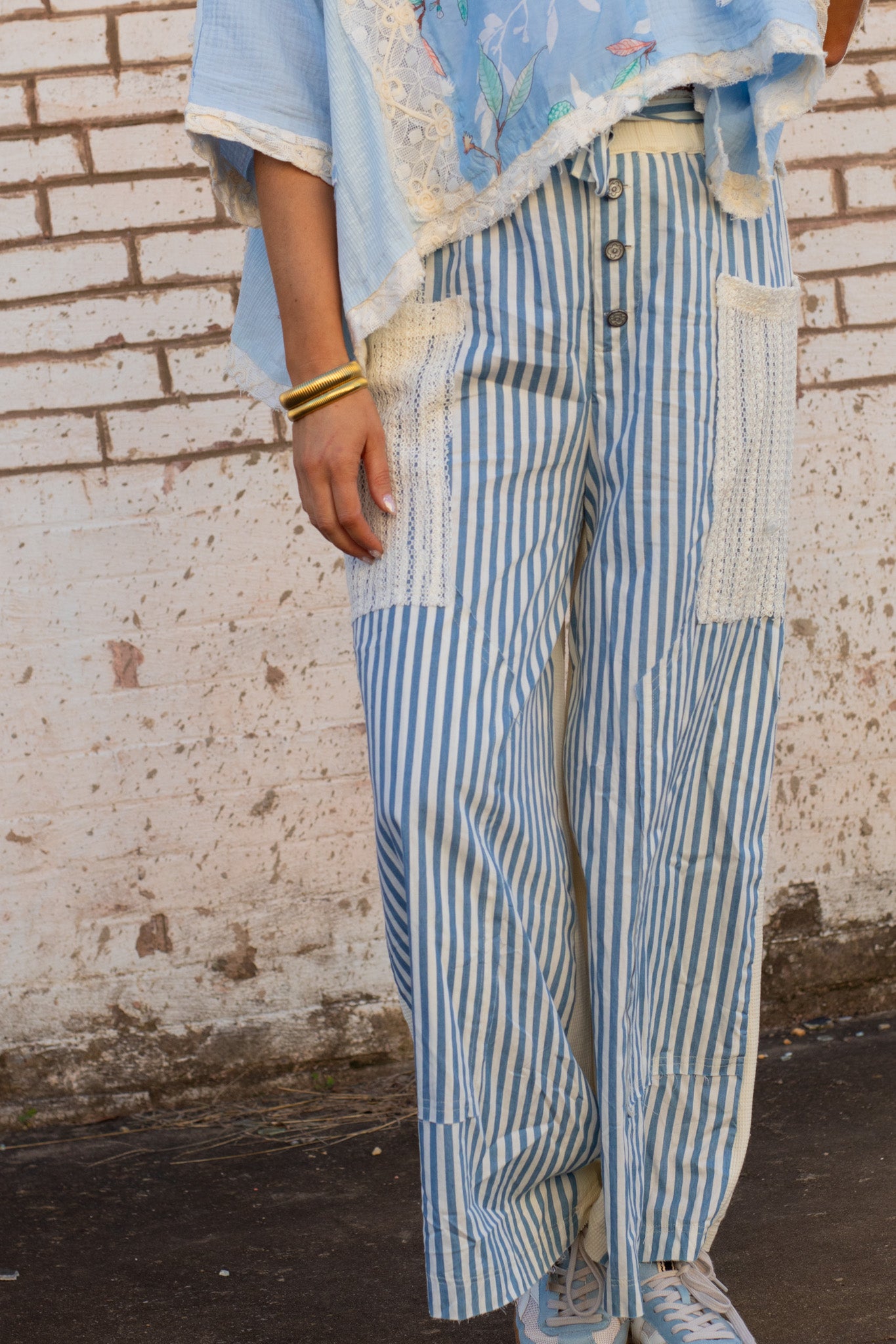 These lightweight striped pants bring an easy, vintage-inspired charm to everyday dressing. Designed with a soft blue-and-ivory vertical stripe, they feature a relaxed straight-leg silhouette that drapes comfortably while still feeling polished. The button-front detail adds a touch of old-soul character, while the textured crochet-style patch pockets give them a handcrafted, one-of-a-kind feel.