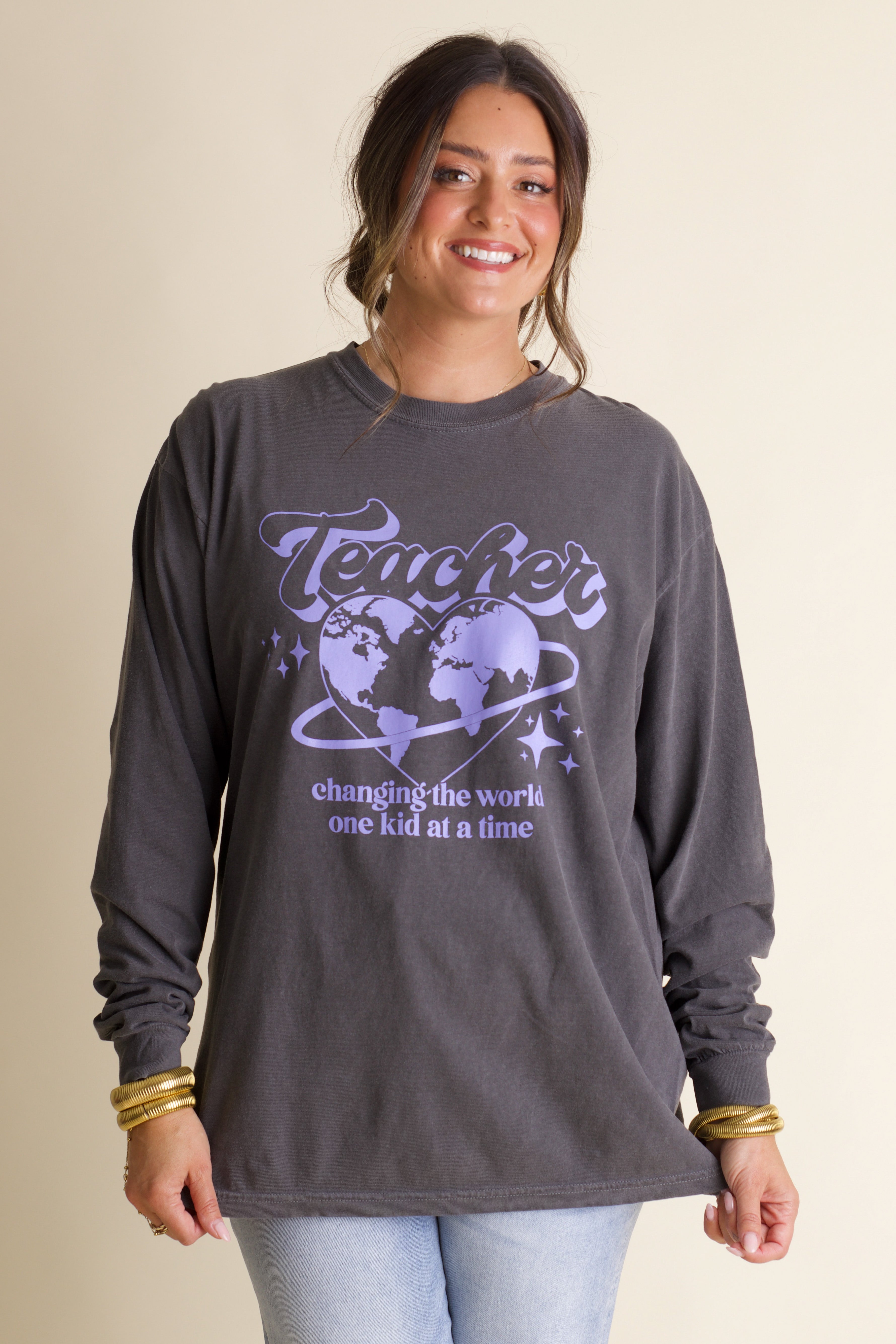 Celebrate the impact teachers make with this playful long sleeve tee. Featuring a soft charcoal gray Comfort Colors fabric and a charming lavender graphic, it’s perfect for those who are changing the world one kid at a time. Cozy, stylish, and printed in-house, this shirt pairs comfort with heartwarming spirit.