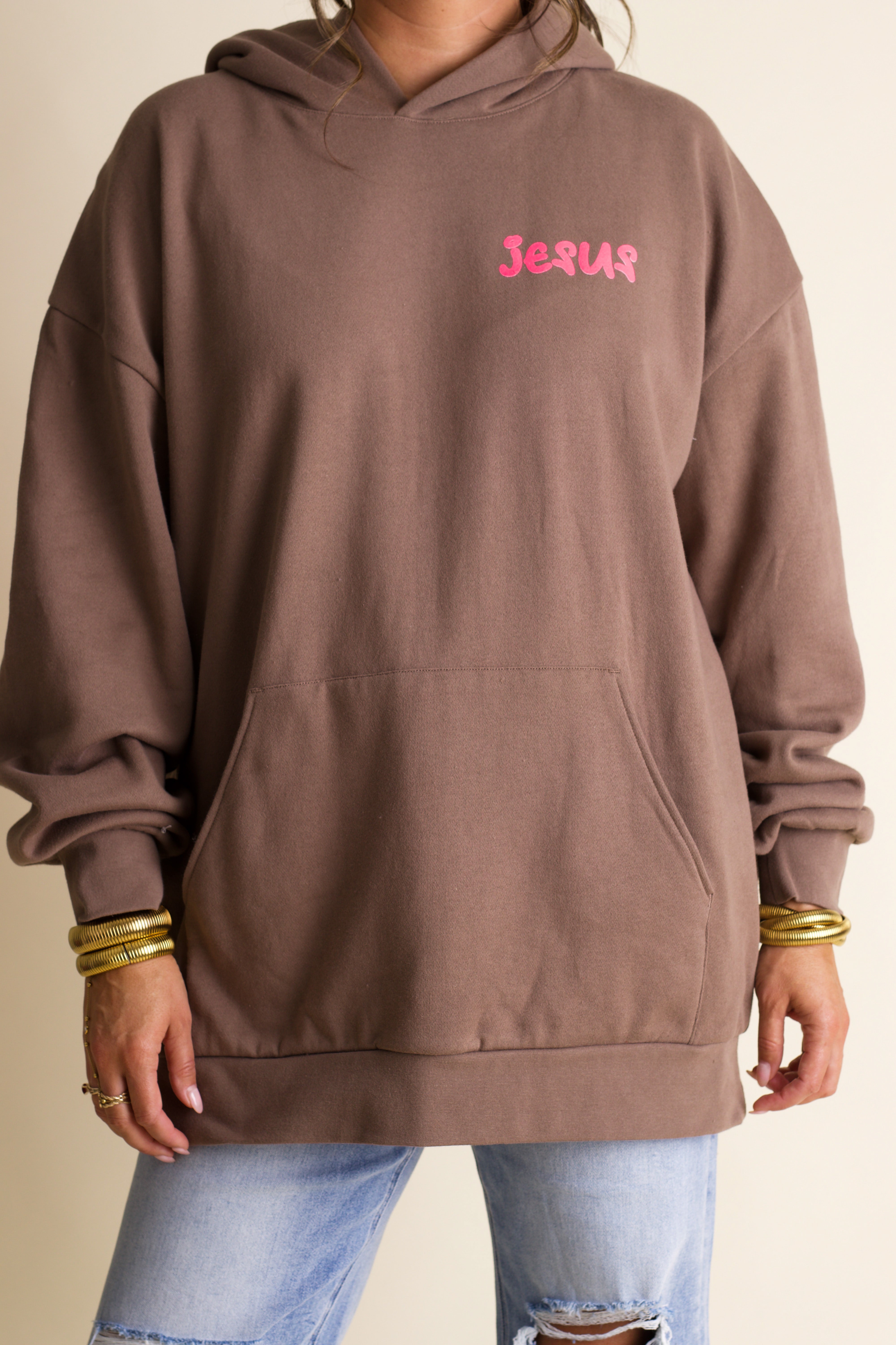 Stay cozy and inspired with the Your Way's Better Hoodie. This soft, fleece-lined brown hoodie features a vibrant hot pink Jesus graphic on the front and a playful "Your Way Is Better" design on the back, both screen printed in-house for quality you can feel. Perfect for adding a bold, fun statement to your casual wardrobe while keeping warm.