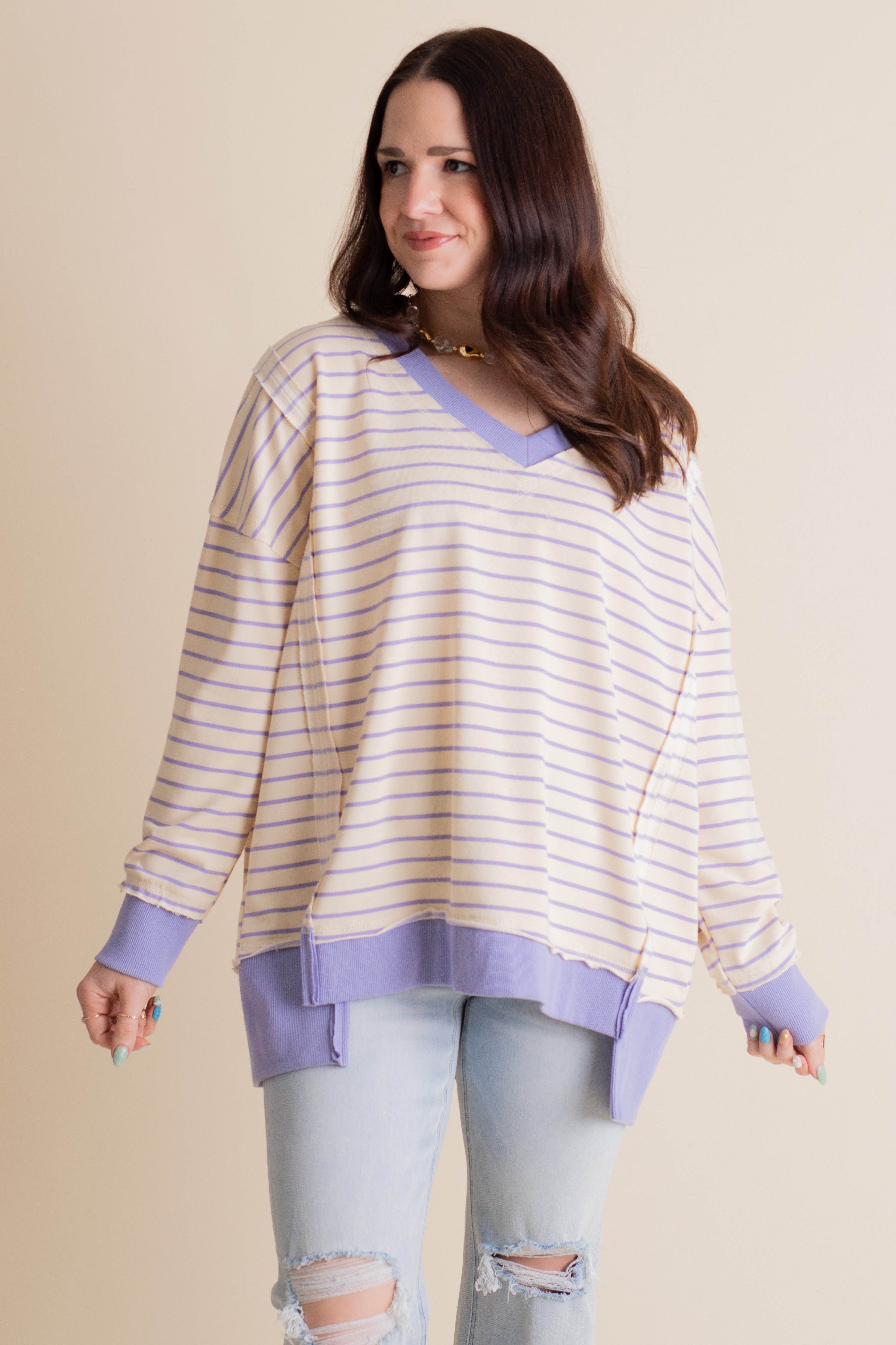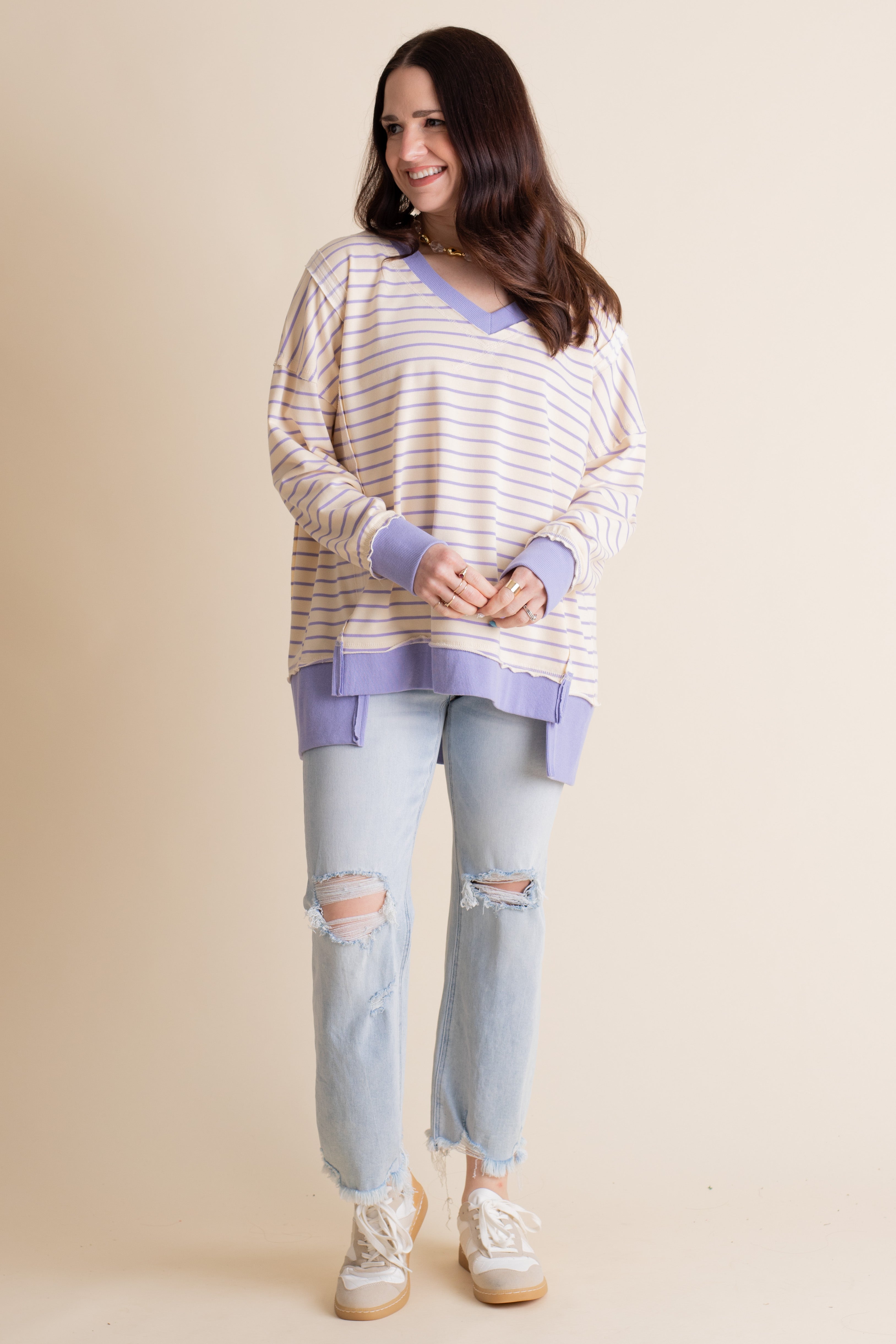 Fall in love with our Love Me Tender V Neck Top. Made with cozy French Terry fabric, this striped top features raw edge seams and a contrasting ribbed hem. Its dolman sleeves and high low hem give it a trendy, oversized look. Perfect for staying stylish and comfortable. Limited stock and available in sizes small through XL!