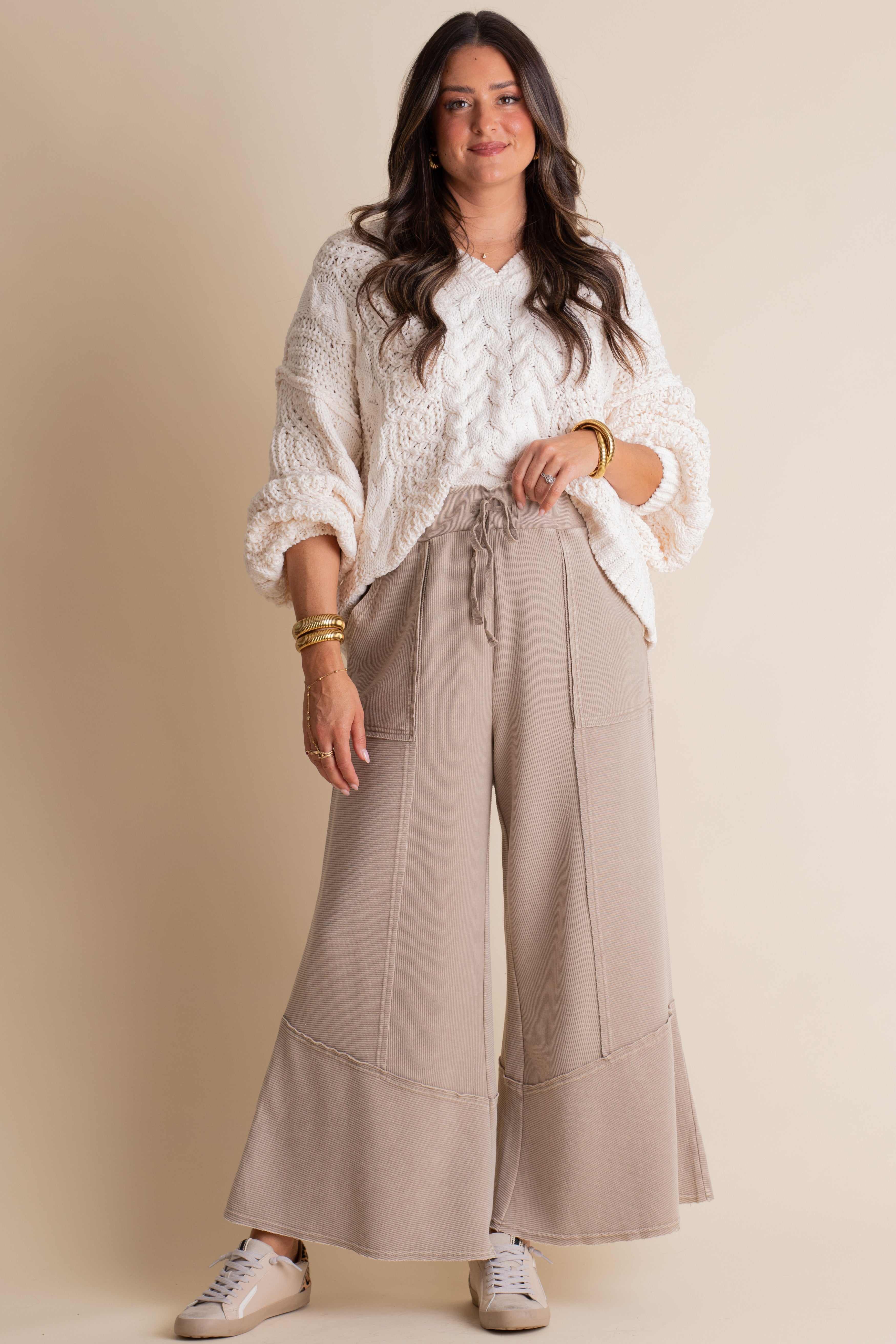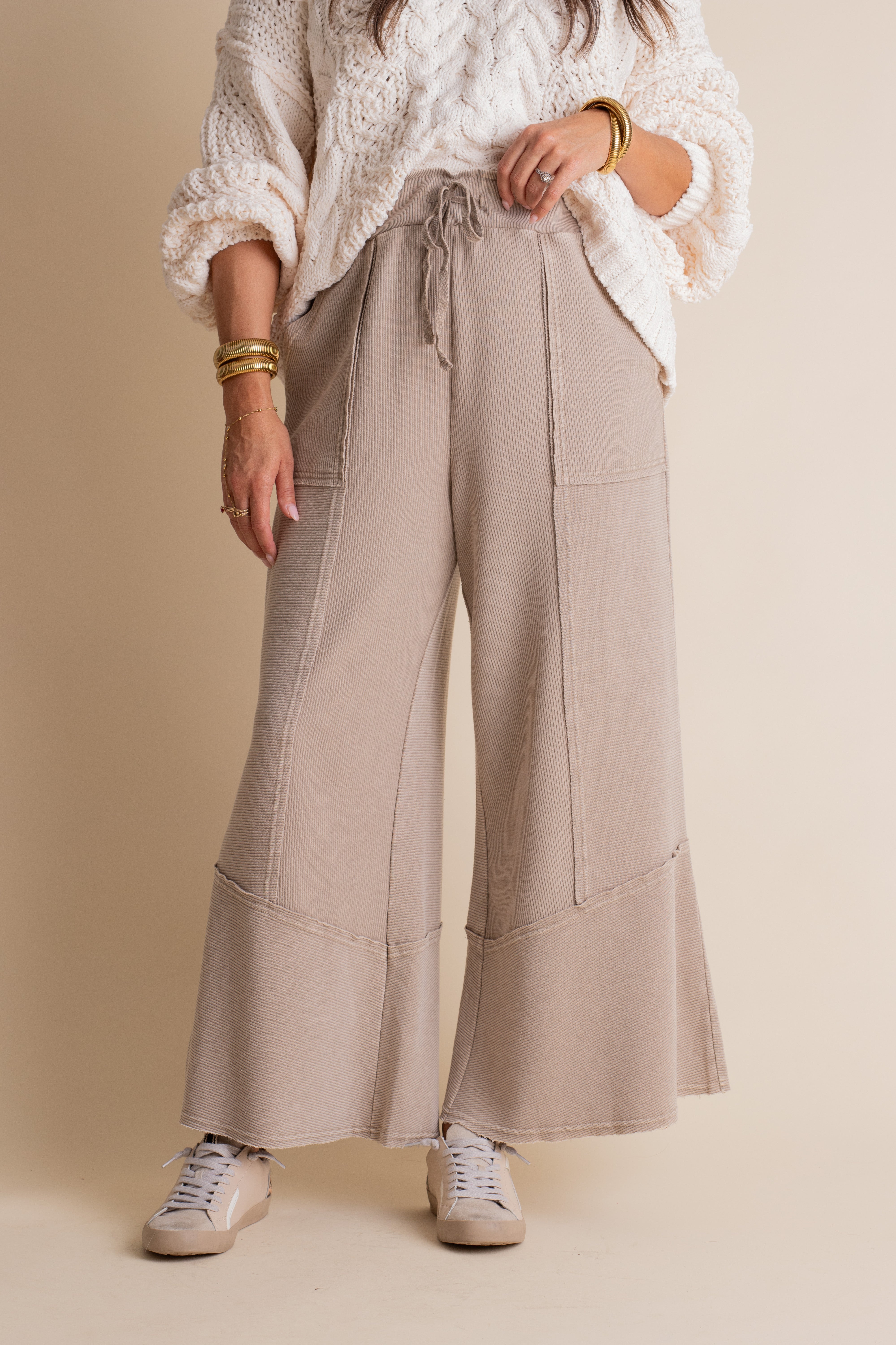 These Mae Textured Mineral Wash Pants bring comfort and style together with their washed ribbed fabric and wide leg fit. Featuring an elastic waistband for easy wear, raw edge seams for a casual vibe, and handy front and back pockets, they’re perfect for lounging or running errands. Pair them with the matching Mae Textured Mineral Wash Top for an effortlessly cute and cozy look that’s ready for anything!