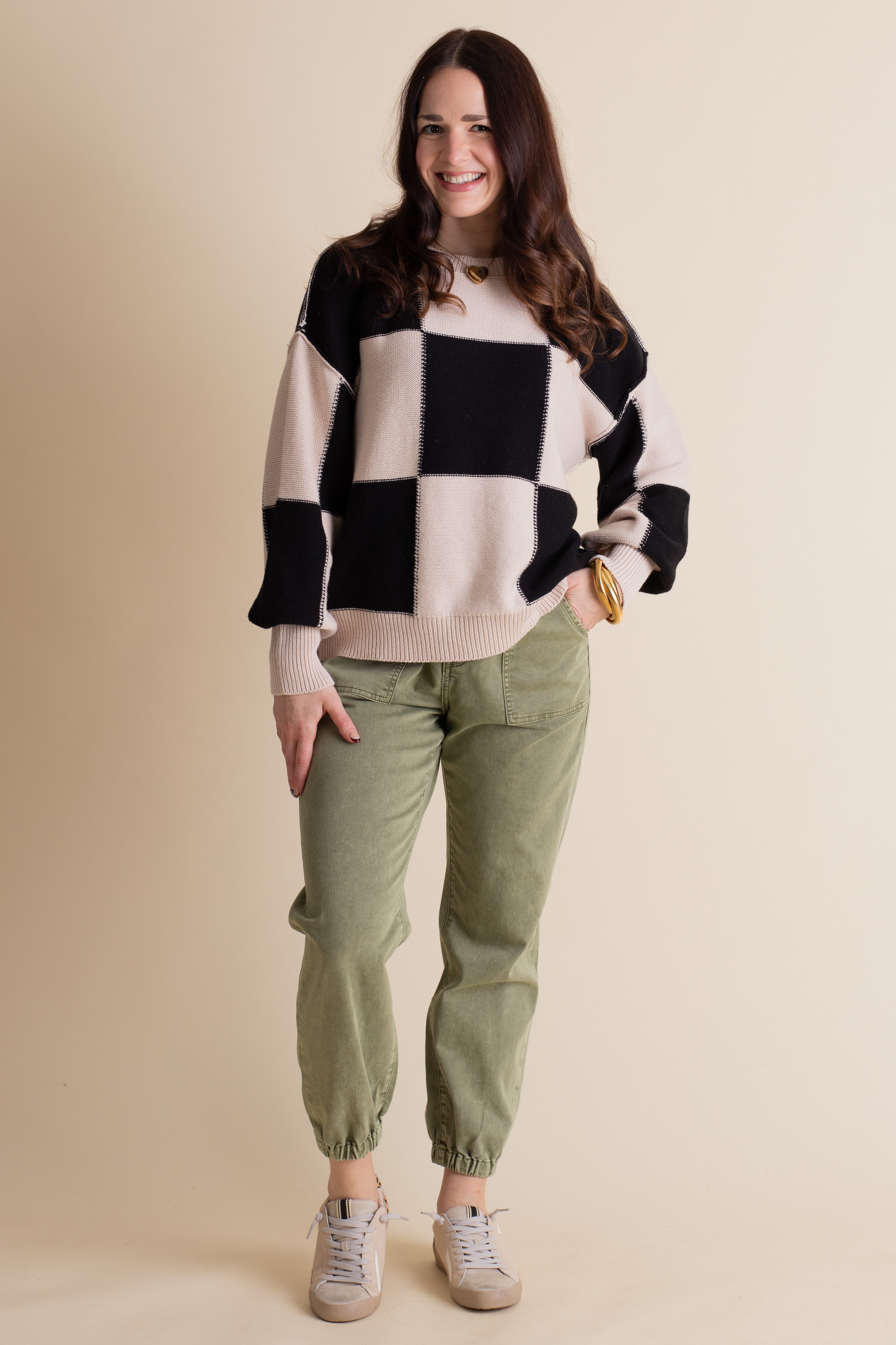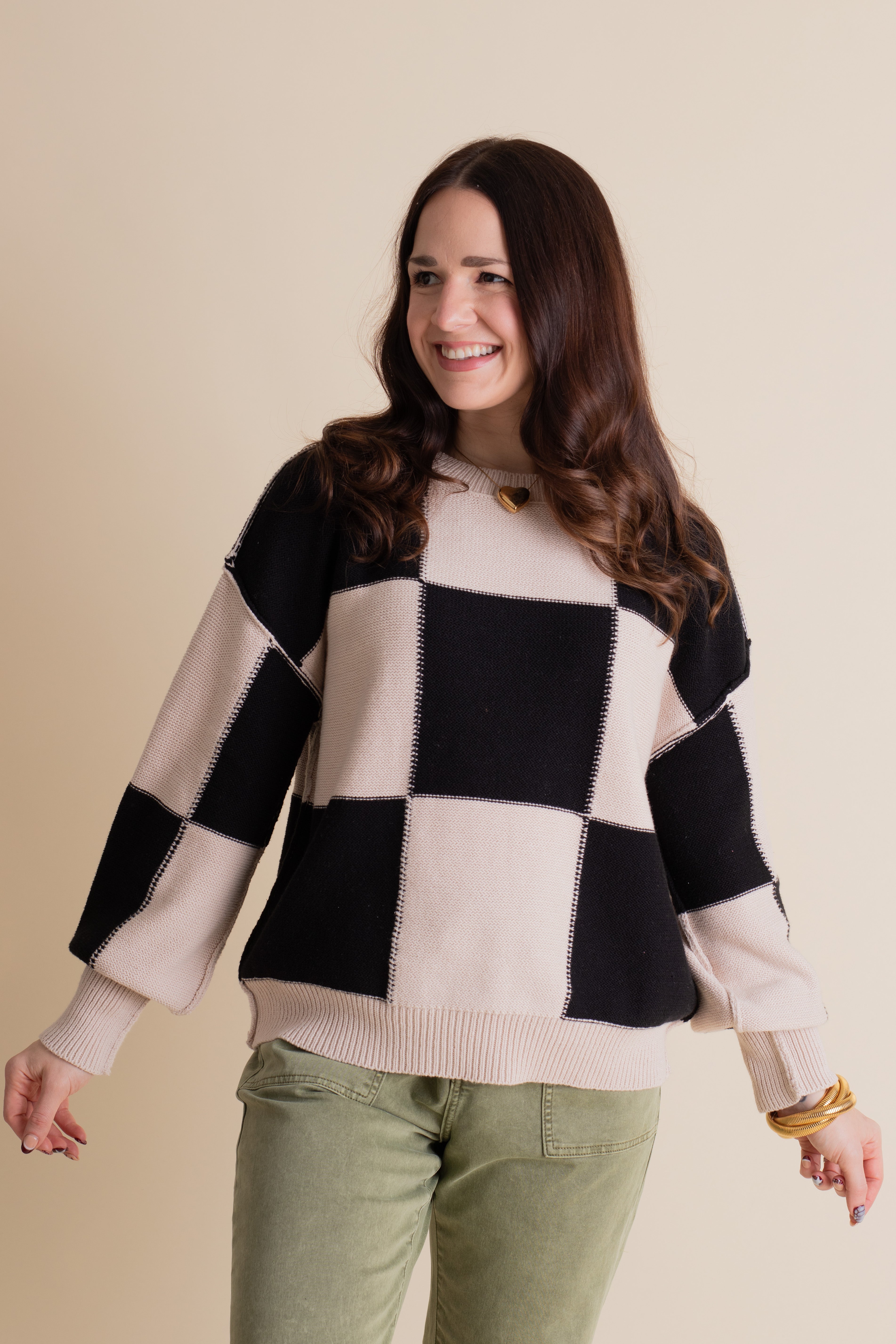 Cozy up in the Best Personality Checkered Sweater, where soft taupe meets bold black in a playful checkered design. Featuring dolman sleeves and raw edge seams, this relaxed-fit sweater brings casual comfort with an unexpected twist. Ribbed trims add just the right touch of structure—perfect for layering or wearing solo when you want to stand out with effortless charm. Limited stock and available in sizes small through large!