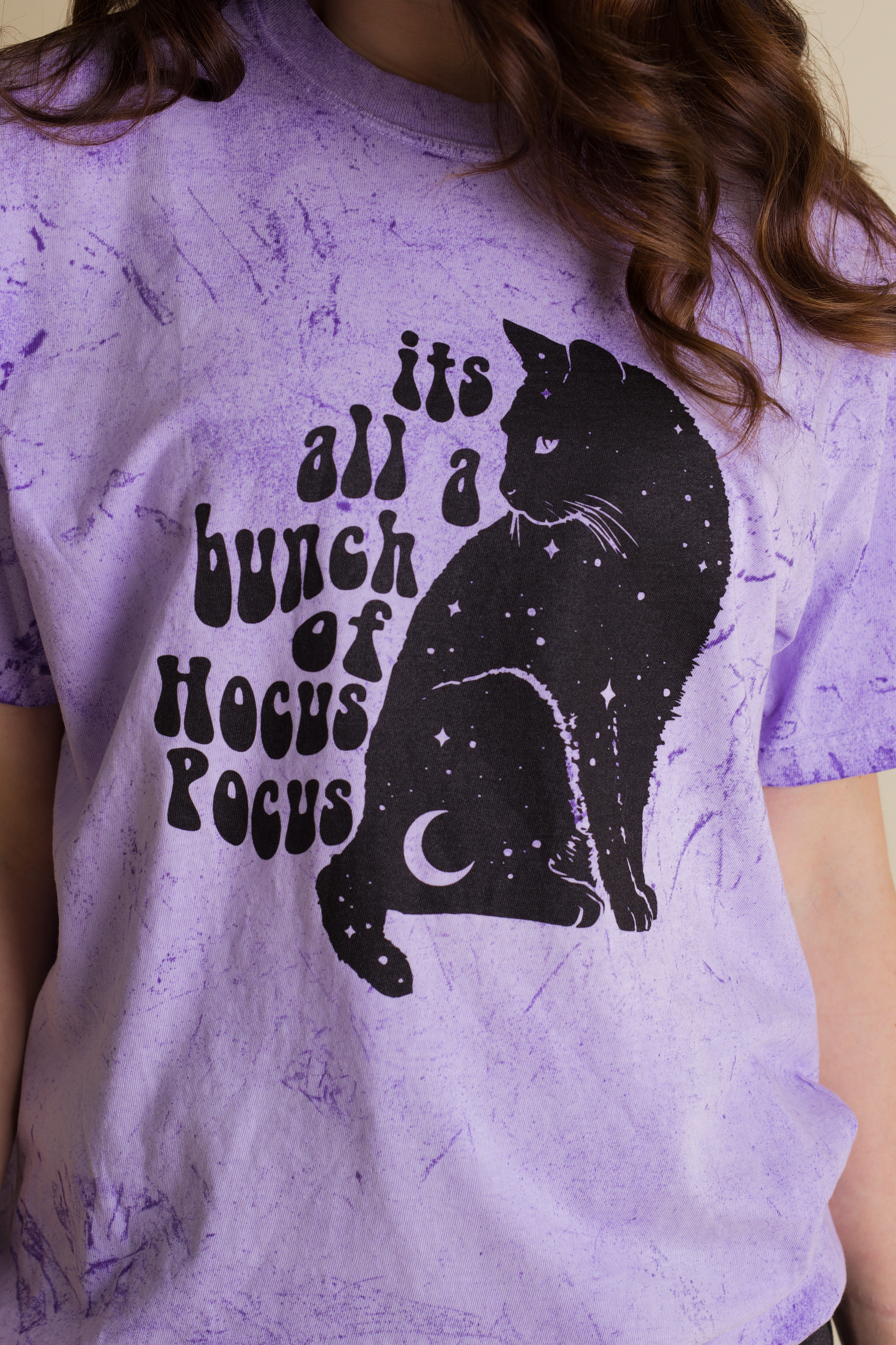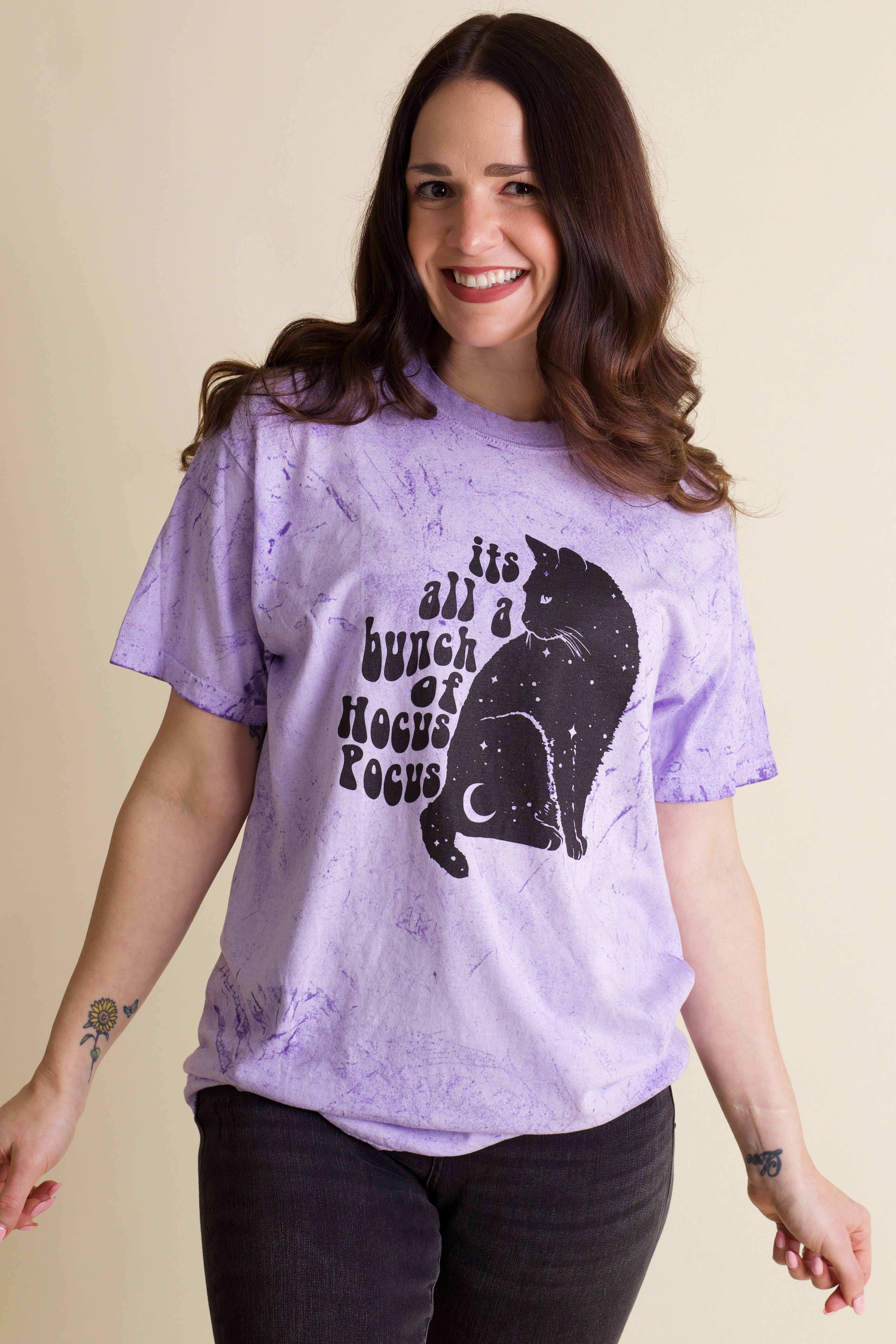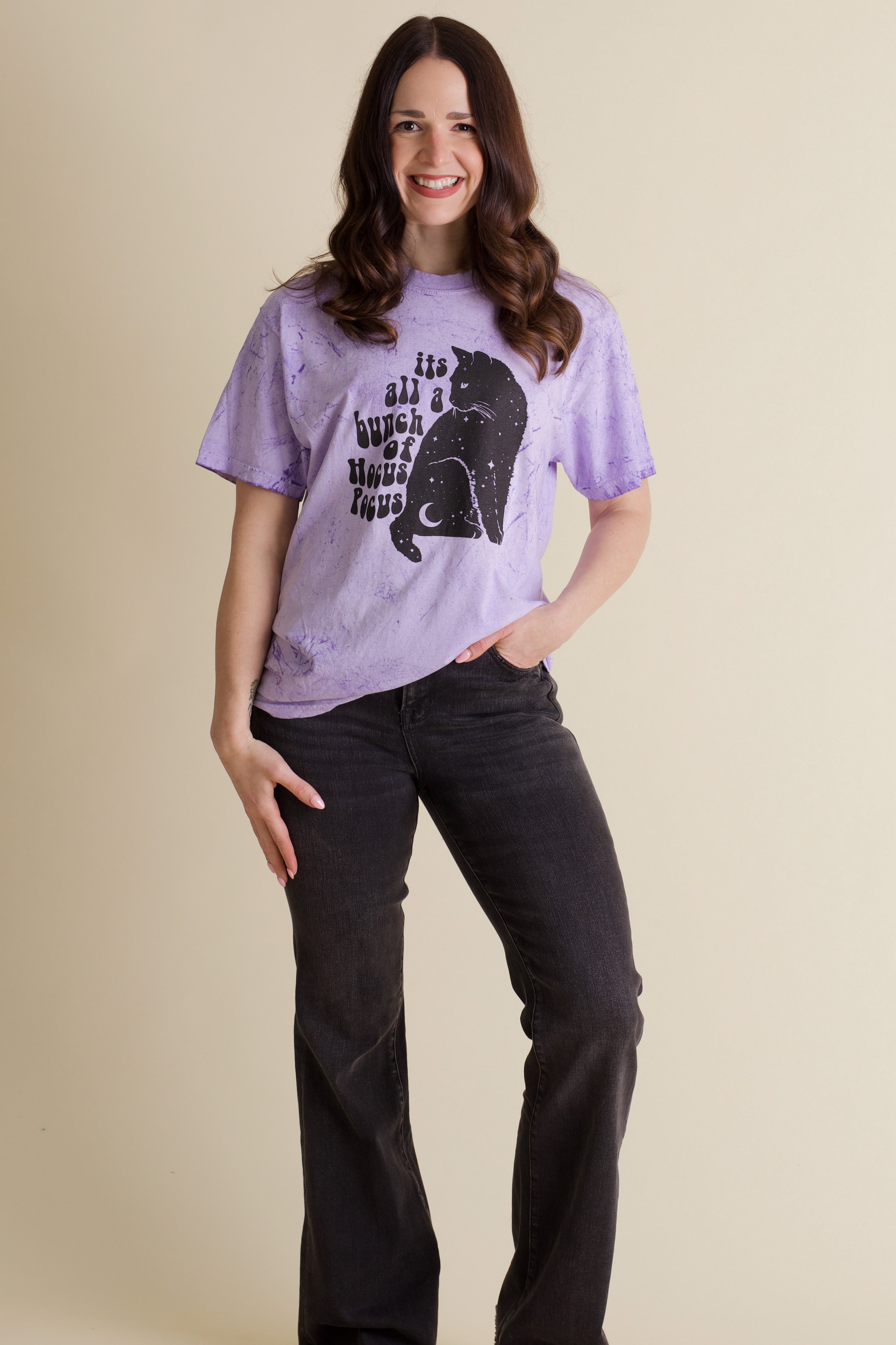 Celebrate spooky charm with the Bunch Of Hocus Pocus Tee! Featuring a black cat graphic printed on a soft, purple acid wash comfort colors tee, this playful shirt brings a touch of magic to your wardrobe. Perfect for fans of fun and mischief, it’s comfy and eye-catching for any casual day.
