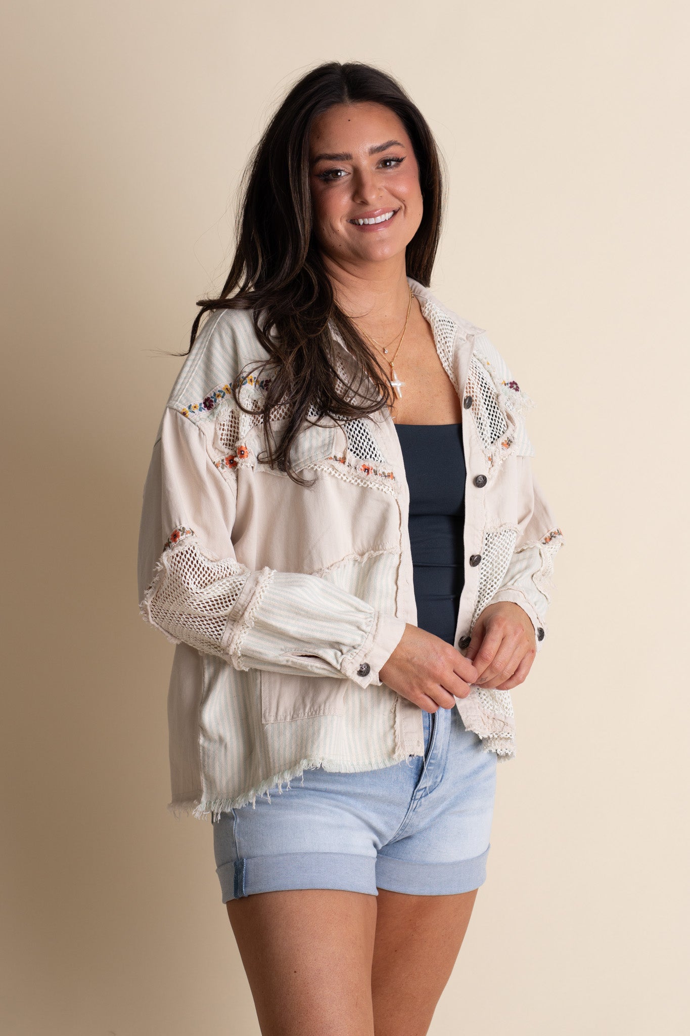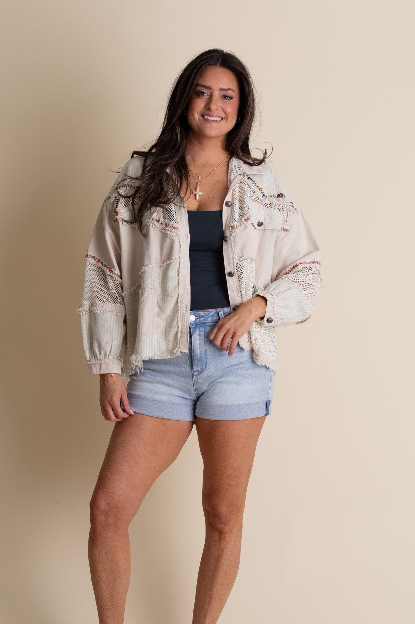 Get ready to elevate your style with our After Hours Balloon Sleeve Shacket. Made from a comfortable blend of cotton and woven mesh, this shacket features unique striped patterns and stunning floral embroidery. The raw edge seams and ornate buttons add a touch of sophistication, while the collared neckline, front pockets, and oversized fit make it both functional and fashionable. Upgrade your wardrobe today! Limited stock and available in sizes small through large!
