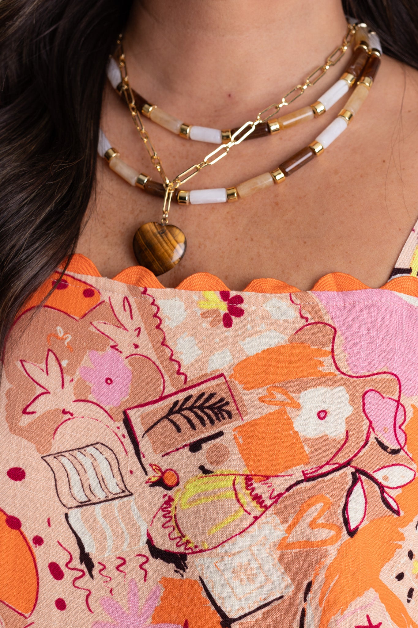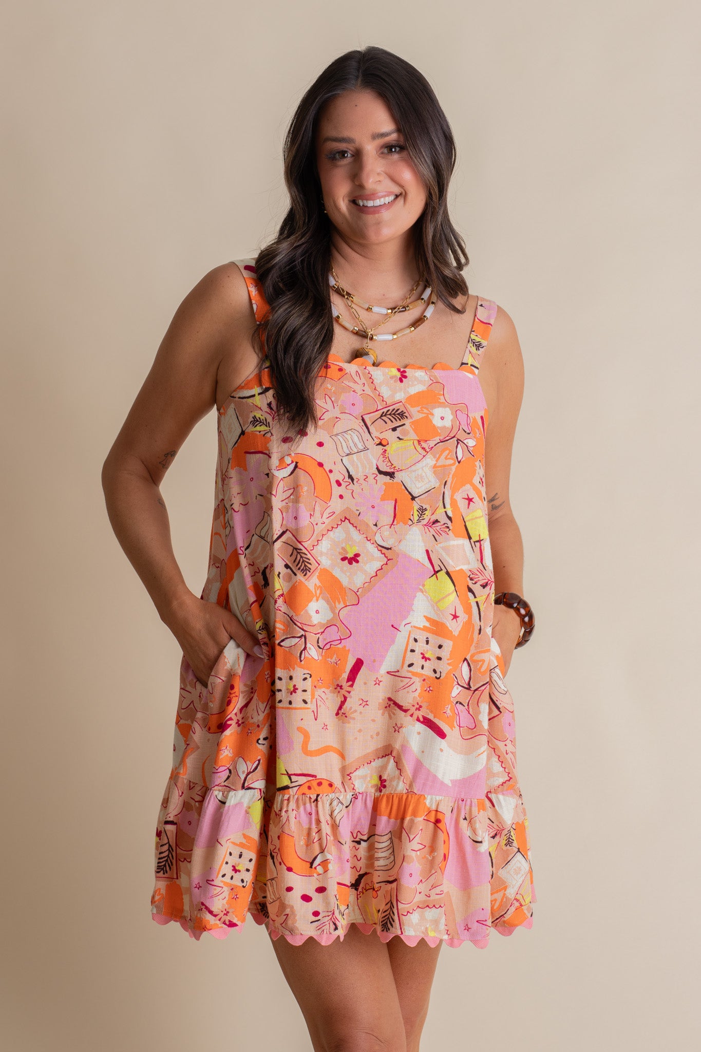 Playful, vibrant, and full of personality, this printed mini dress is made to stand out. Featuring a colorful abstract pattern in soft peach, pink, and orange tones, it brings a fresh pop of fun to your wardrobe. The scalloped neckline and hem add a sweet, feminine touch, while the relaxed silhouette keeps it effortless and comfortable.