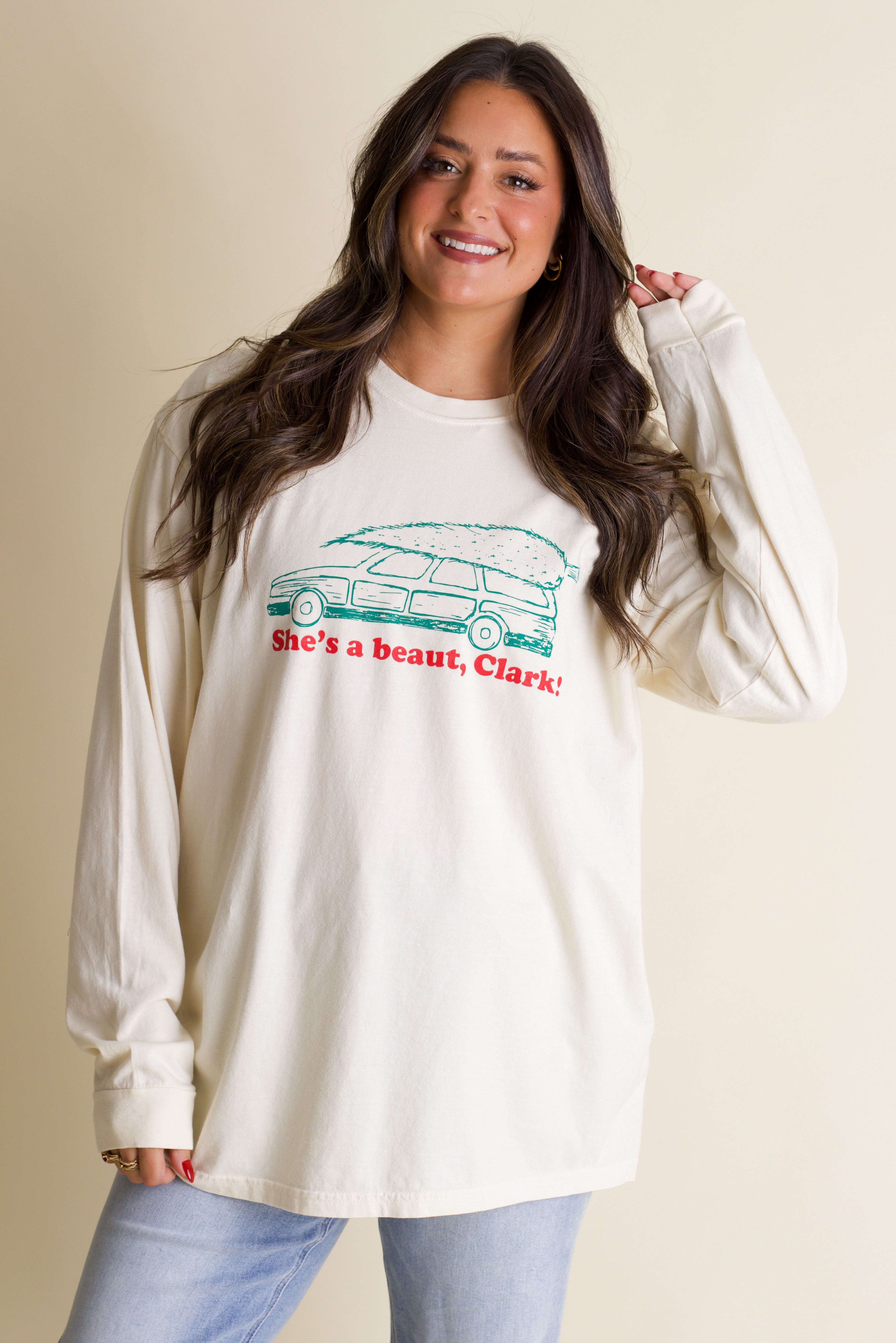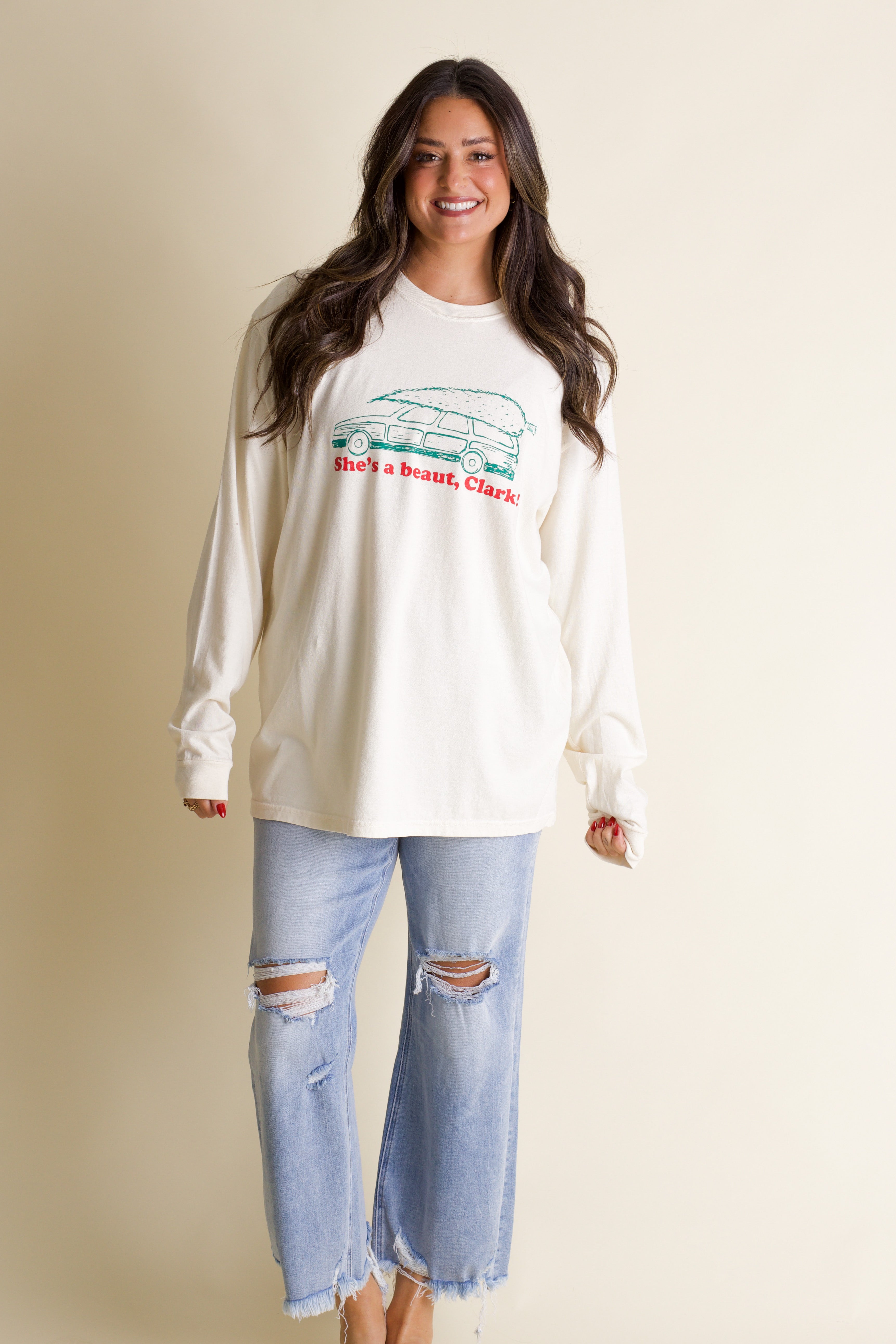 Calling all Christmas Vacation devotees! Rock this iconic holiday tee featuring the legendary "She's a Beaut, Clark!" quote screen printed in vibrant red across a charming green Volkswagen adorned with a festive Christmas tree. Crafted from soft Comfort Colors fabric, this long sleeve tee delivers cozy style perfect for holiday gatherings, ugly sweater parties, or lazy winter days. Whether you're quoting the cult classic or just spreading seasonal cheer, this in-house screen printed design captures the quirky magic of the beloved film. A must-have for fans who appreciate humor, nostalgia, and comfort rolled into one wearable tribute. Limited stock and available in sizes small through 3XL!
