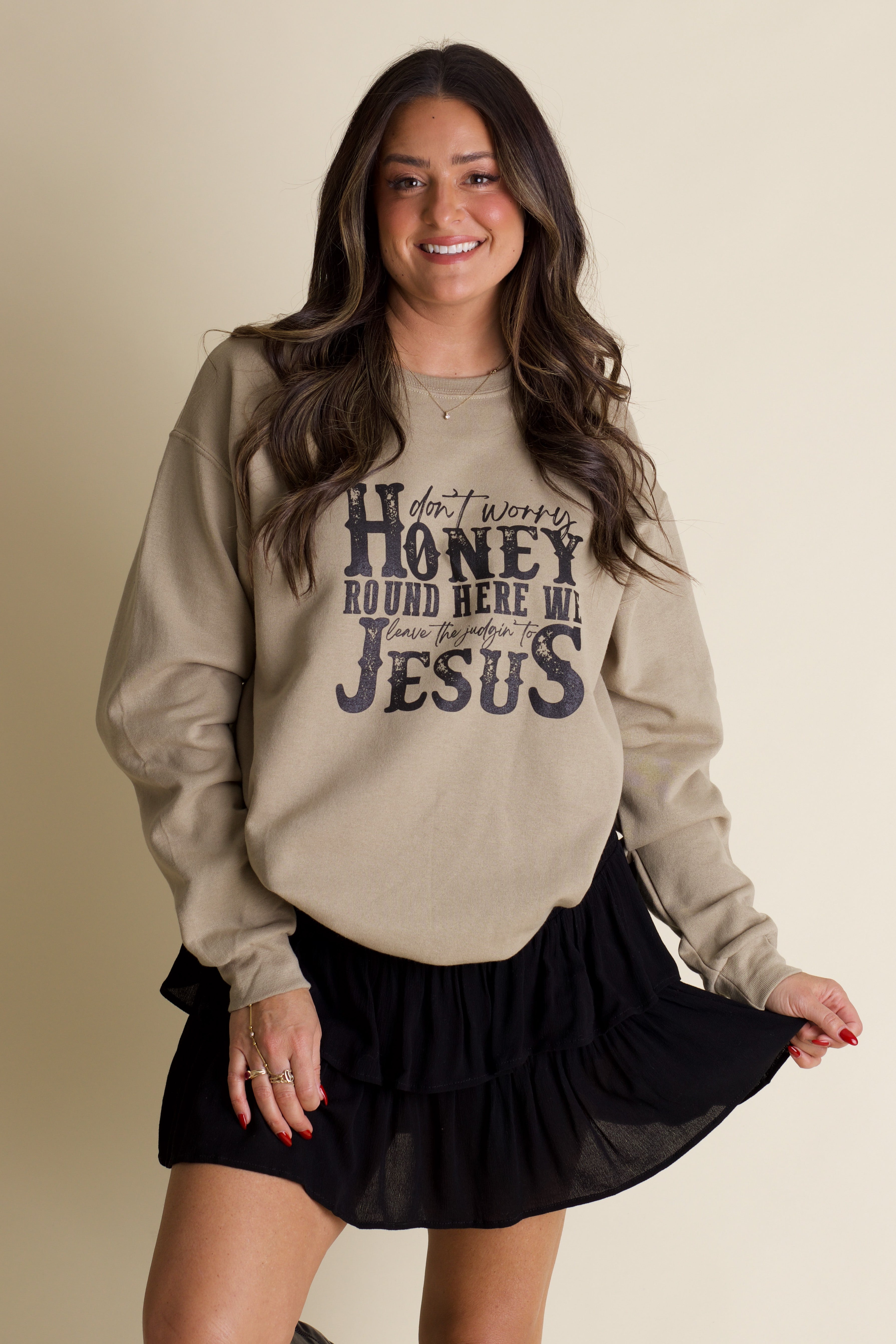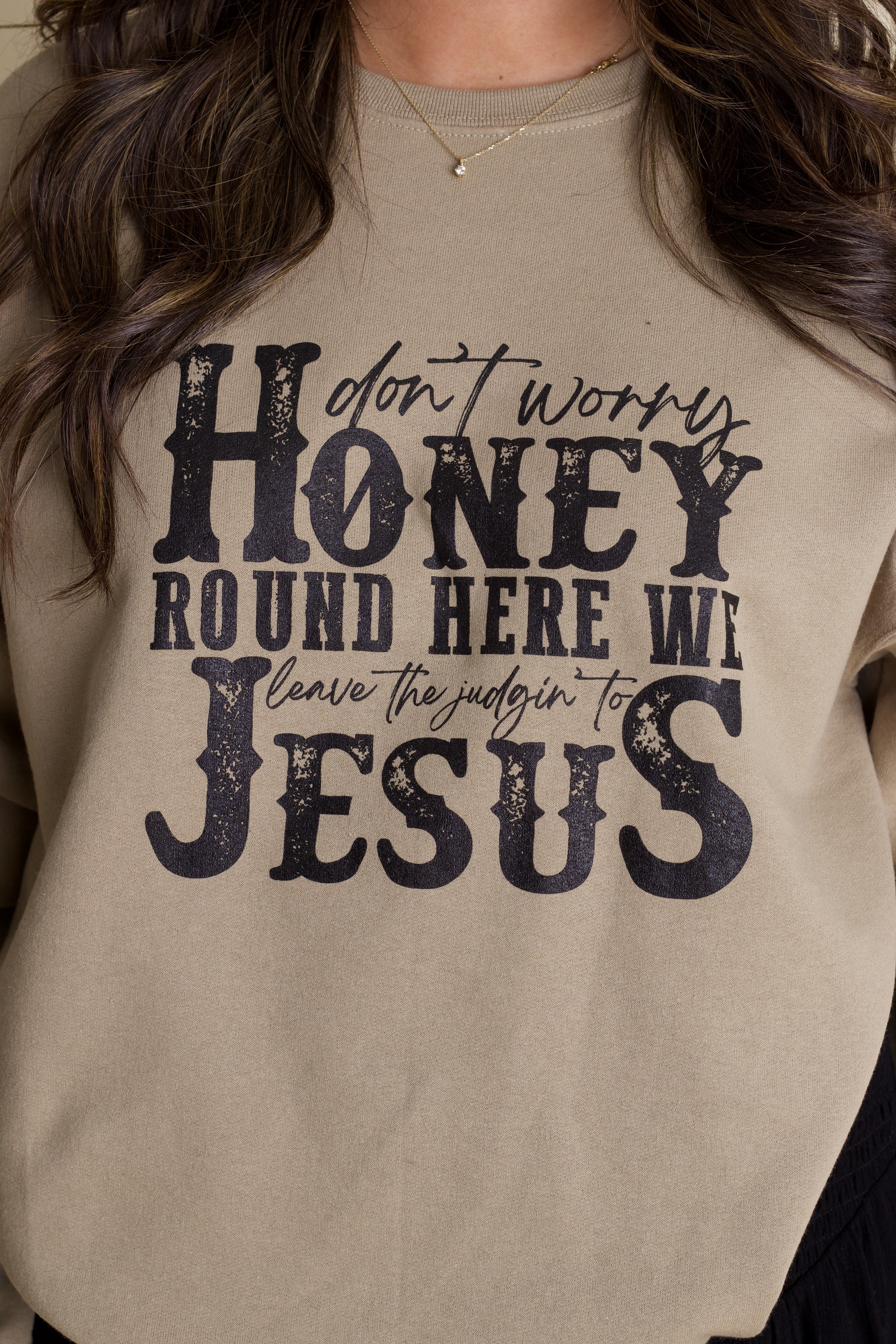 Don't worry honey—round here we leave the judgin' to Jesus! Rock this cozy sage sweatshirt featuring our in-house screen-printed design. Crafted from soft fleece lining, it's the perfect blend of comfort and attitude. Whether you're lounging at home or making a statement out and about, this sweatshirt delivers both warmth and personality. A must-have piece that speaks volumes without saying much at all. Limited stock and available in sizes small through 3XL!