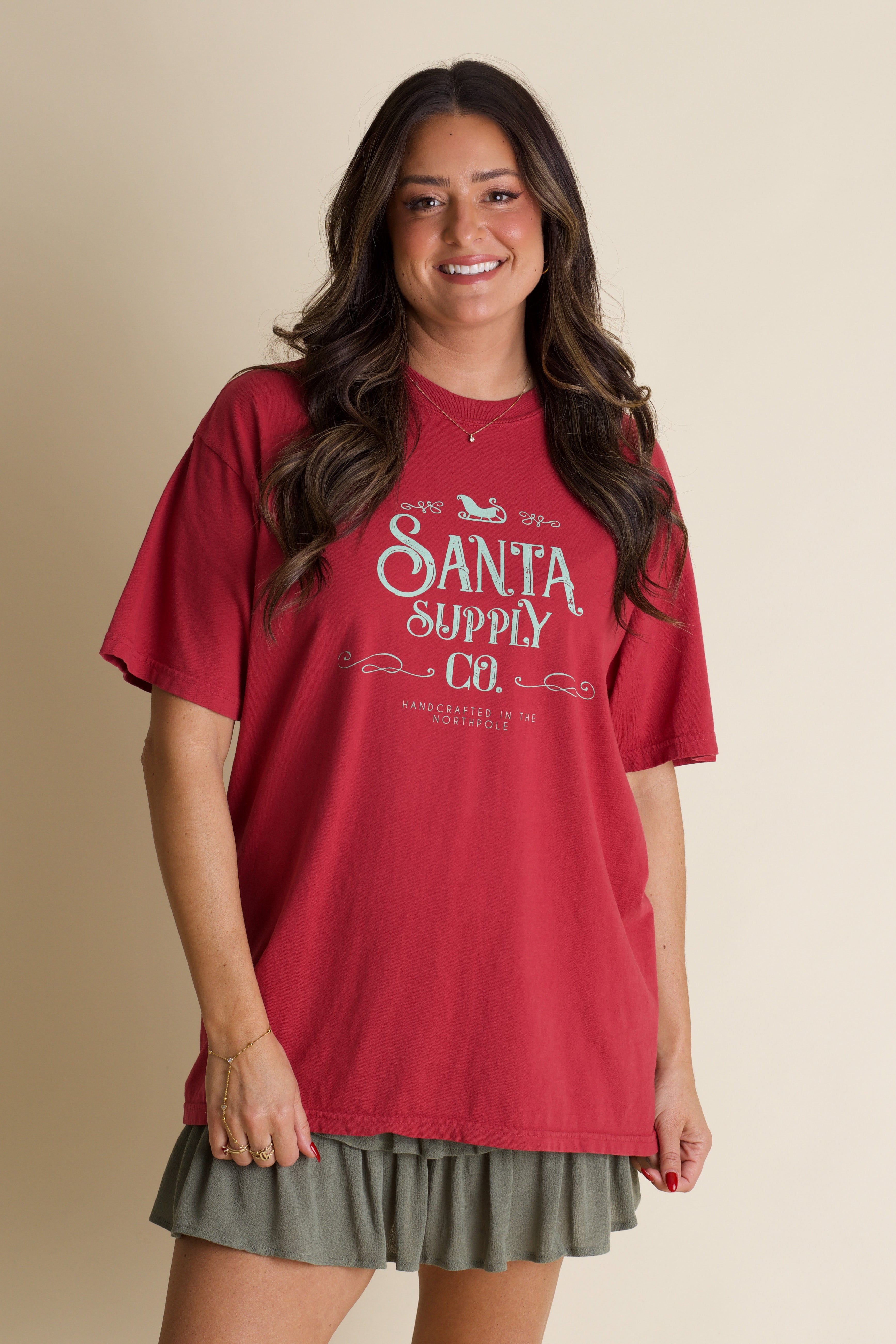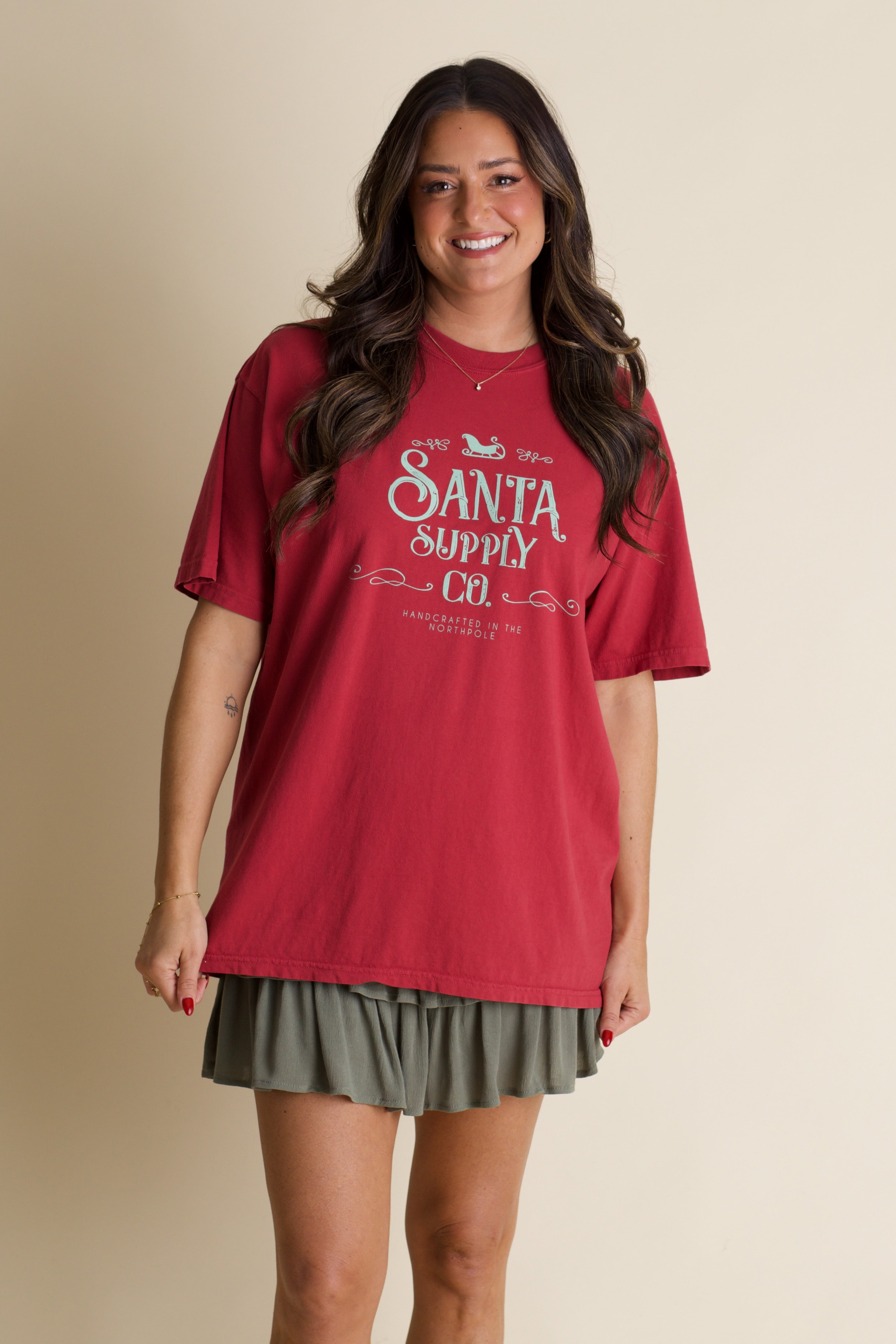 Get ready to spread holiday cheer with this adorable Santa Supply Co tee! Featuring a charming light green graphic celebrating handcrafted magic from the North Pole, this playful design is screen printed in-house on a luxuriously soft red Comfort Colors tee. Perfect for festive gatherings, cozy nights in, or anyone who loves a touch of whimsy during the season. It's the ultimate holiday essential that brings joy and personality to your wardrobe! Limited stock and available in sizes small through 3XL!