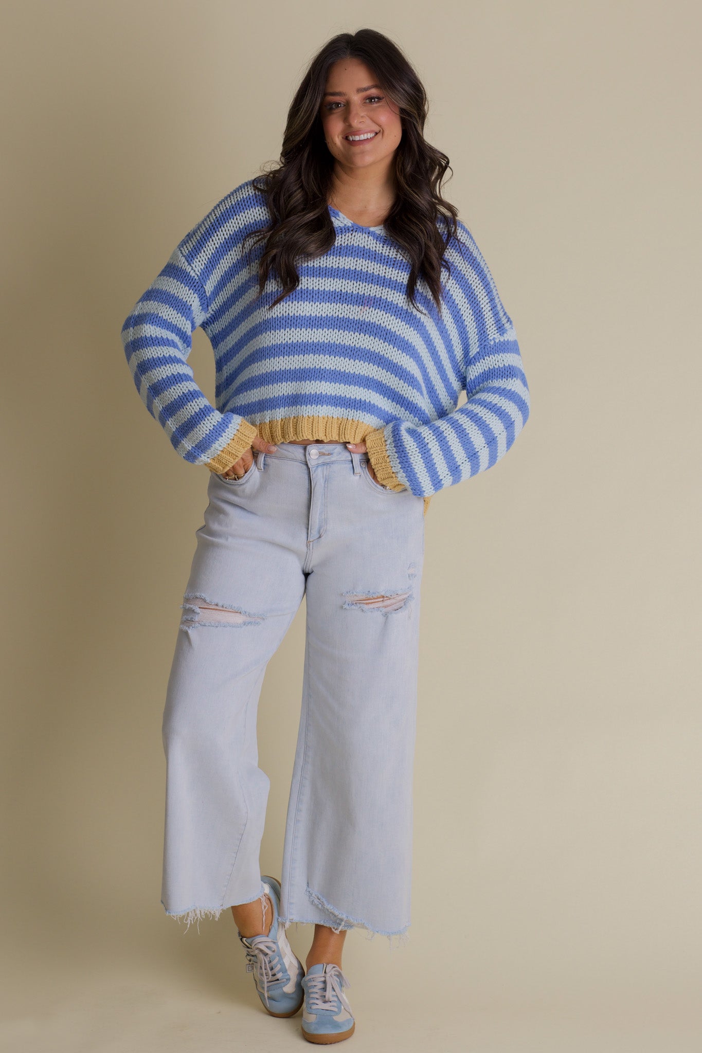 Wrap yourself in warmth and style with the Quick Trip Striped V Neck Sweater. This cozy chunky knit features playful blue stripes accented by a cheerful mustard trim. The dolman balloon sleeves add a fun, roomy feel, while side slits and a relaxed boxy fit keep things comfortable and carefree. Perfect for spontaneous adventures or lazy days, this sweater brings a splash of joy to every outfit. Limited stock and available in sizes small through large!