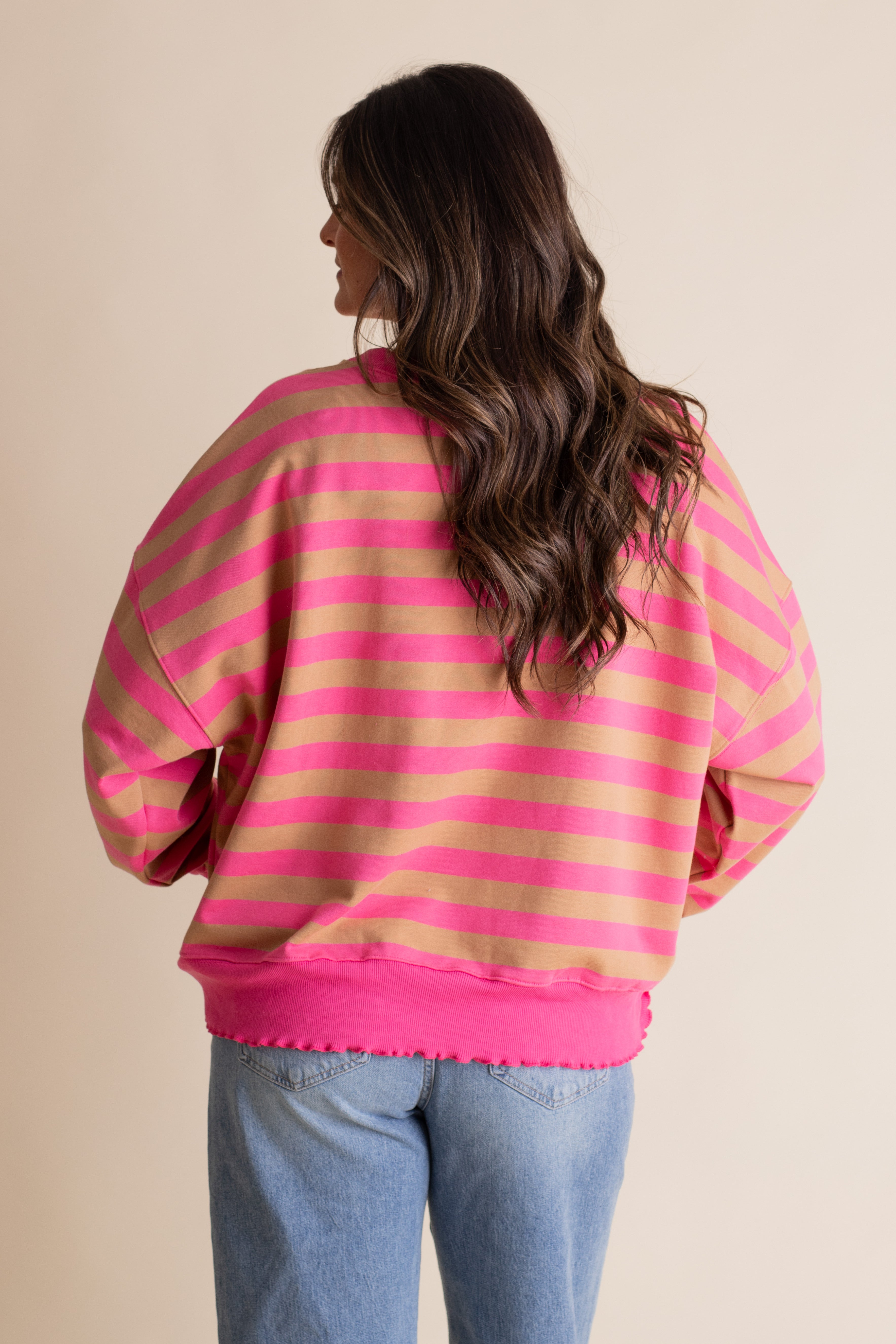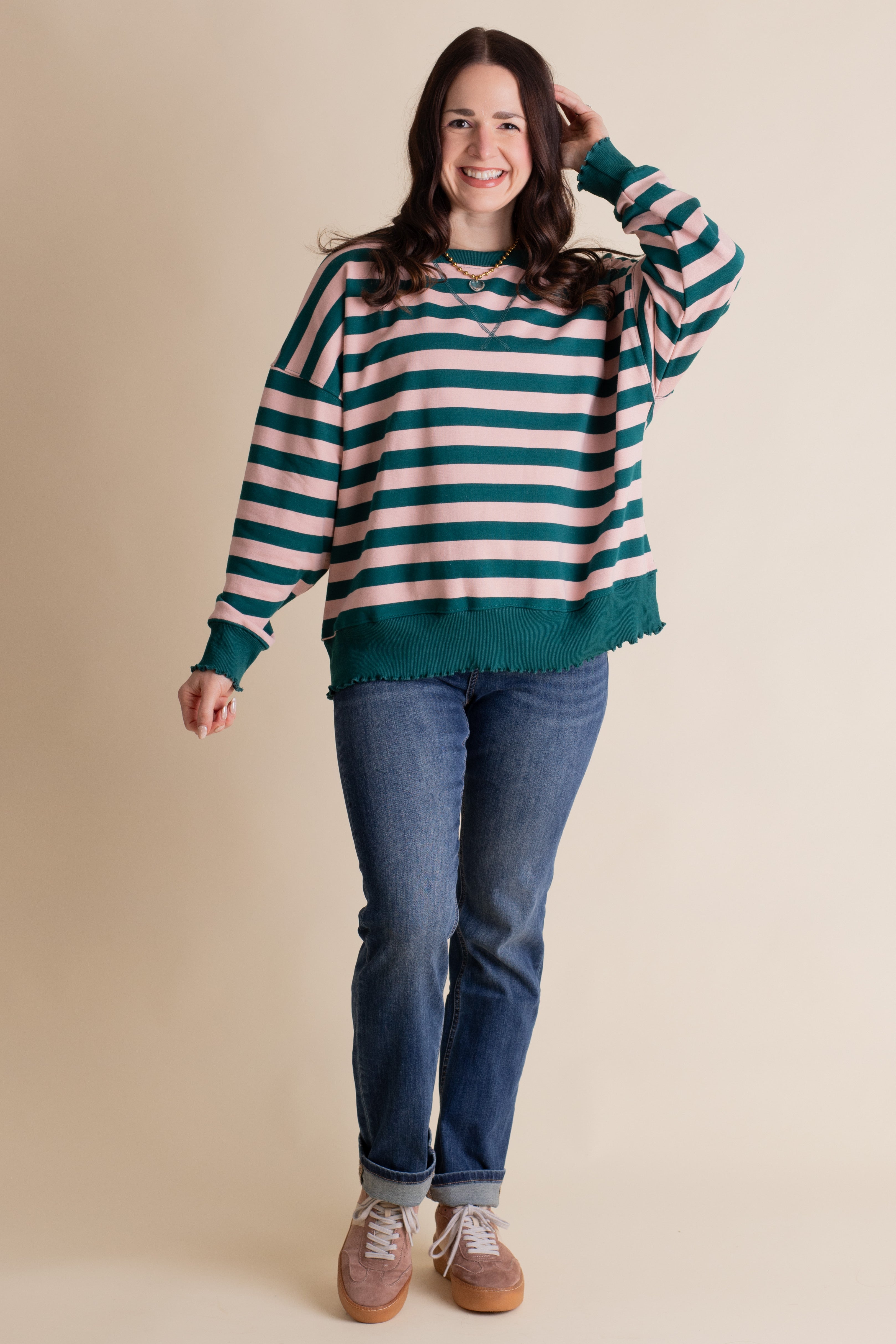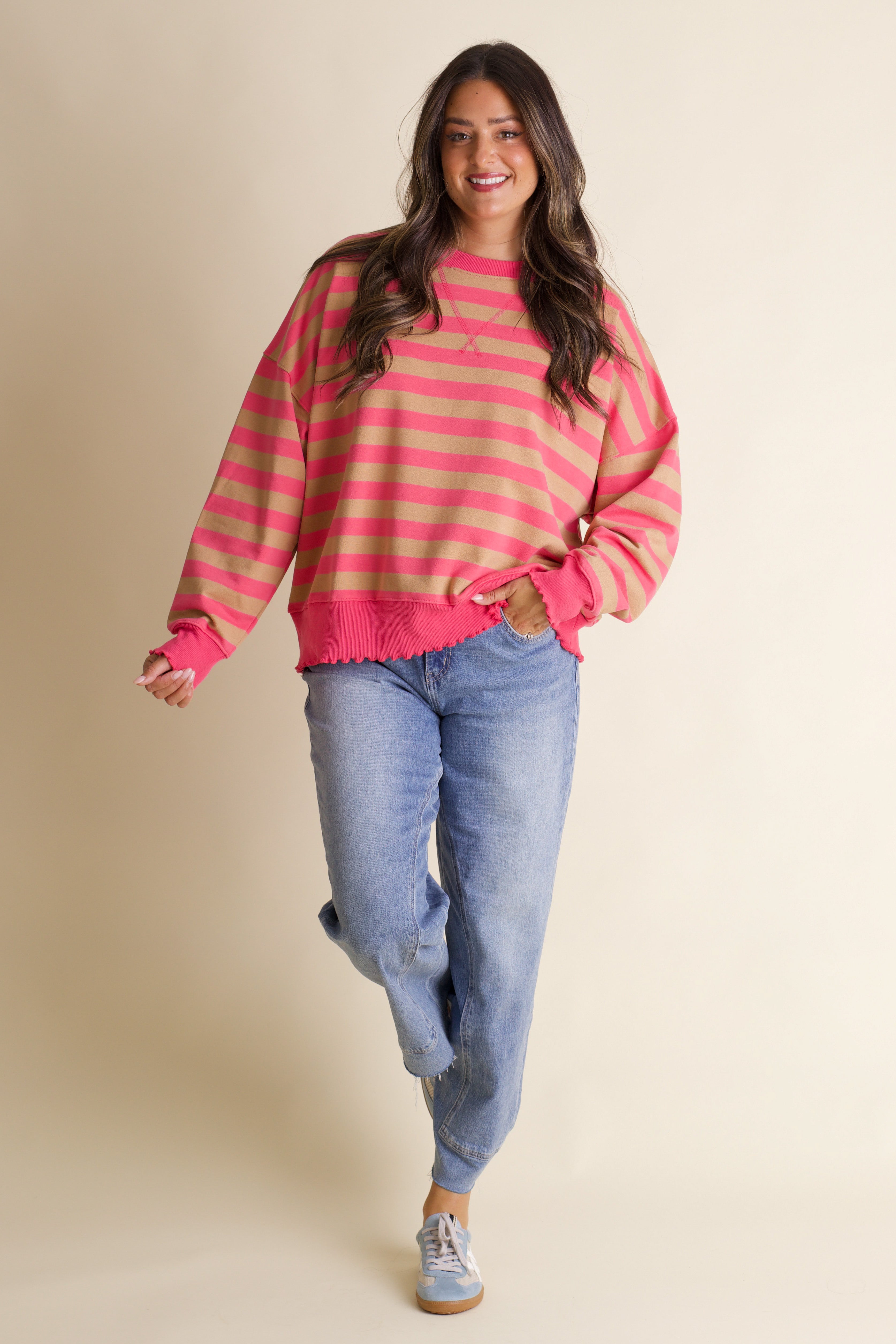 Cozy meets cute in this Forget Me Not Striped Pullover. With its soft terry knit and playful ribbed ruffled trim, it adds just the right amount of charm to your everyday look. The oversized fit makes it perfect for layering or lounging, wrapping you in comfort while keeping your style effortlessly fun. Available in 2 color options and sizes small through large!