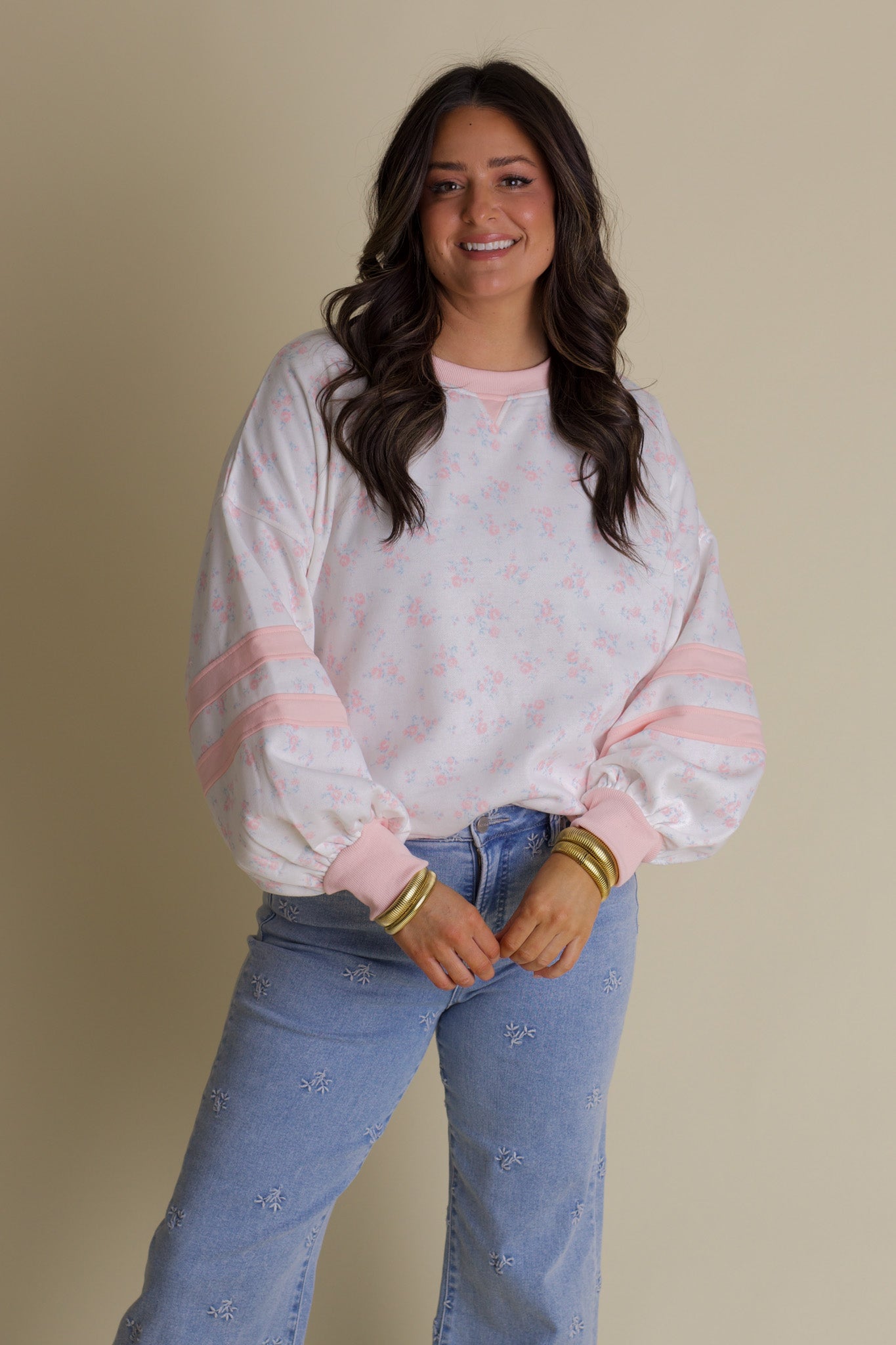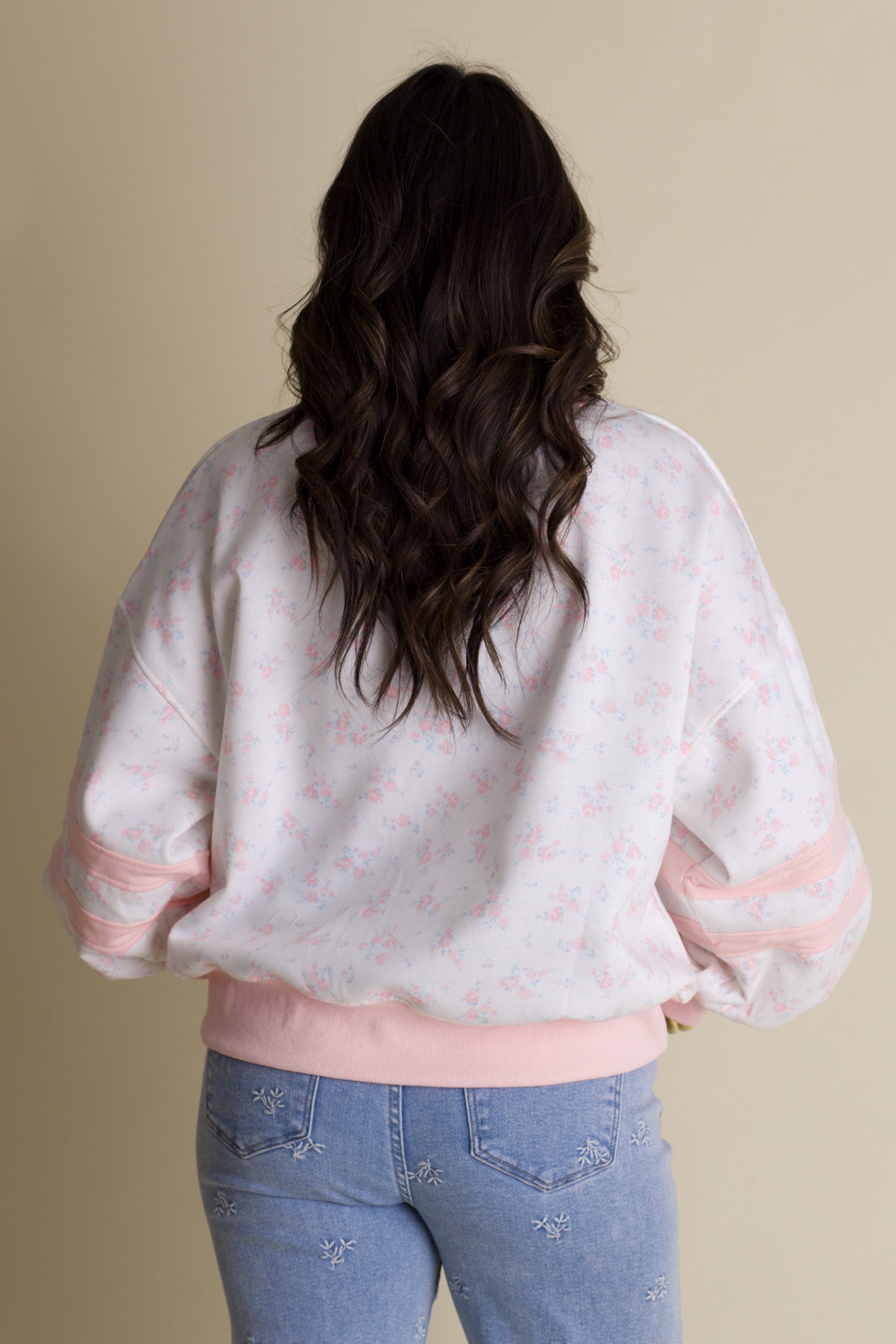 Meet your new wardrobe MVP—a sweatshirt that's equal parts cozy and gorgeous. Soft pink florals bloom across a clean white backdrop, while coordinating trim and varsity stripes on the sleeves bring that preppy-cool energy. Perfect for those days when you want to feel put-together without any fuss, this piece transitions seamlessly from coffee runs to hangouts with friends. It's comfort with personality.
