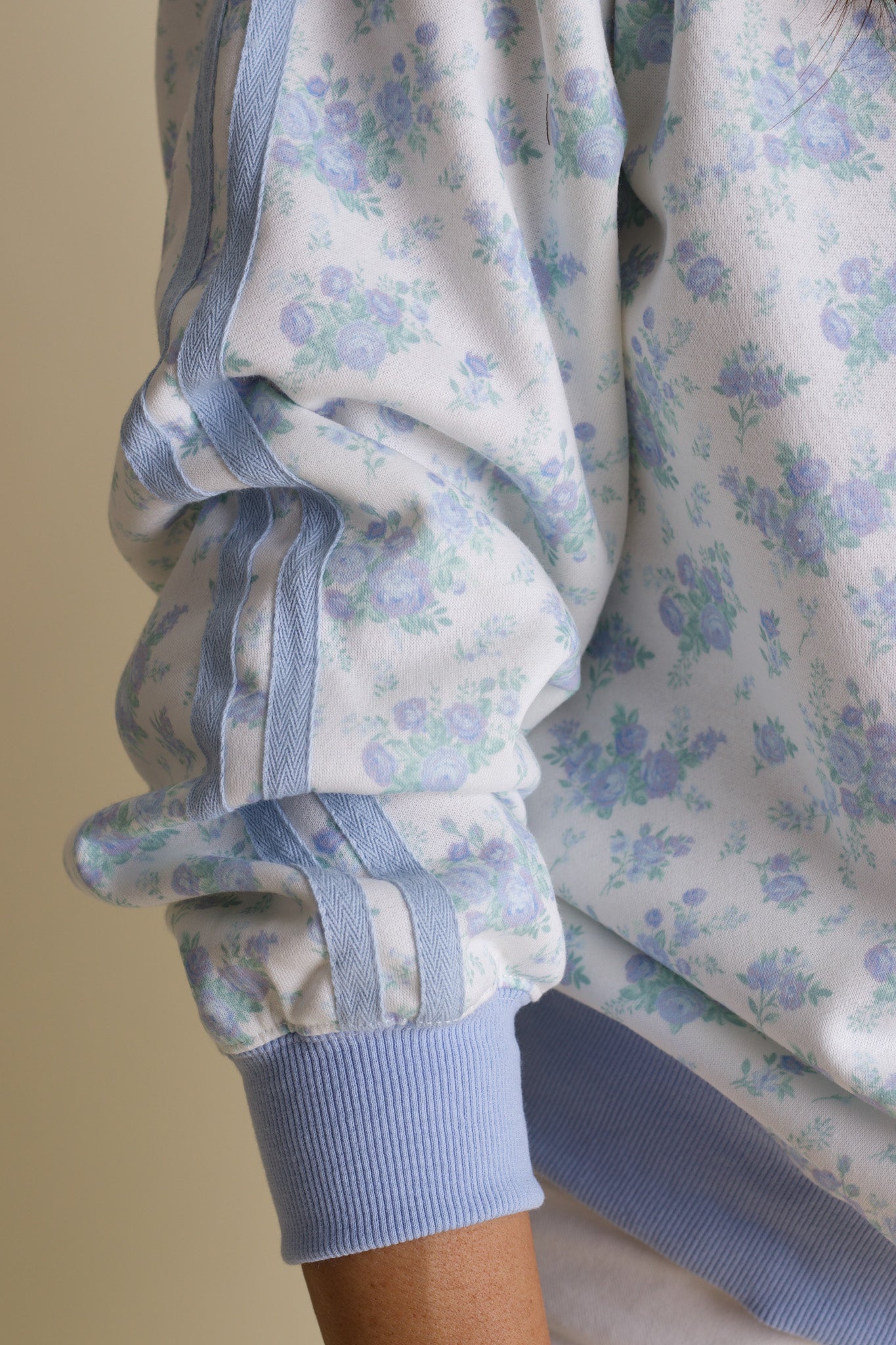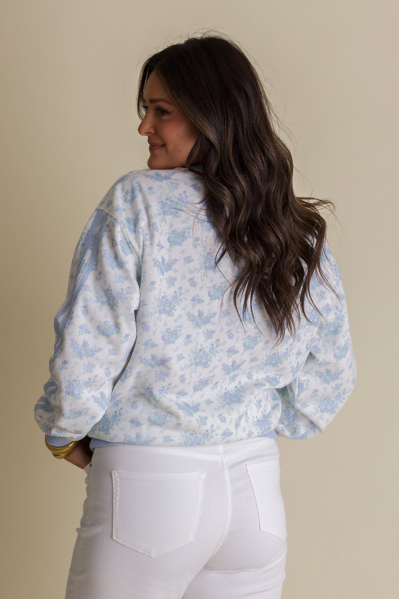 Meet your new go-to sweatshirt—cozy, cute, and full of personality. This crisp white pullover showcases a sweet blue floral design that catches the eye, while coordinating blue trim and a bold double varsity stripe down the sleeve add just the right amount of sporty flair. This playful piece keeps you comfortable and looking effortlessly put-together. It's the kind of sweatshirt that makes you smile every time you reach for it.