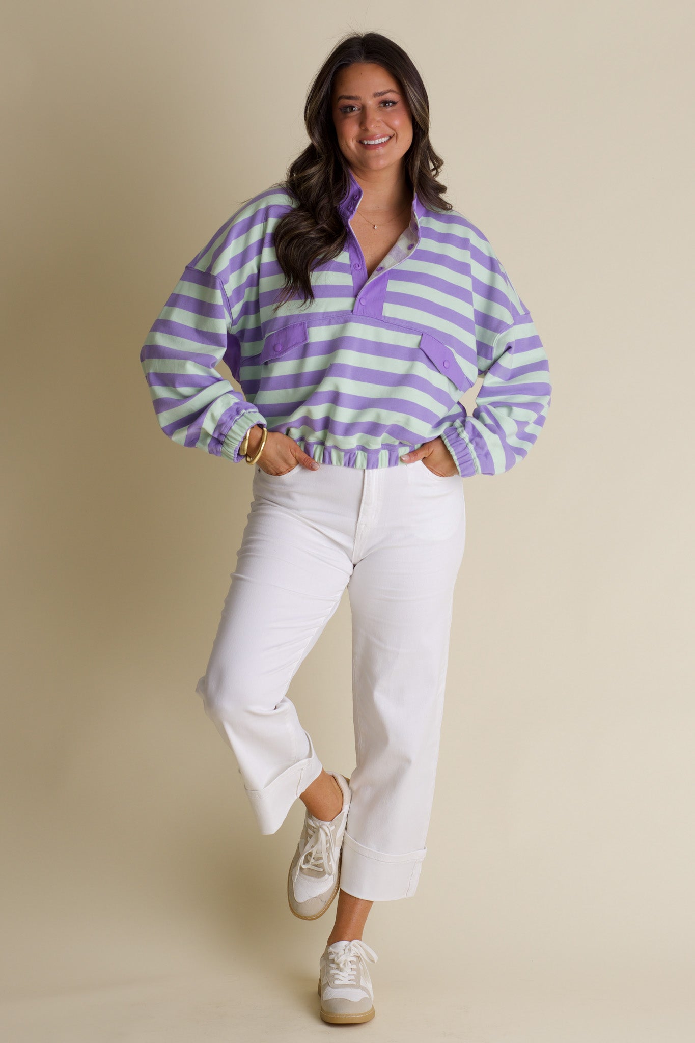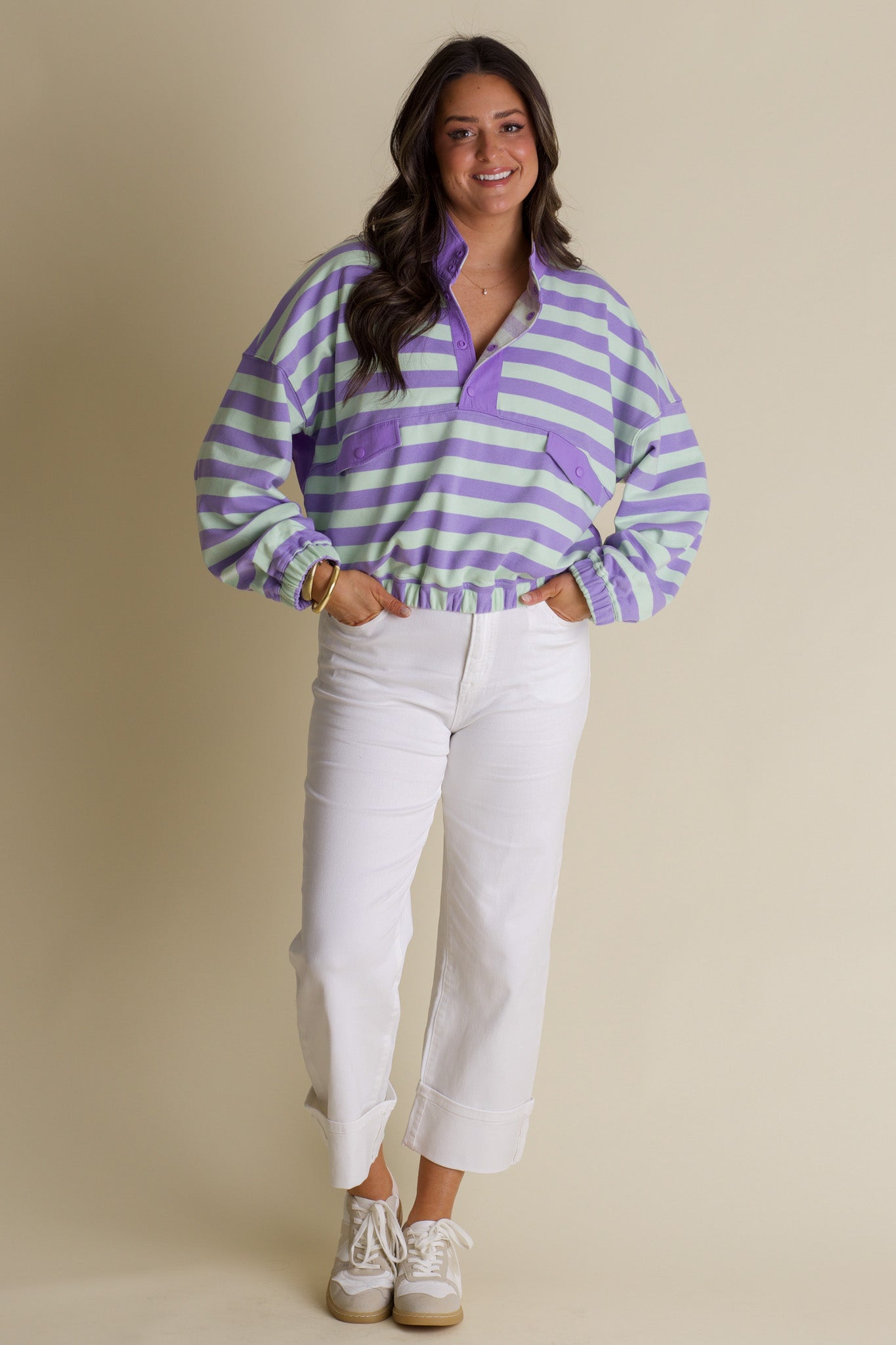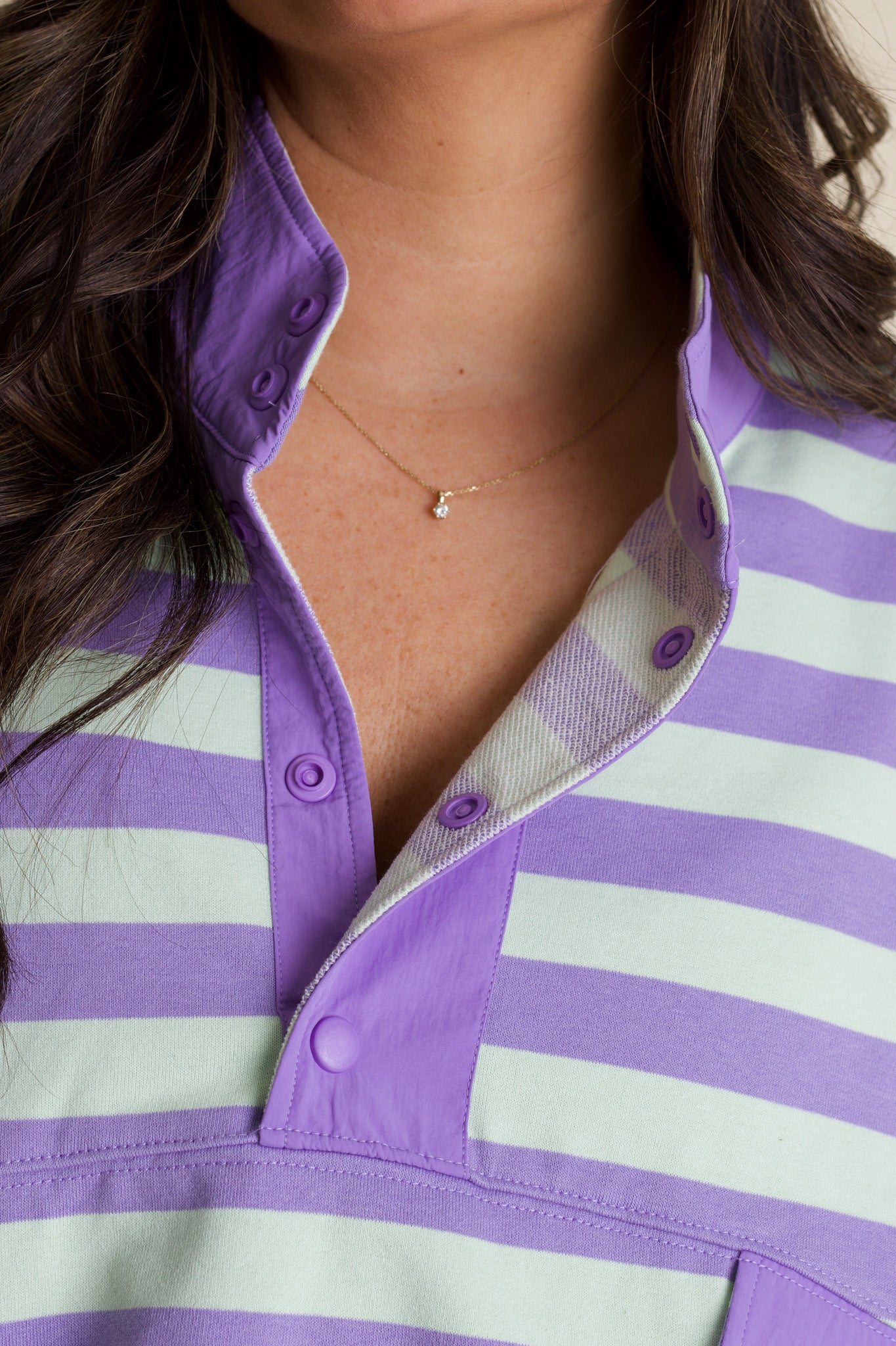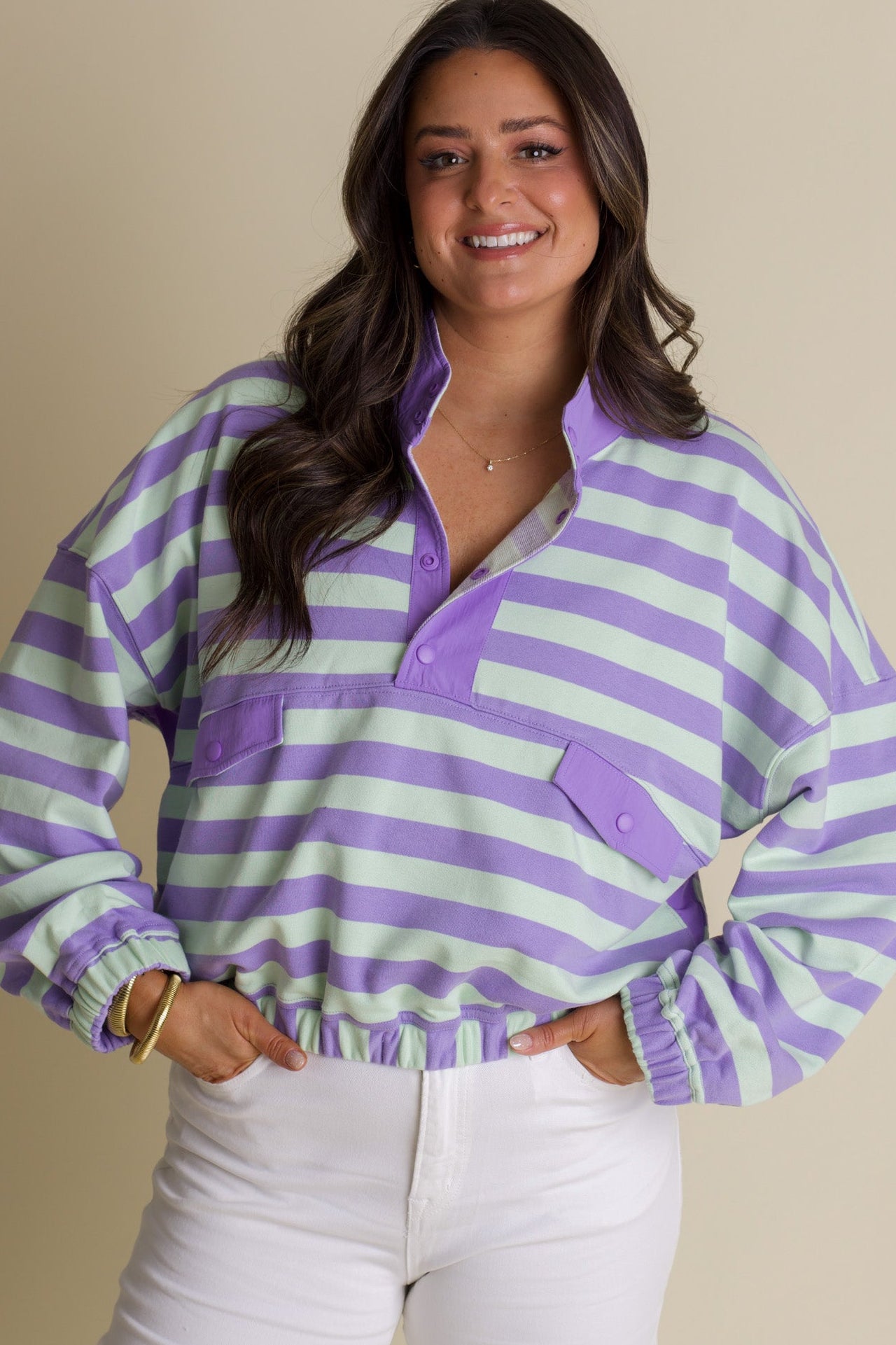 Meet your new favorite casual essential—a button-up henley that's bursting with personality. Dressed in soothing mint and lavender stripes, this top strikes the perfect balance between laid-back and polished. The handy front pocket adds both style and function, while the relaxed henley cut makes it ideal for mixing and matching with your wardrobe. Whether you're running errands or grabbing coffee with friends, this playful striped number keeps you looking effortlessly cool and feeling totally comfortable.