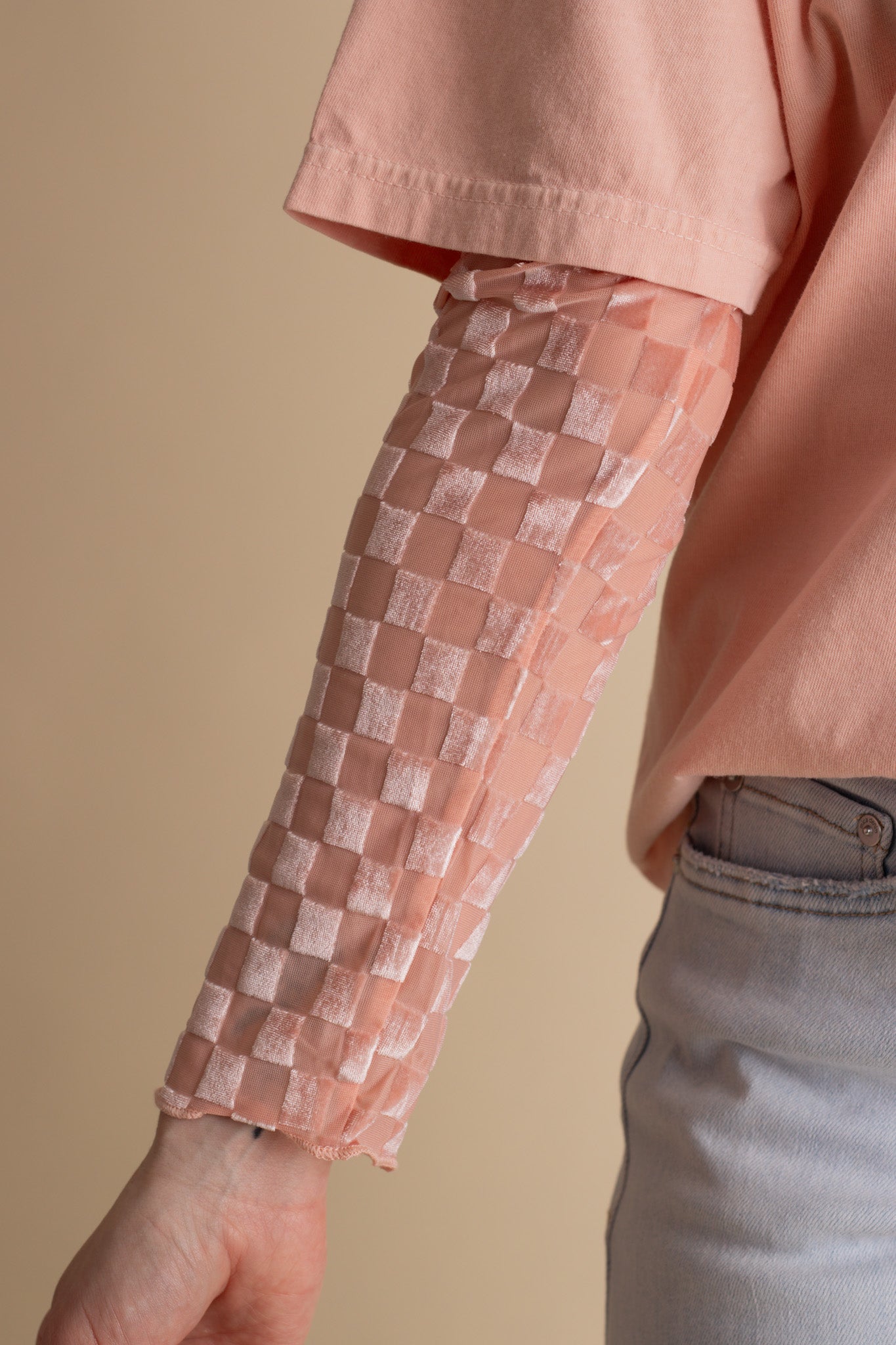 Introducing the On The Run Mesh Top - the perfect addition to your wardrobe! This top features a unique combination of checked mesh and velvet, creating a bold and stylish look. The high neckline and fitted style make it ideal for layering, perfect for any occasion. Get ready to turn heads with this statement piece! Limited stock and available in sizes small through large!