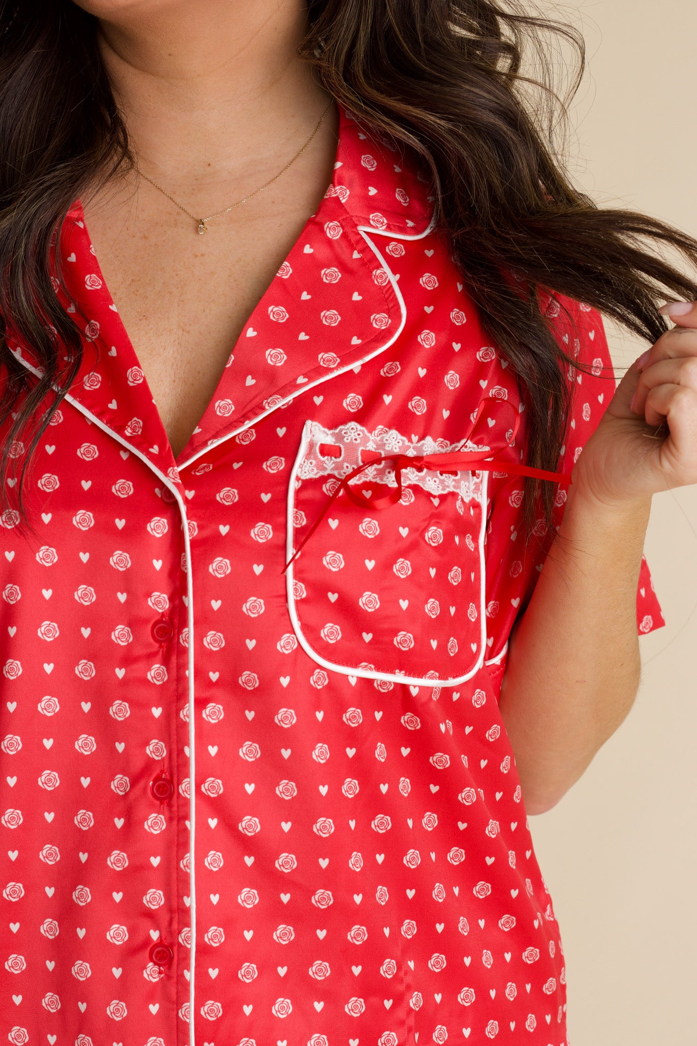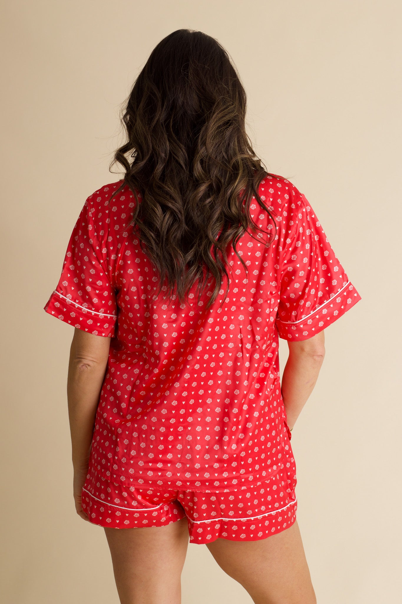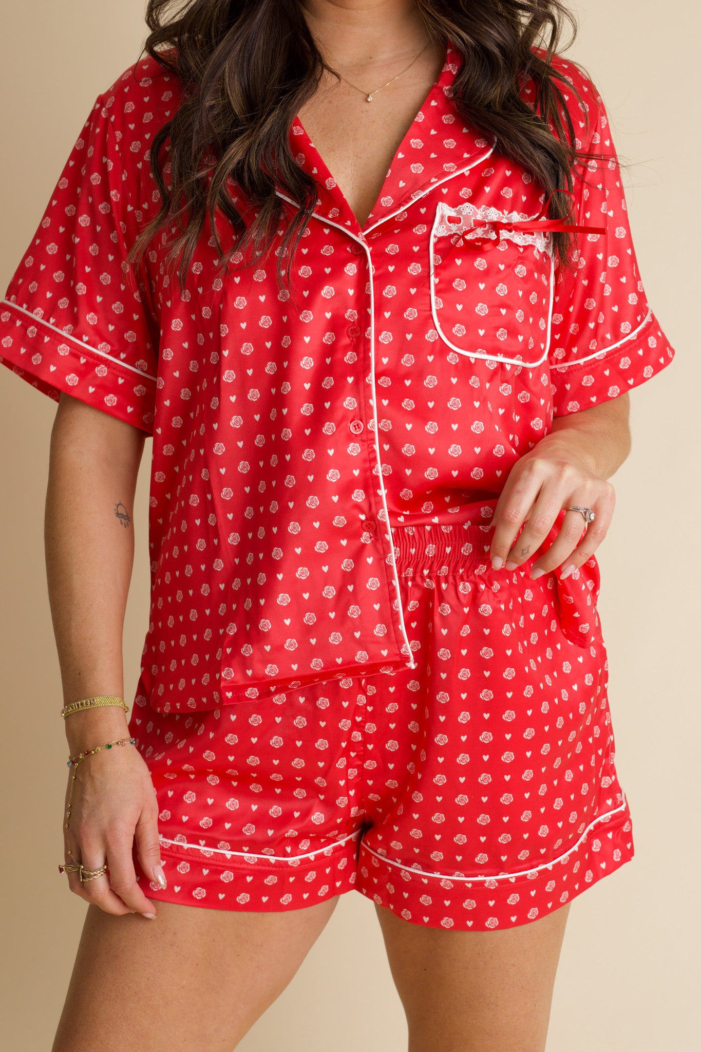 Indulge in the sweet luxury of our Satin Rose Pajama Set. This red satin set features a delicate white rose and heart print, with a button down top that has a charming lace-trimmed pocket. The high-waisted shorts with a coordinating white trim are both comfortable and stylish. Sweet dreams await! Limited stock and available in sizes small through large!