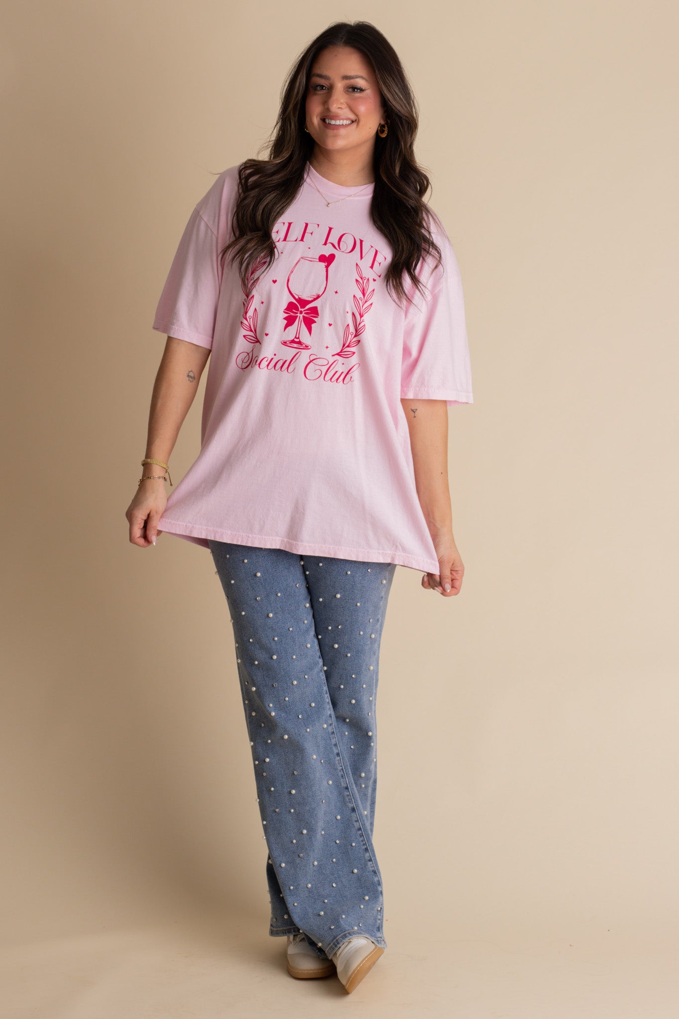 Join the Self Love Social Club with this playful tee! Screen printed in-house on a cozy pink comfort colors tee, rock the red graphic featuring a wine glass and the Self Love Social Club logo. Because self love and wine go hand in hand!  Limited stock and available in sizes small through 3XL!