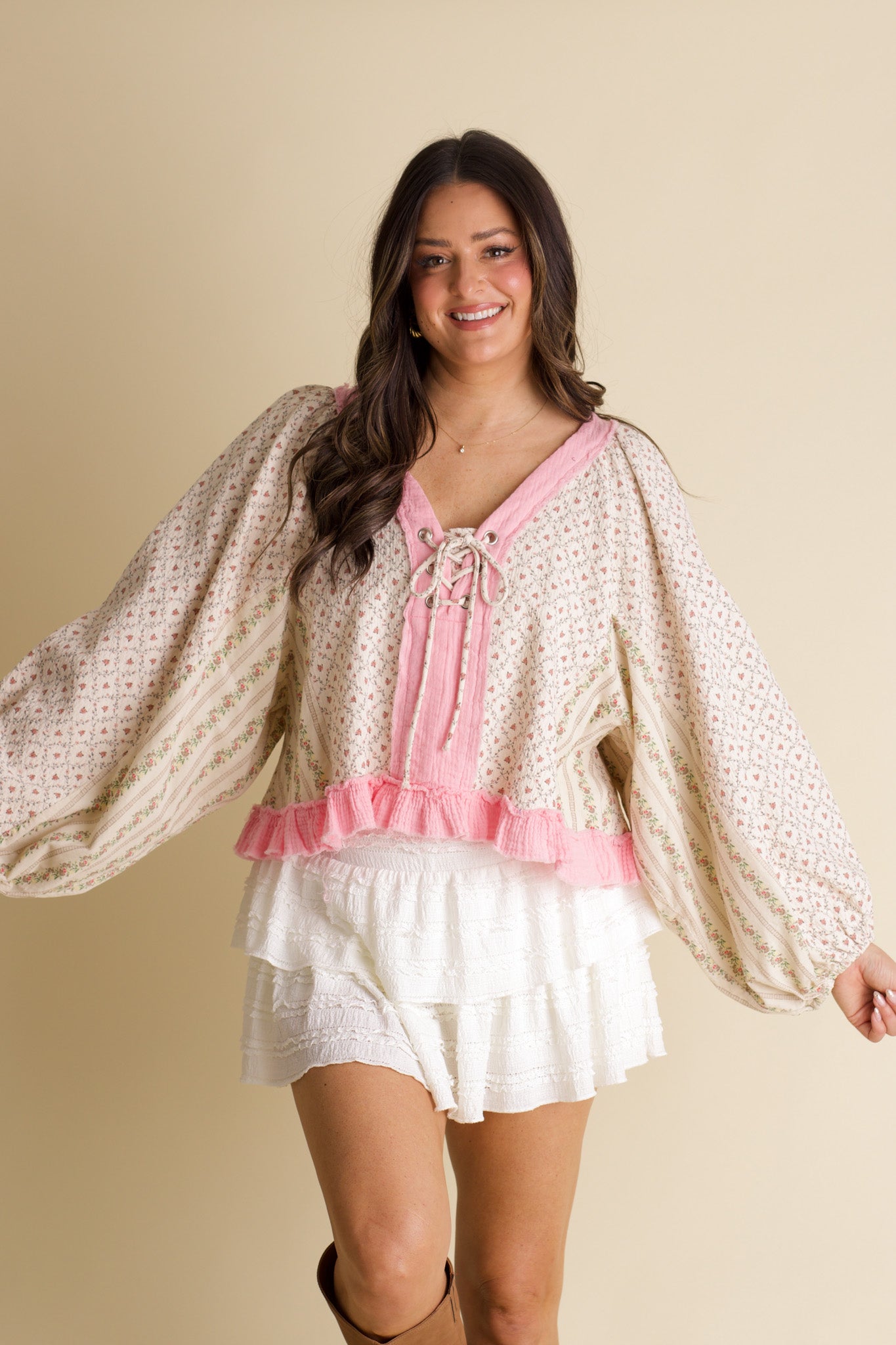 Embrace a whimsical vibe with the Spread Love V Neck Top. Crafted from soft cotton gauze in dreamy pink and cream florals, it features a flirty laced-up tie front, playful balloon sleeves cinched at the wrist, and a charming ruffled hem. Its boxy fit makes it effortlessly breezy and fun—perfect for brightening any day with a touch of sweet, carefree style. Limited stock and available in 2 color options and sizes small through large!