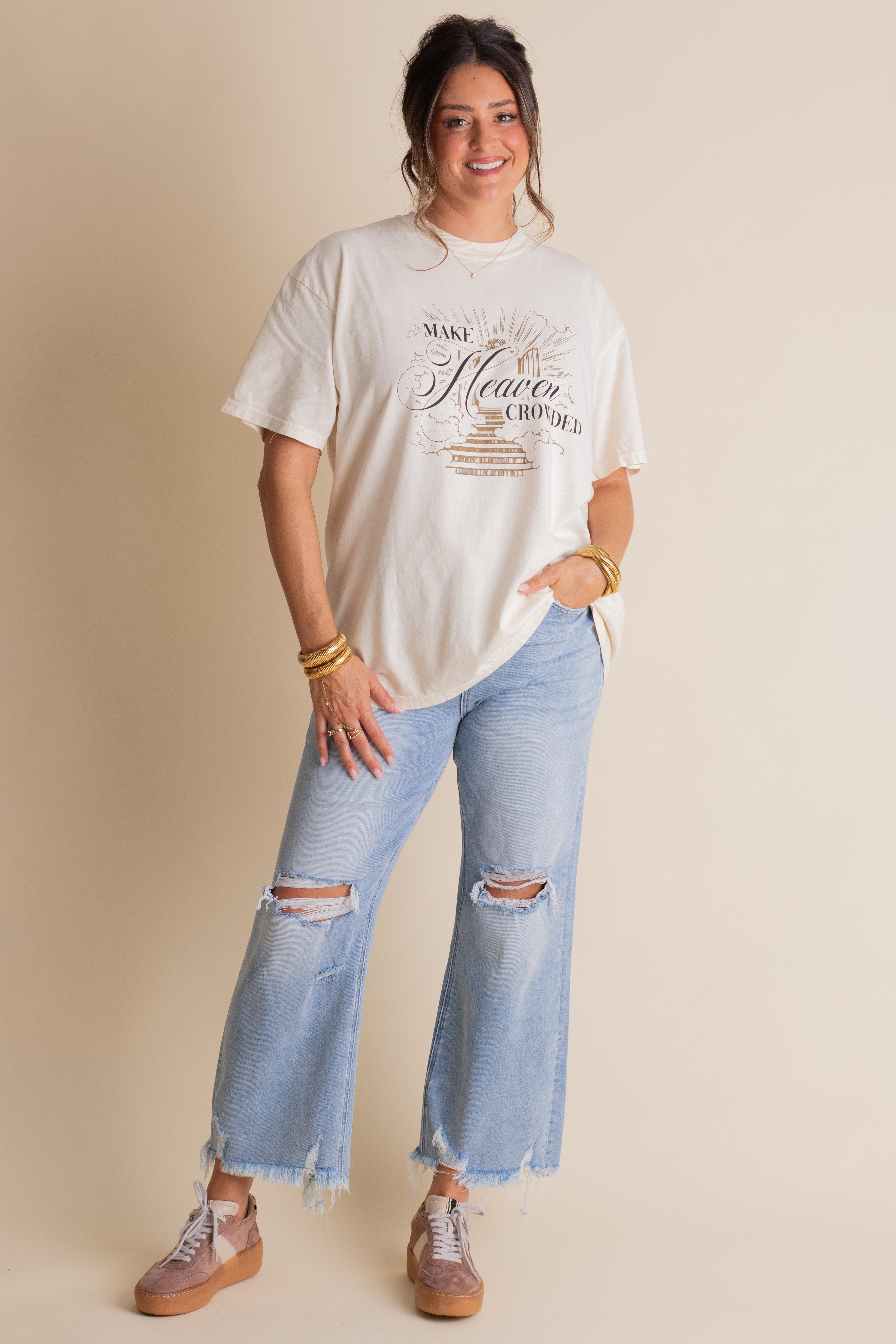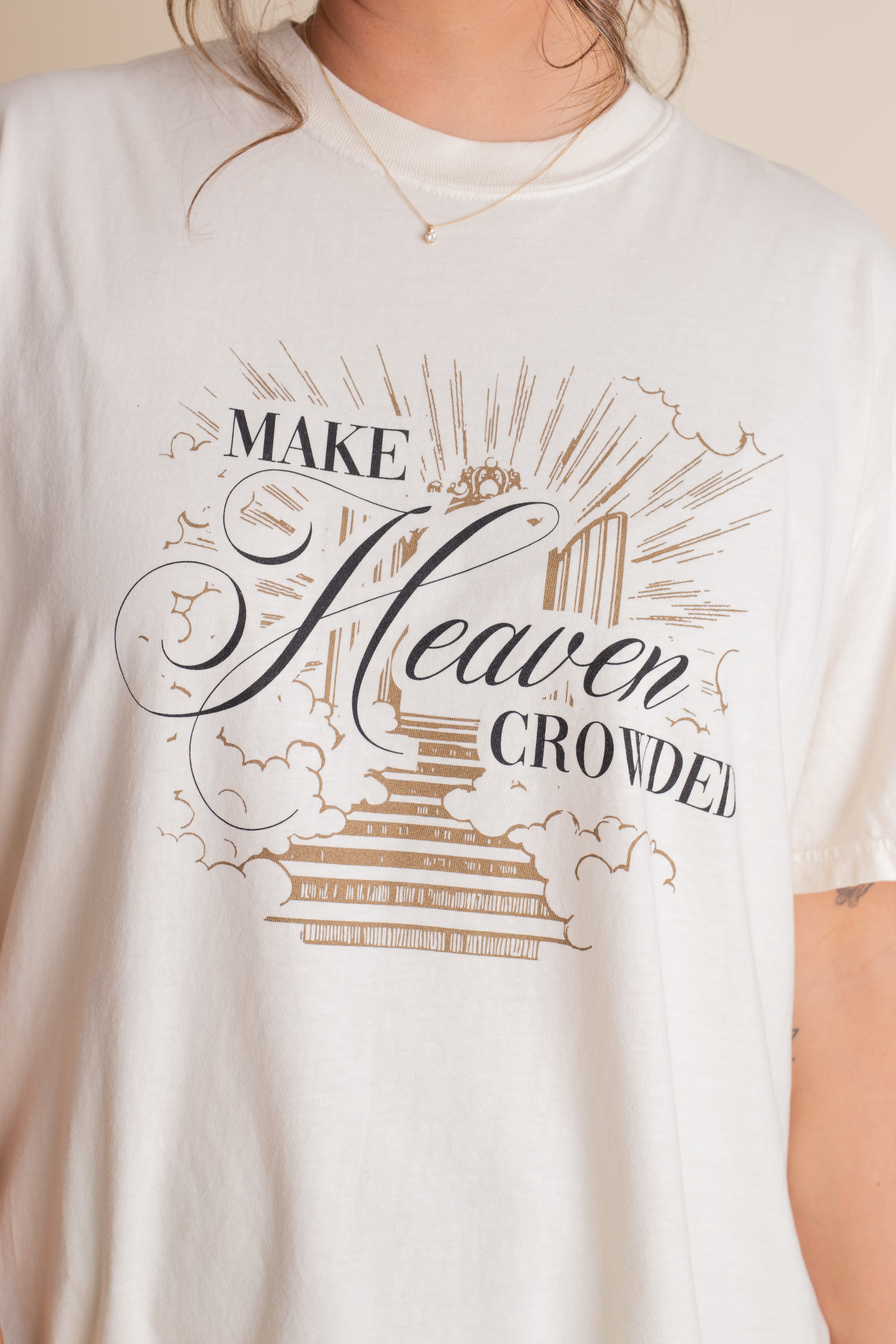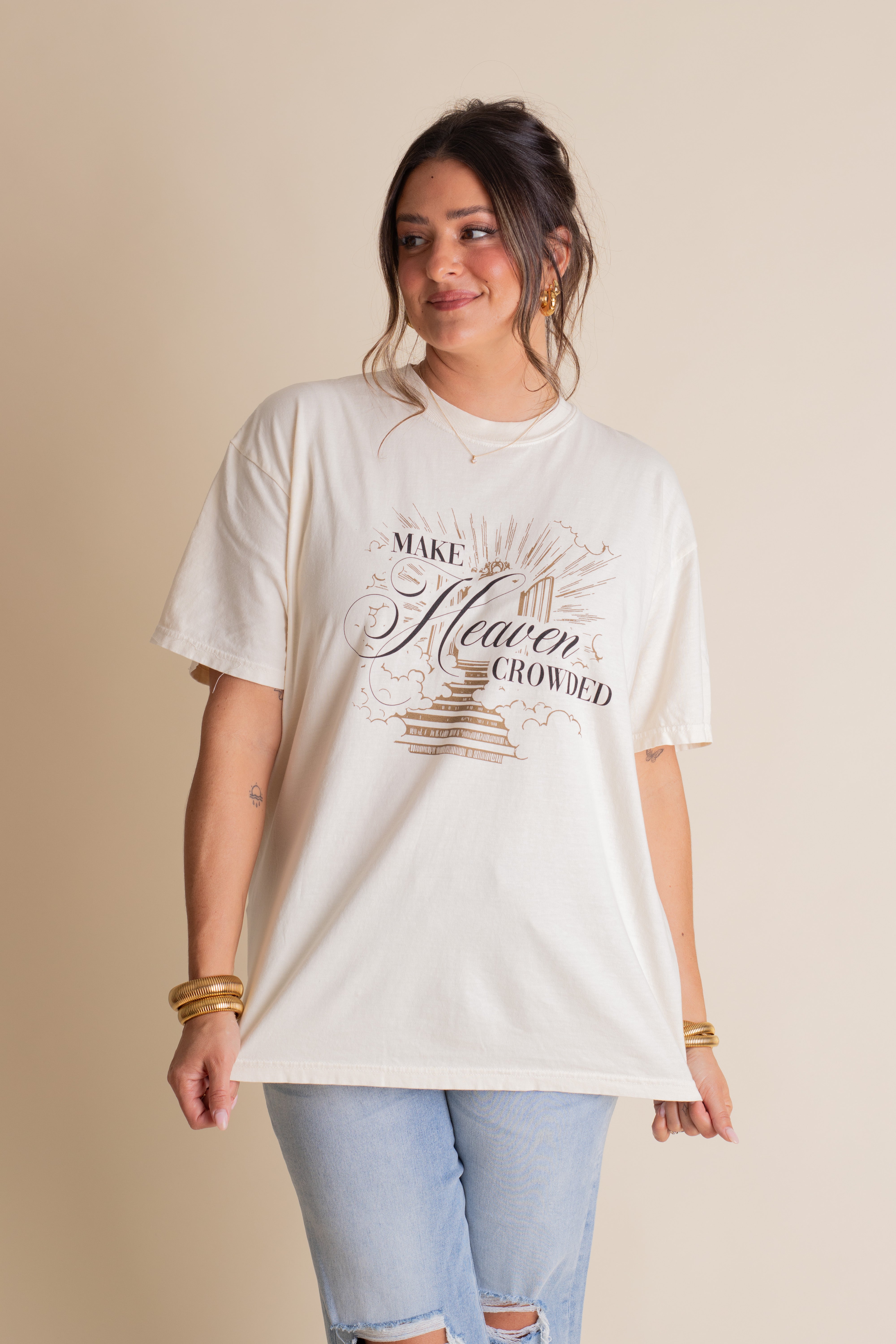 This playful "Make Heaven Crowded" tee features a cozy ivory Comfort Colors fabric screen printed in-house with a bold brown and black graphic. Perfect for spreading good vibes while staying comfy and stylish!