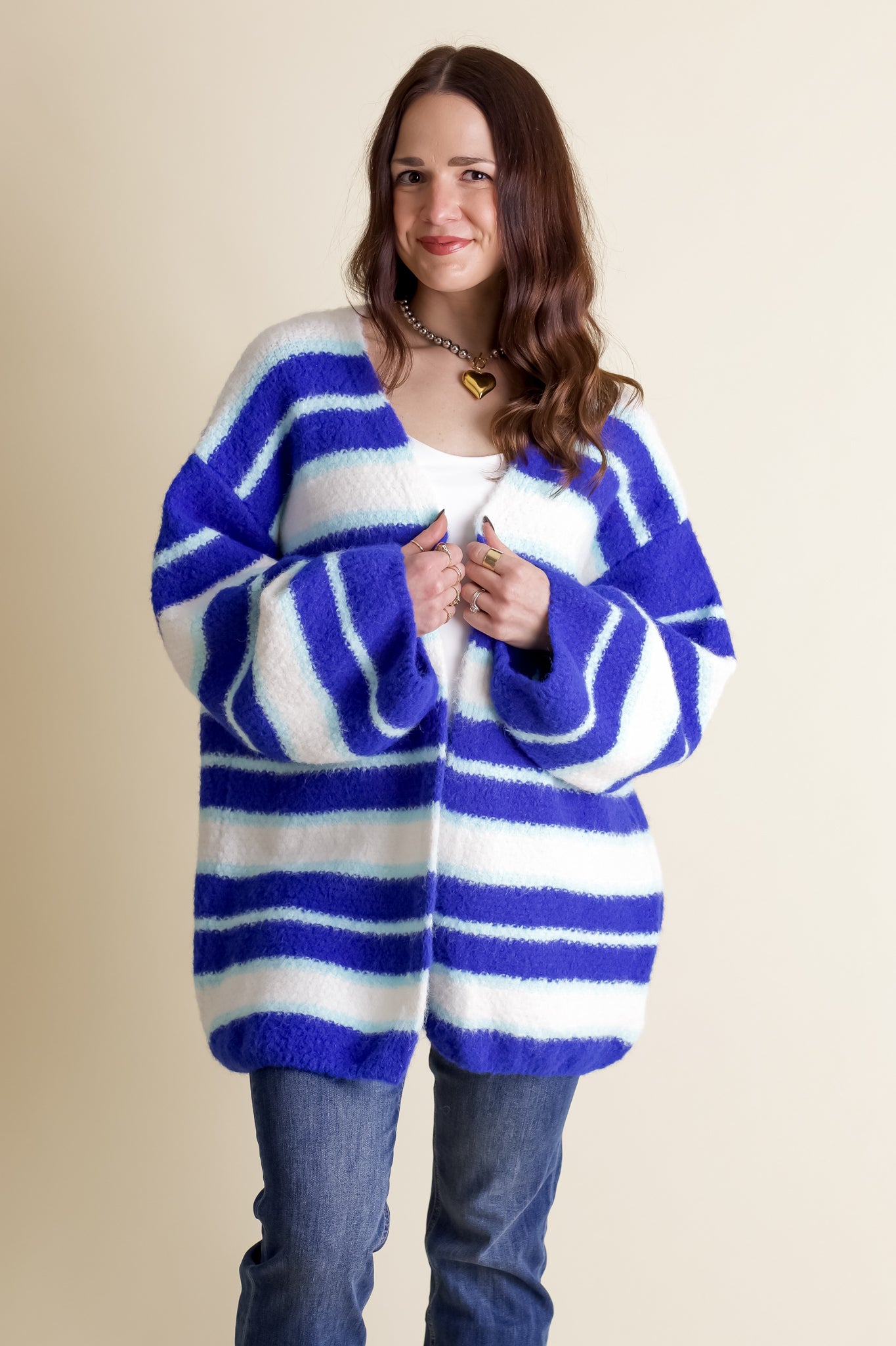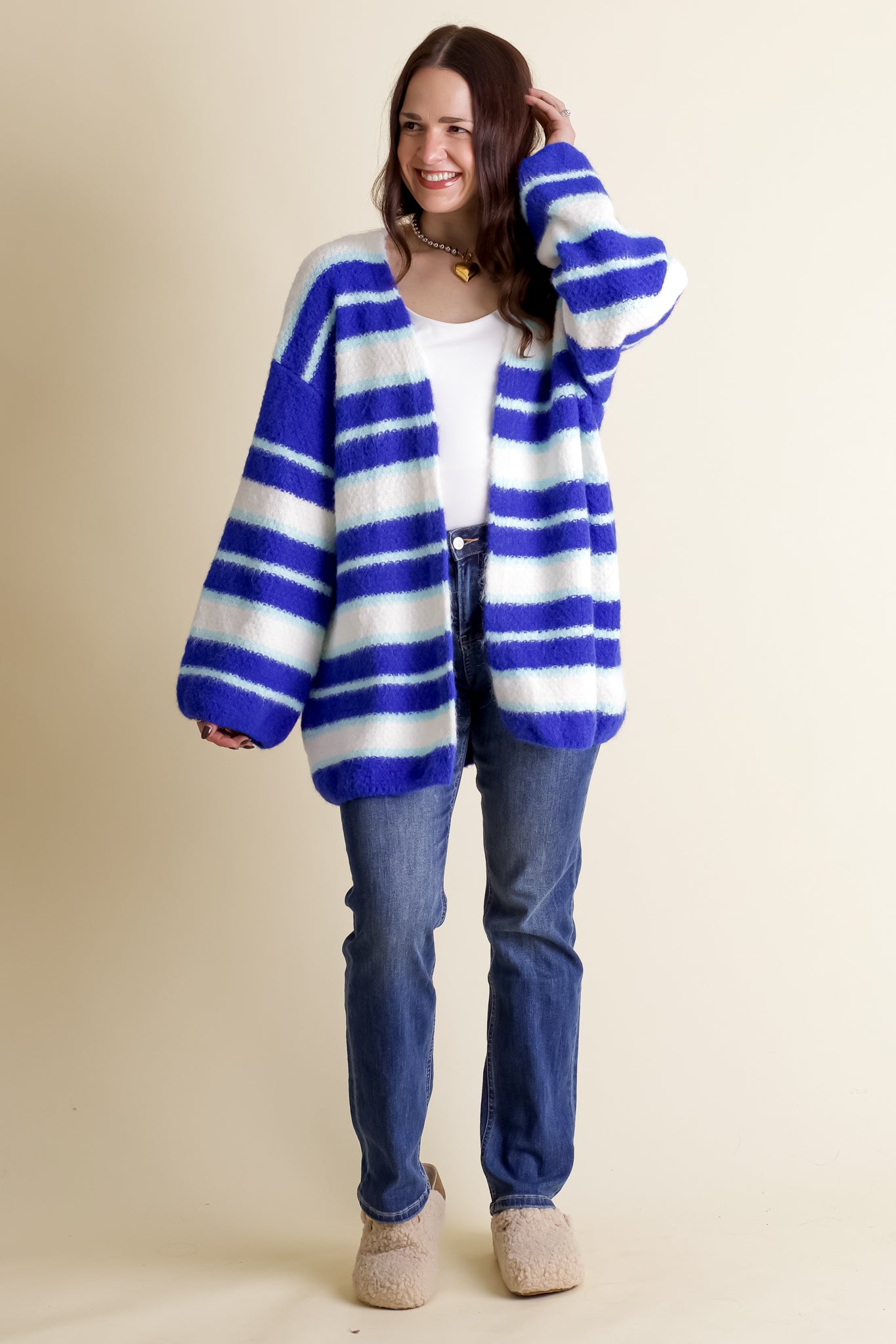 Wrap yourself in cozy charm with the Mountain Views Striped Cardigan. Featuring playful balloon sleeves and an oversized fit, this royal blue, light blue, and white striped cardigan adds a fun twist to your layering game. Its open front design makes it easy to throw on for a breezy day or a relaxed evening, keeping you comfy and stylish wherever your adventures take you. Limited stock and available in sizes small through large!