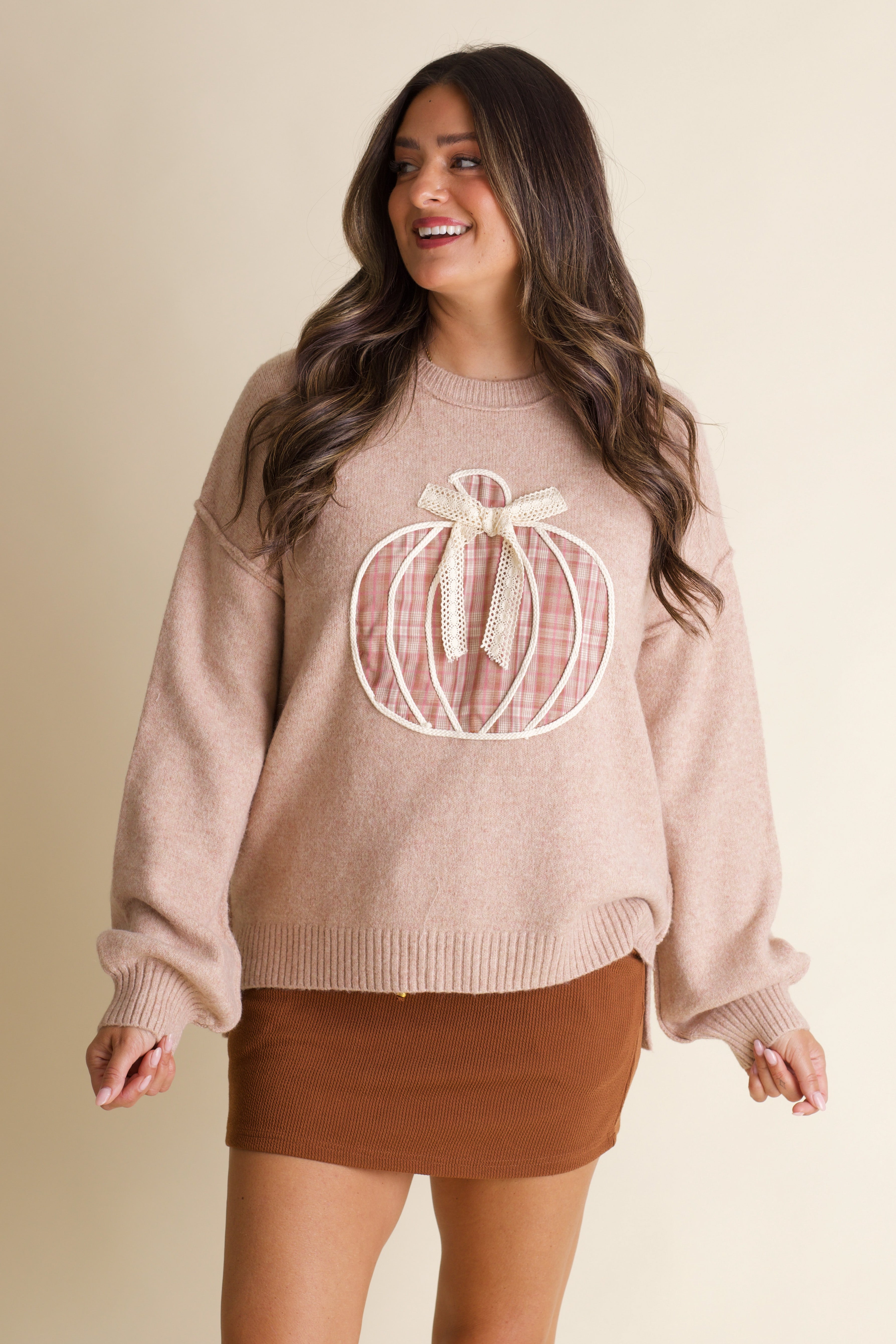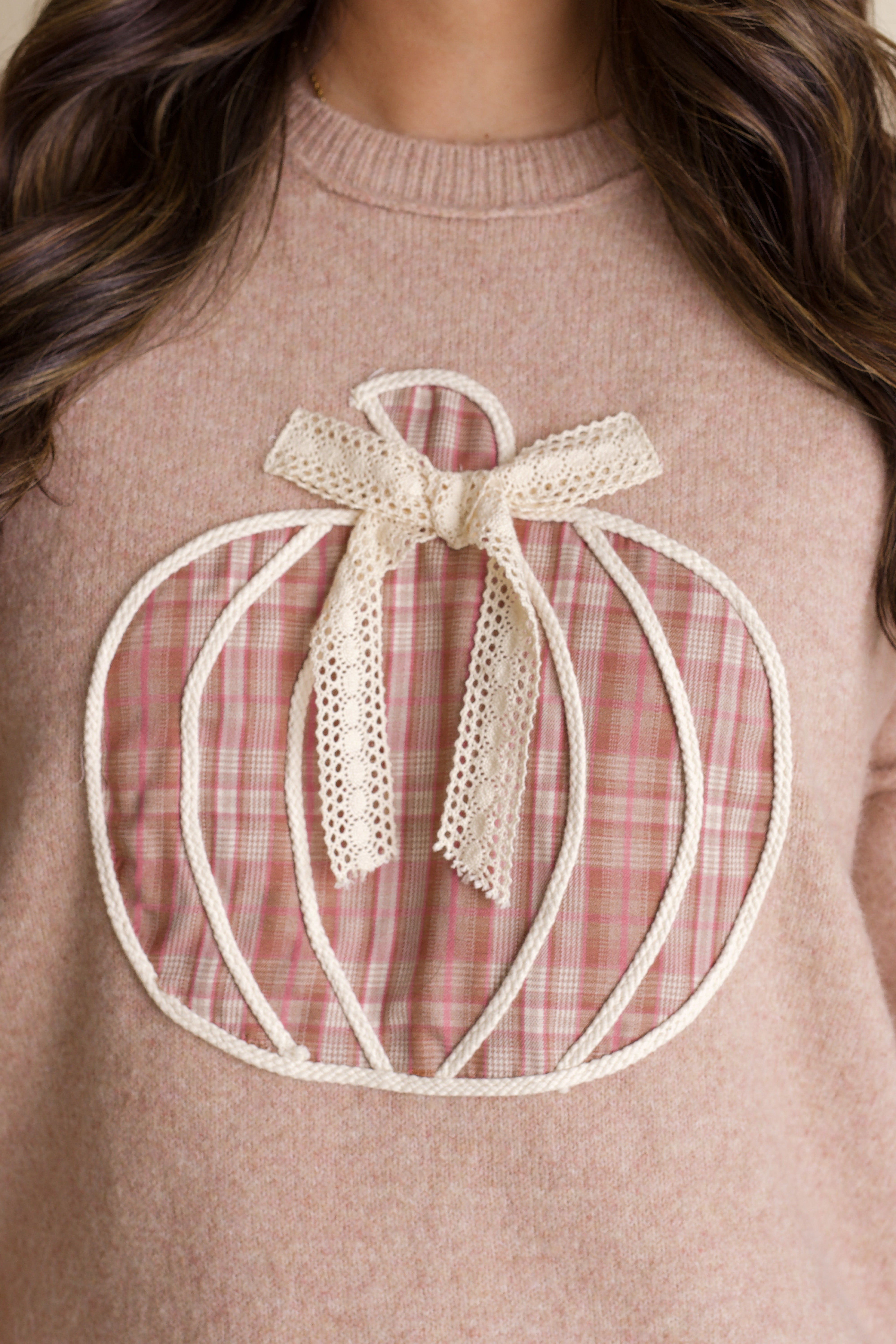 Stay snug and stylish in the Perfect Pumpkin Round Neck Sweater, featuring a charming embroidered plaid pumpkin accented with braided trim and a delicate crochet bow. Its playful balloon sleeves and reverse stitching add cozy character, while the ribbed trim ensures a comfy fit. Perfect for crisp autumn days and festive vibes! Limited stock and available in sizes small through large!