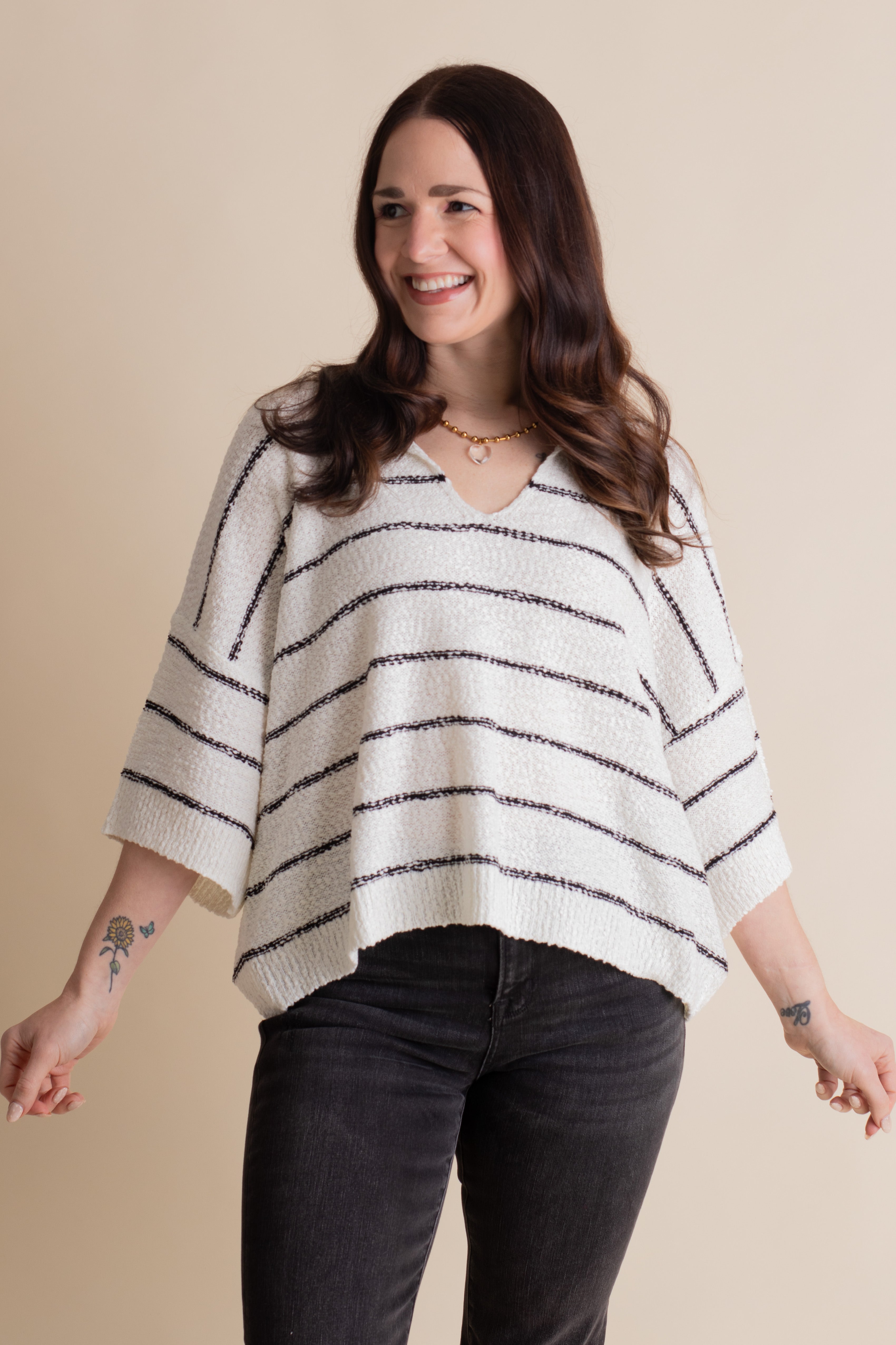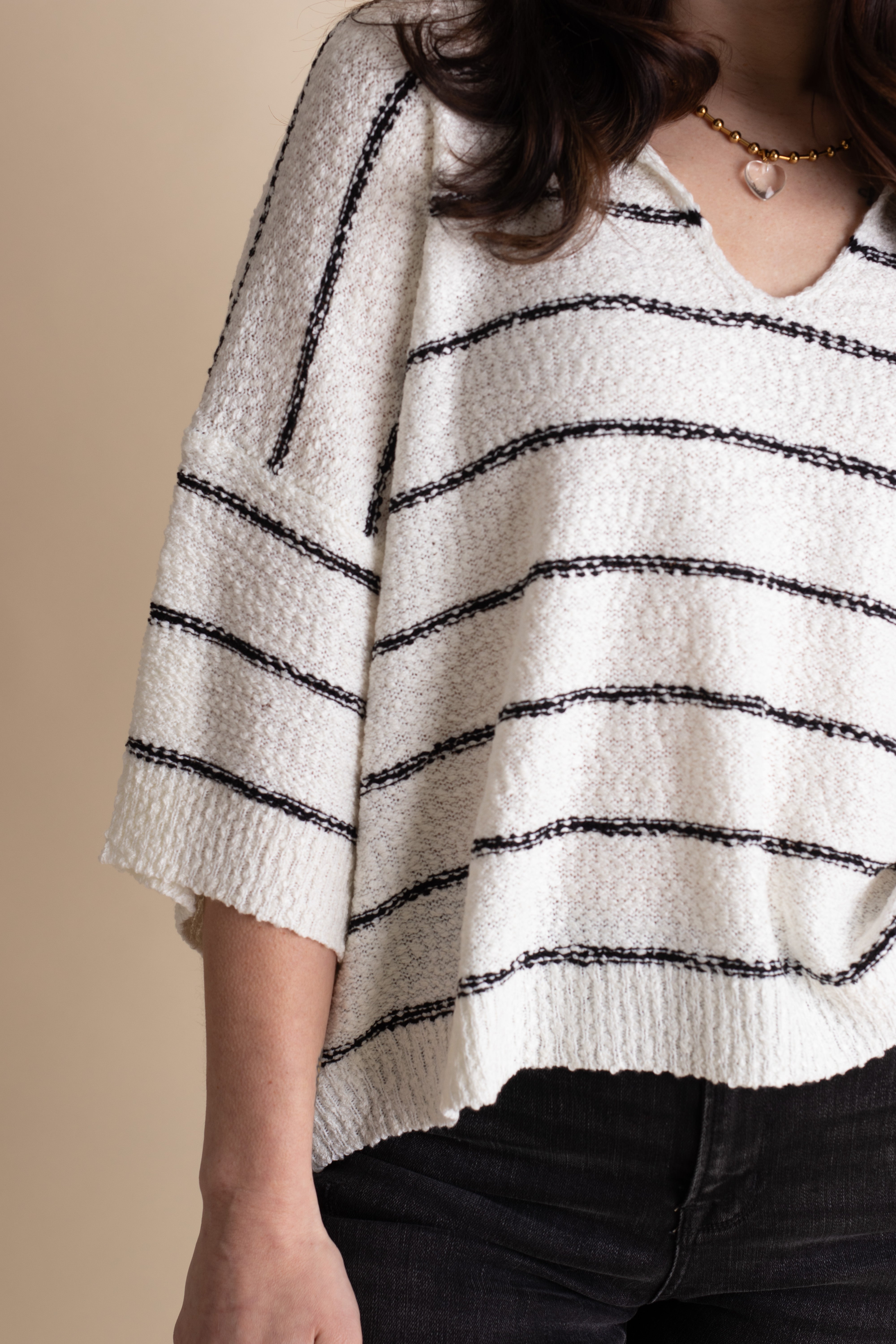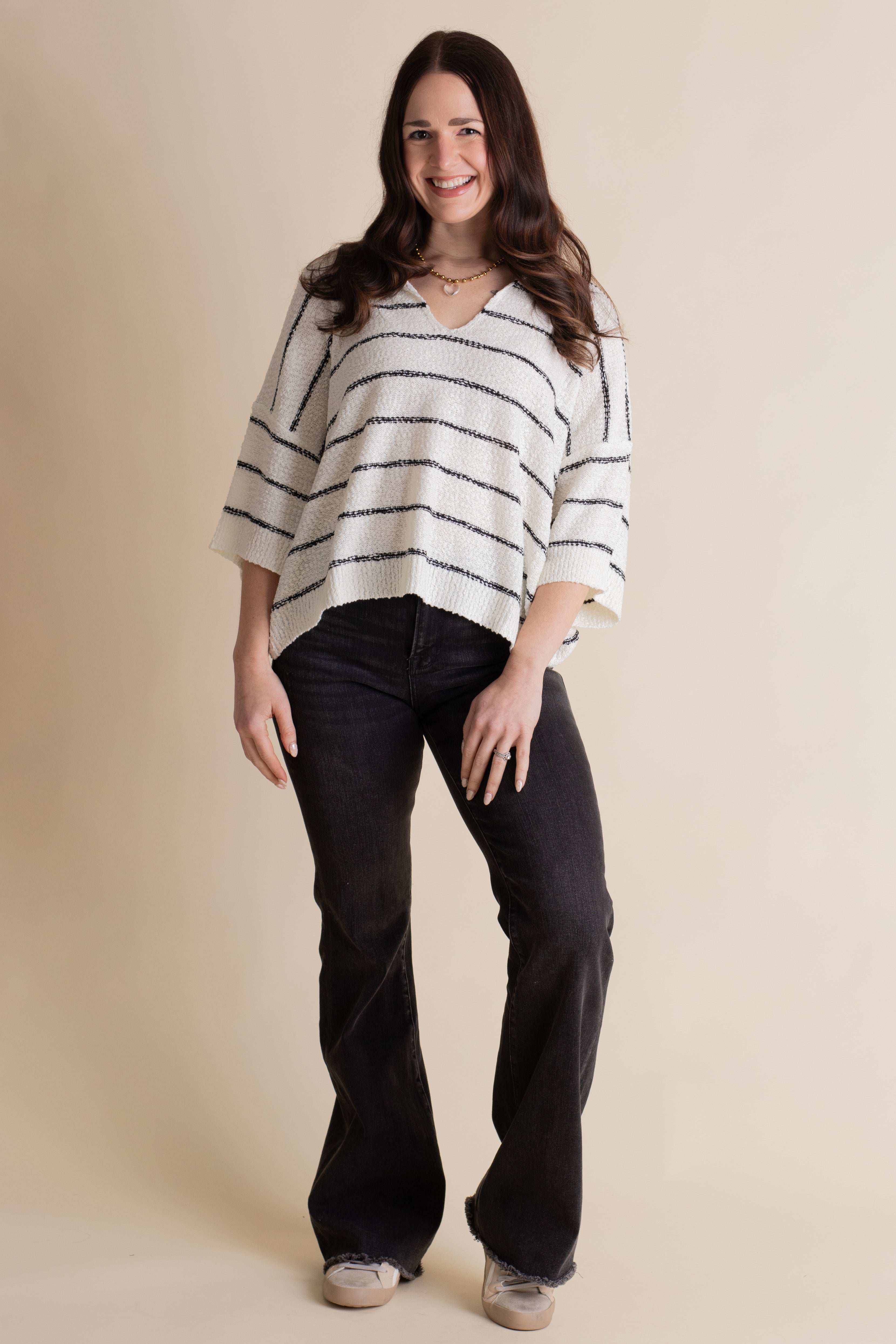 Stay effortlessly cool in the Quick Trip V Neck Top, featuring playful black and white stripes and a textured, lightweight fabric. Its comfy boxy fit and flattering V-neck make it your go-to for relaxed days or layering fun. Perfect for wherever your quick trip takes you! Limited stock and available in sizes small through large!