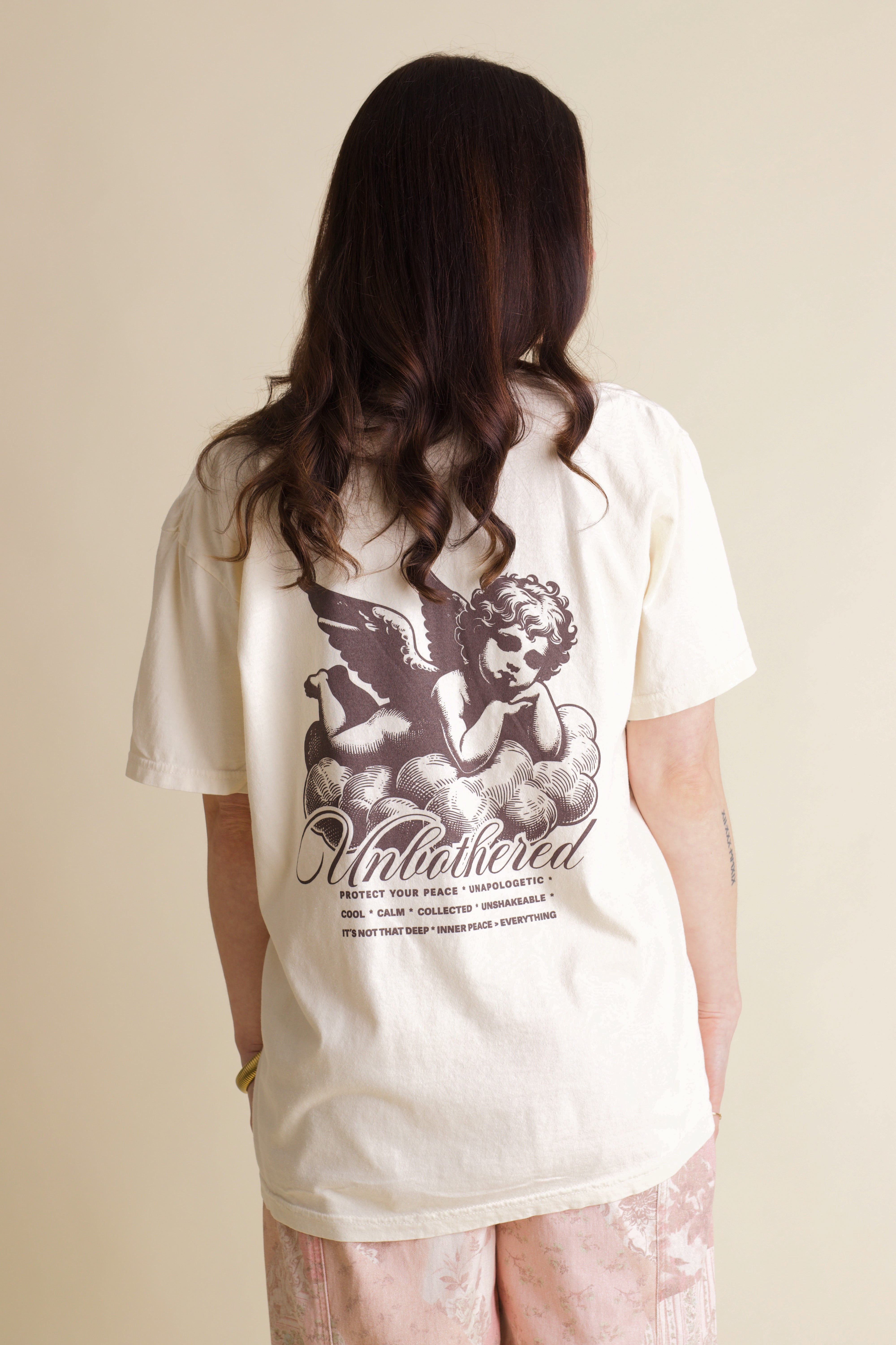 Stay cool and collected in the Unbothered Tee, printed on a soft ivory Comfort Colors fabric for ultimate comfort. The front features a bold brown "Unbothered" graphic, while the back showcases a charming cherub with uplifting reminders like "protect your peace" and "inner peace > everything." Perfect for anyone who’s unapologetically calm, confident, and not sweating the small stuff.