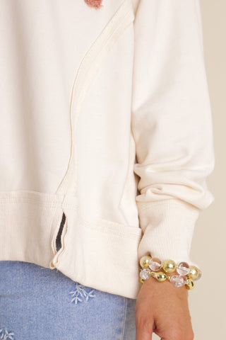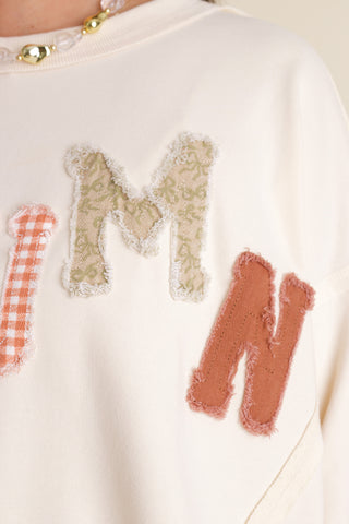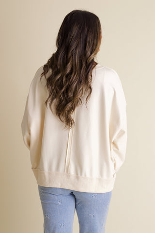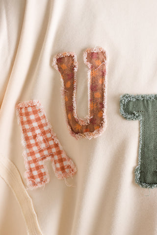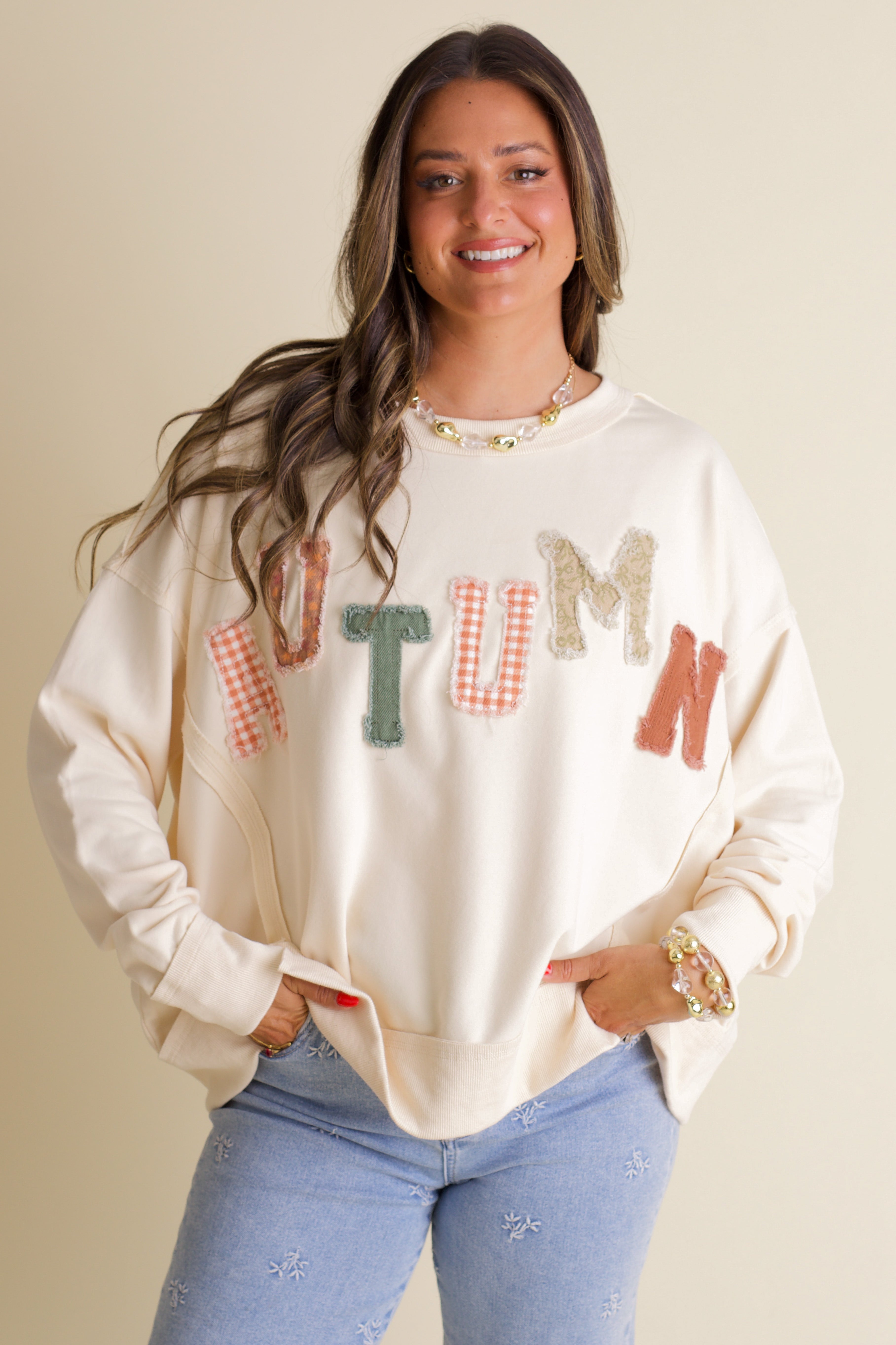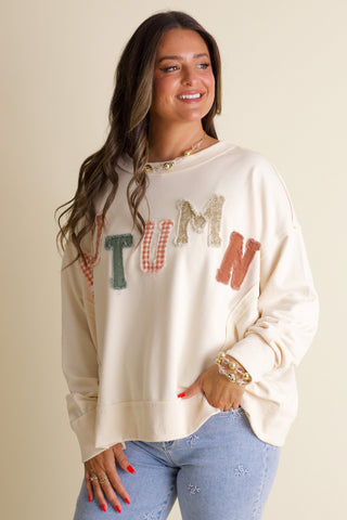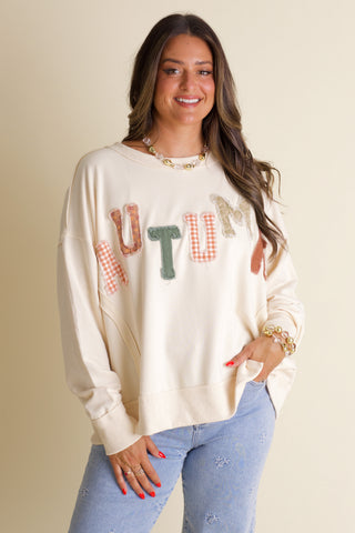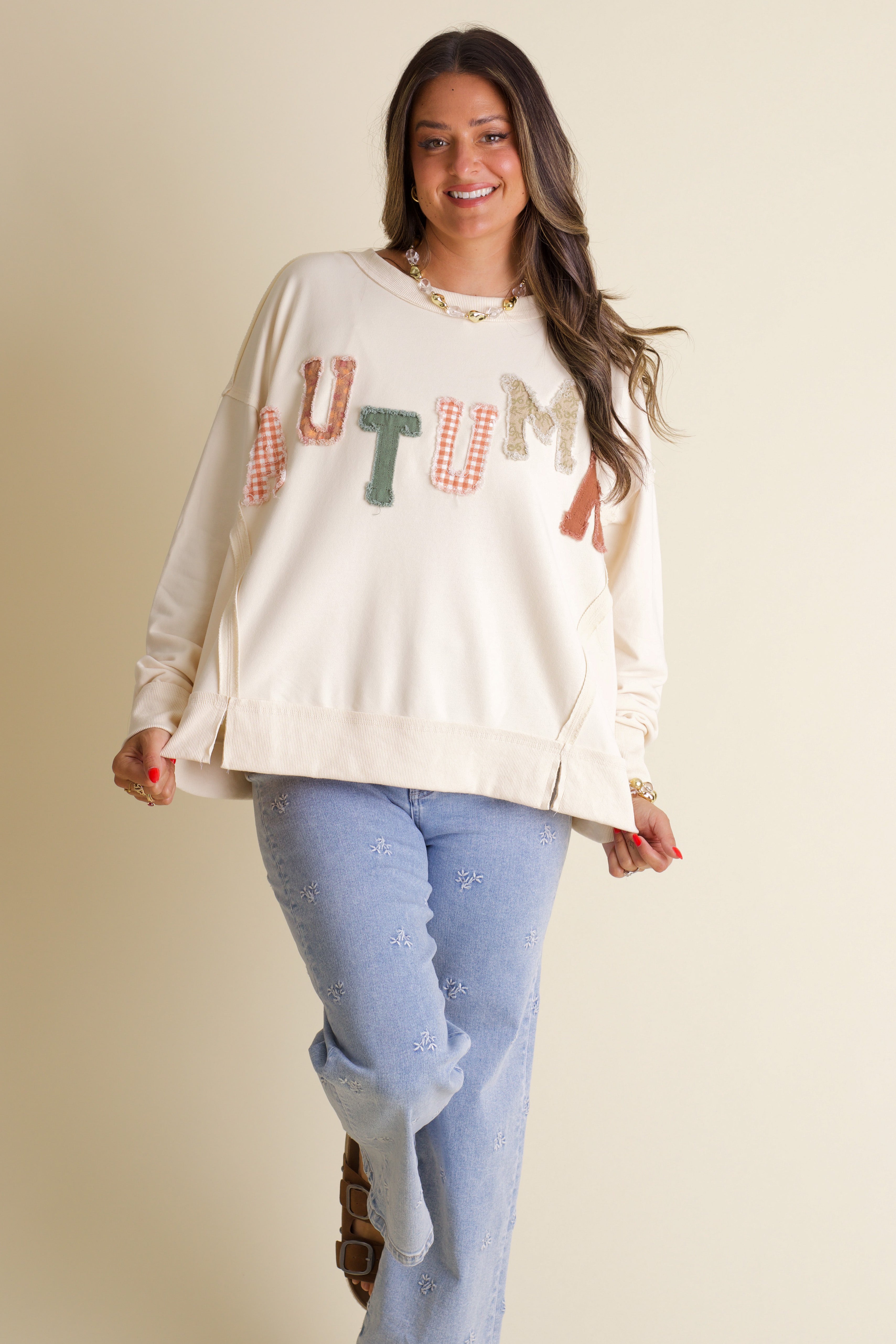 Embrace the cozy vibes with this oversized Terry knit sweatshirt, featuring a fun fall-inspired Autumn patch on the front. Its raw edge seams and dolman sleeves add a relaxed, playful touch, while front slits keep you comfy and stylish all season long. Perfect for layering up and celebrating sweater weather! Limited stock and available in sizes small through large!